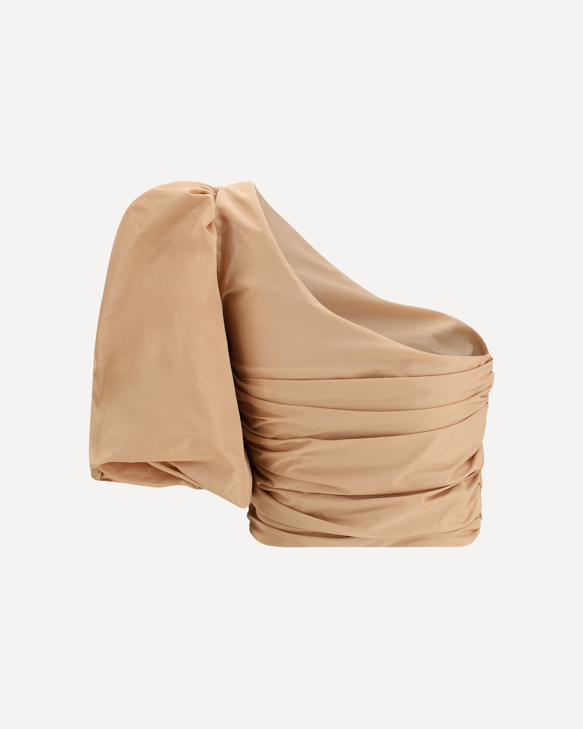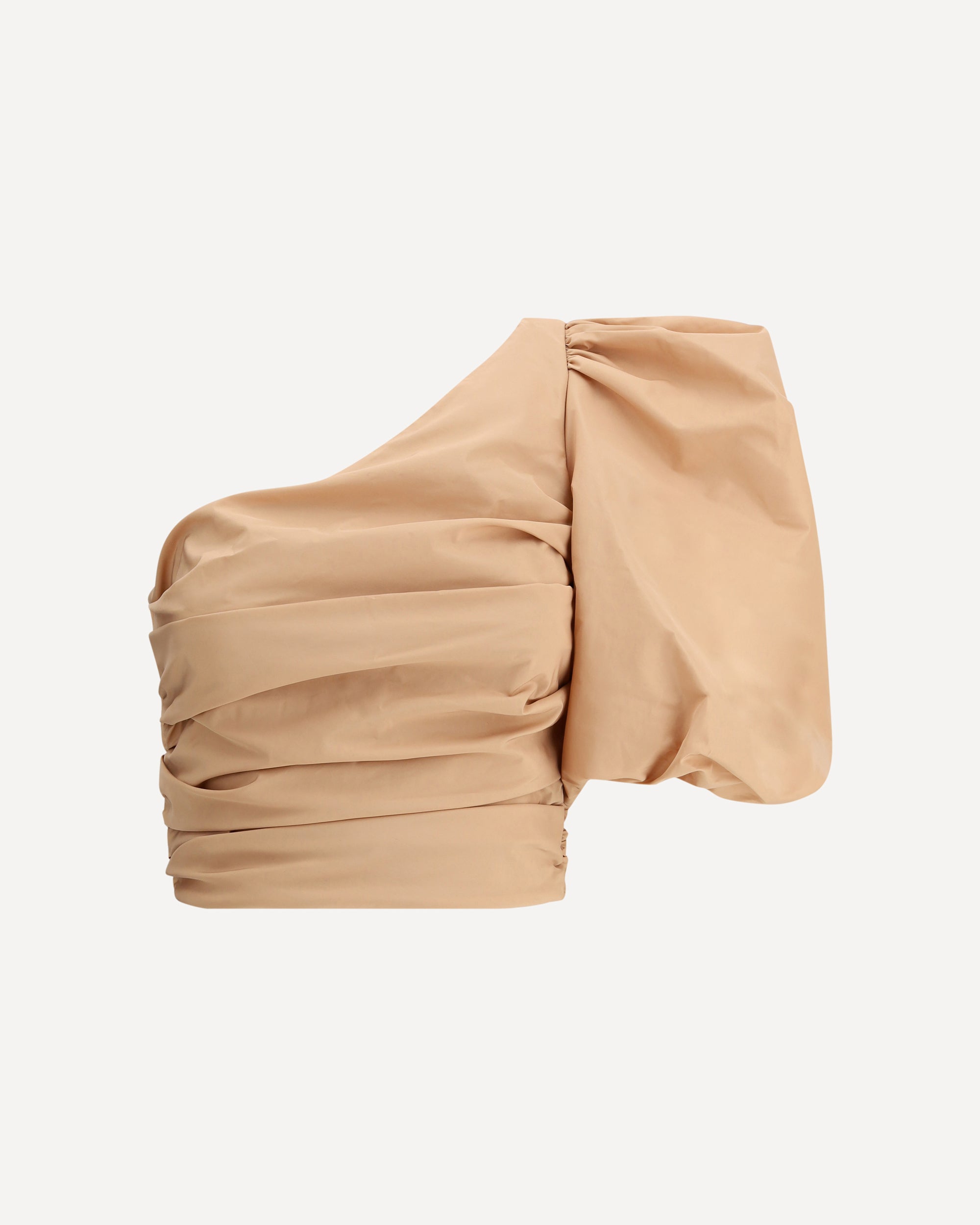 The Pinko One-Shoulder Top is a bold and sophisticated piece, perfect for special occasions or elegant evenings. The cropped model and the gathered effect add a touch of dynamism and modernity, while the balloon one-shoulder creates a unique and feminine silhouette. The side zip closure ensures a perfect fit, while the innovative design and asymmetrical cut make it a piece with great visual impact.