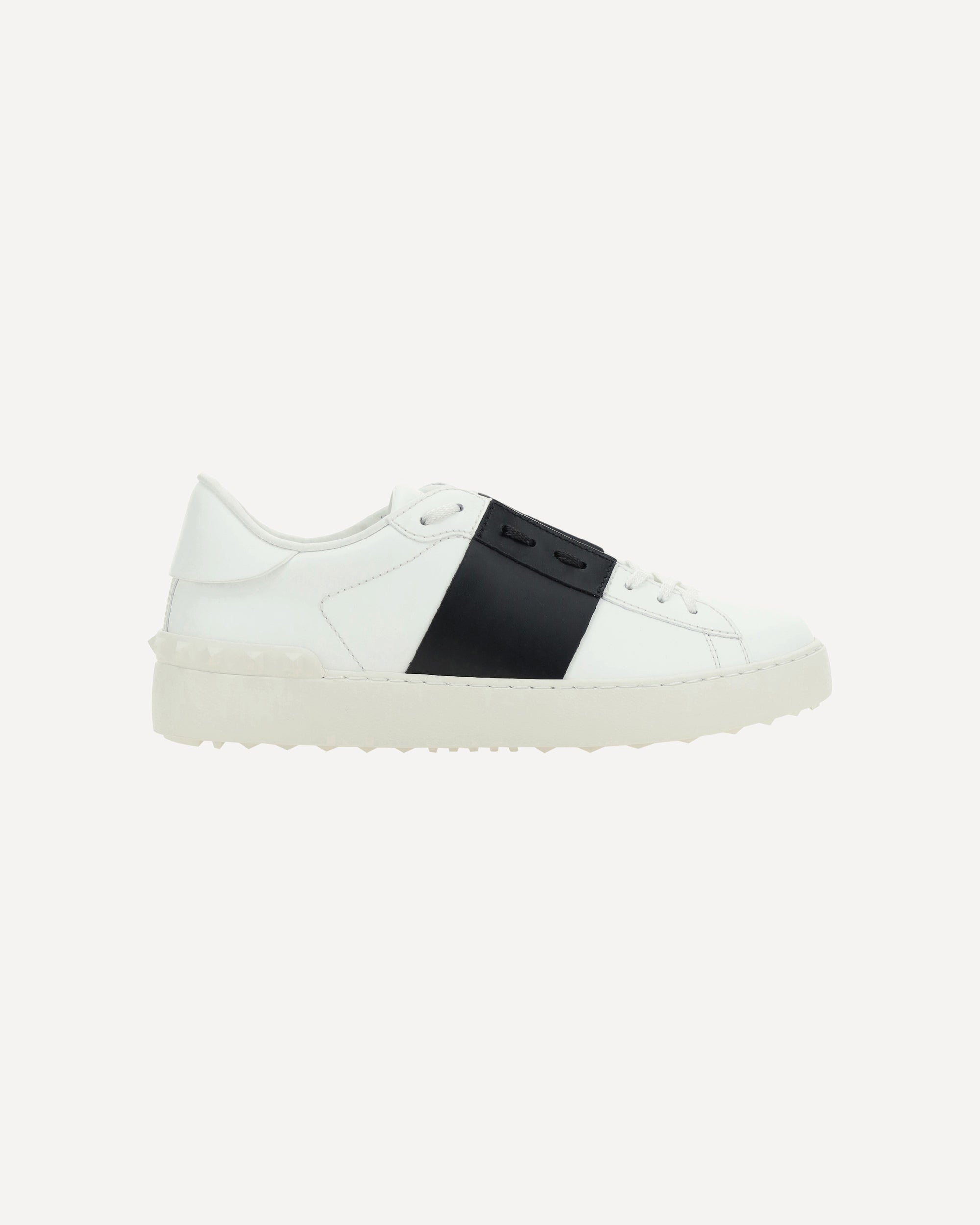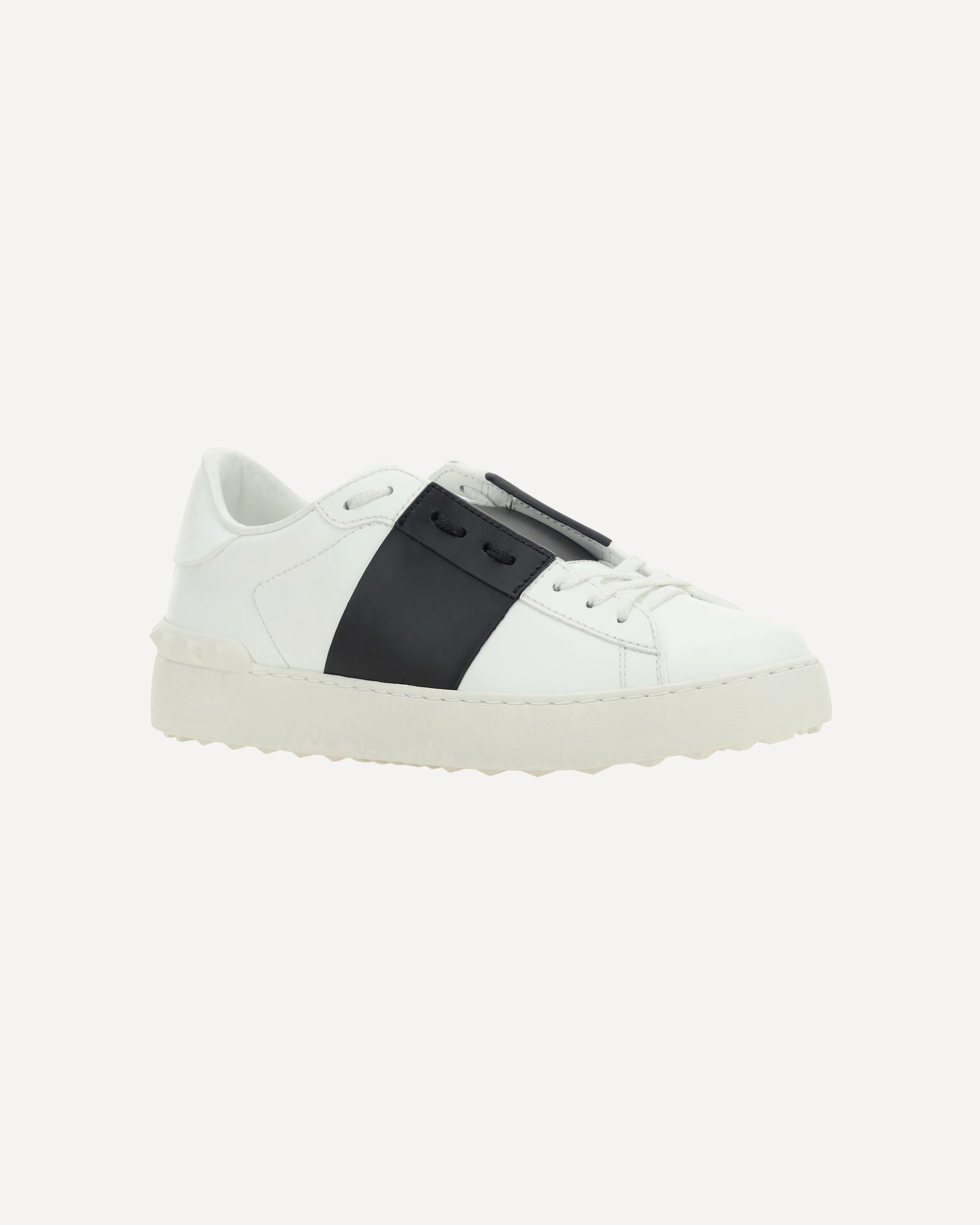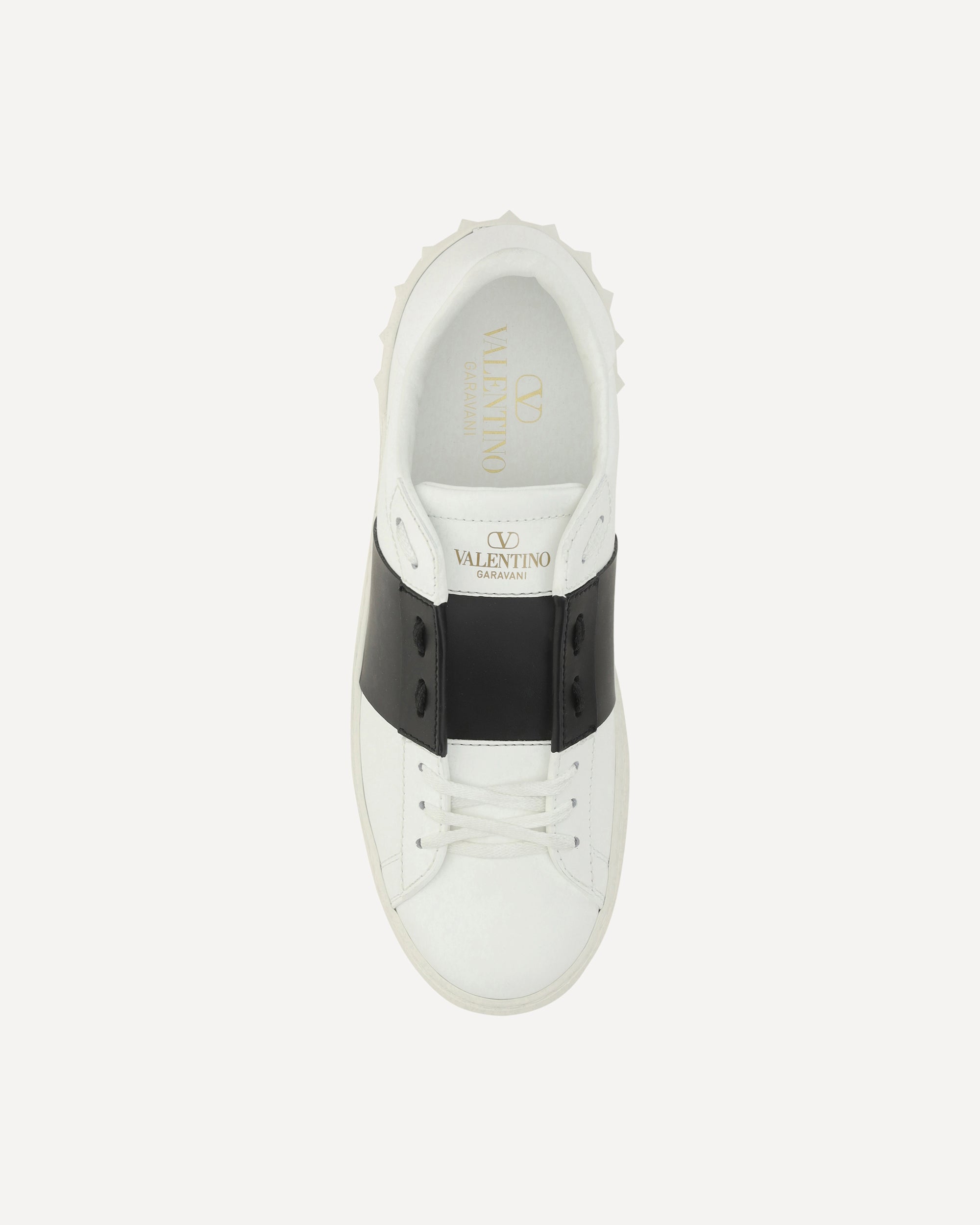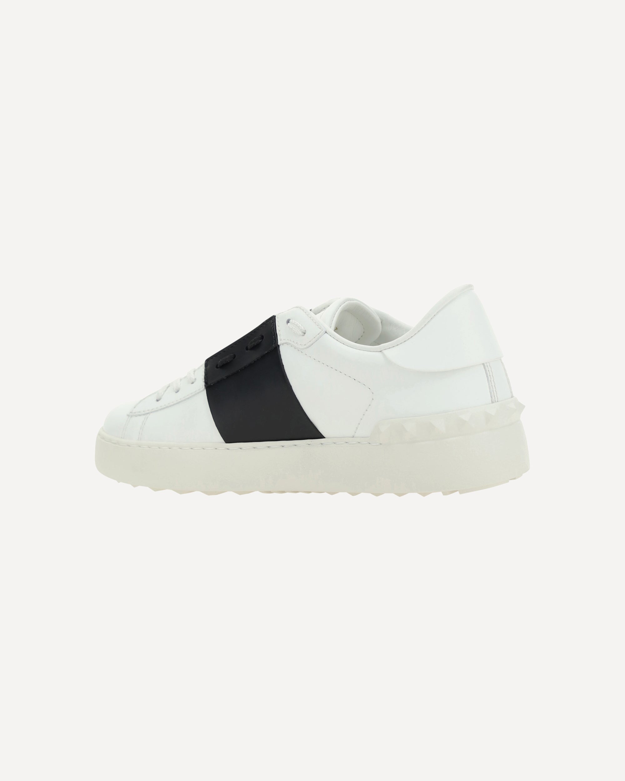Valentino Garavani's Leather Open Sneakers are a lace-free slip-on style with a round toe and a contrasting band on the side panels. The knurled sole ensures grip and stability, while the front tongue is decorated with a contrasting logo label. The iconic Rockstud studs are applied on the perimeter of the heel, adding a touch of character. A perfect blend of comfort and bold style.
