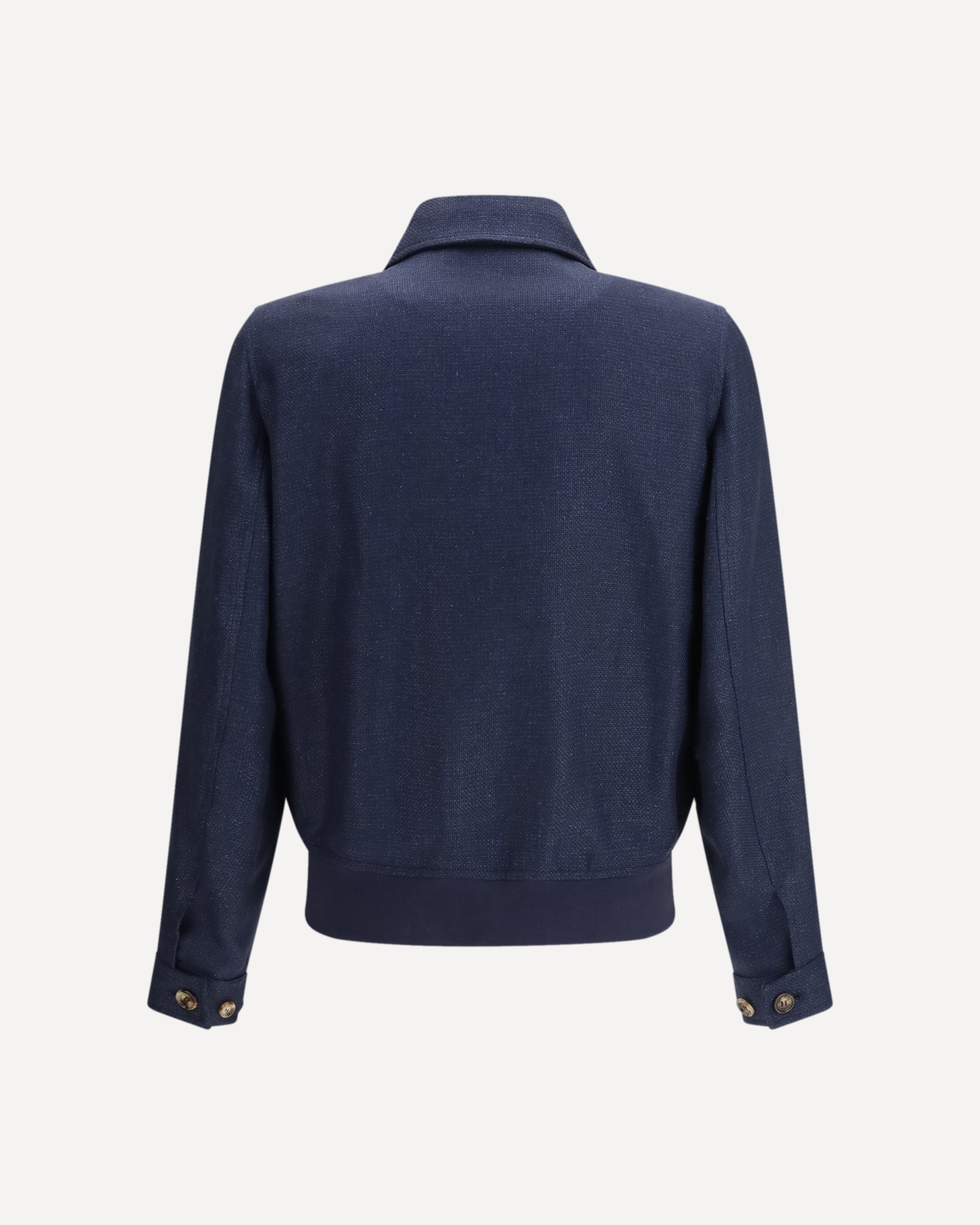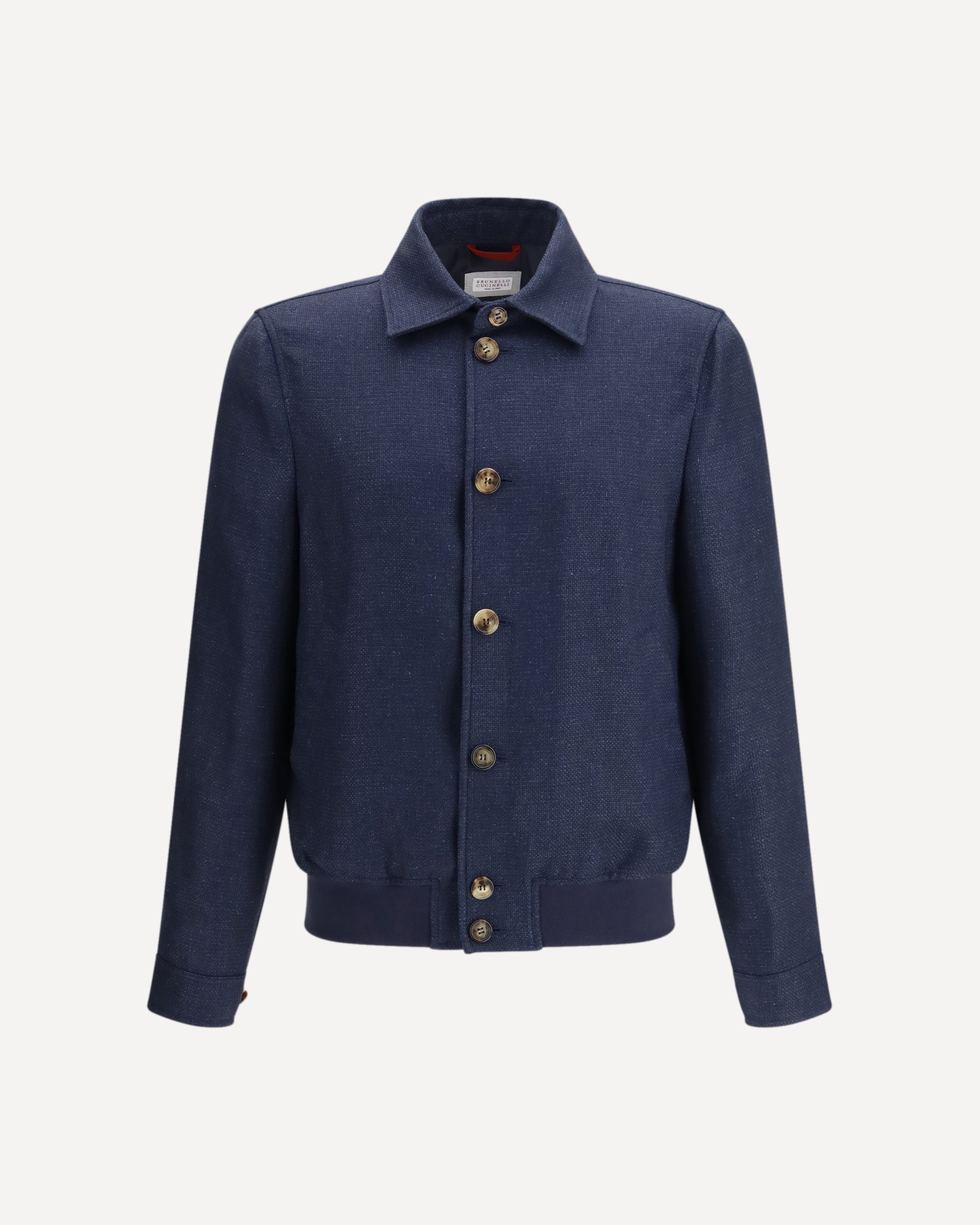 The silk, linen and wool hopsack Jacket by Brunello Cucinelli blends sartorial inspiration with modern versatility. The open hopsack weave lends lightness and breathability, while the combination of silk and wool brings a fluid, refined hand feel, enhanced by the subtle slub effect of linen for added texture. Designed with a college-style fit, it softly wraps the silhouette with relaxed, comfortable volumes. Details include a horn-button fastening, shirt-style collar, buttoned cuffs, and lower pockets with snap buttons. A partial cupro lining and practical inner pockets complete the interior, while the rib-knit hem adds a casual yet polished finish to this contemporary outerwear piece.
