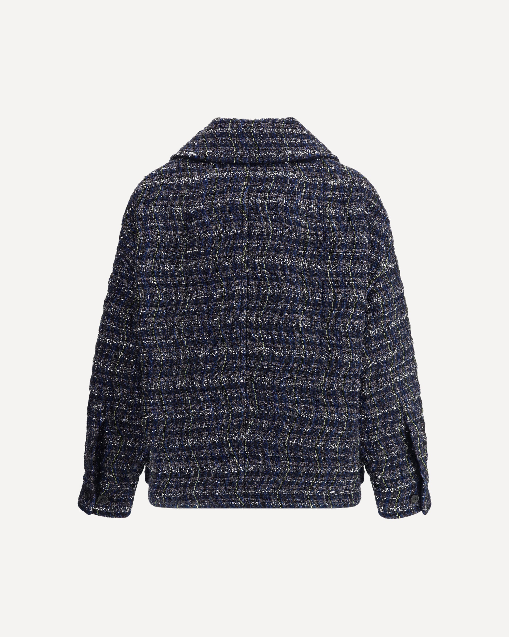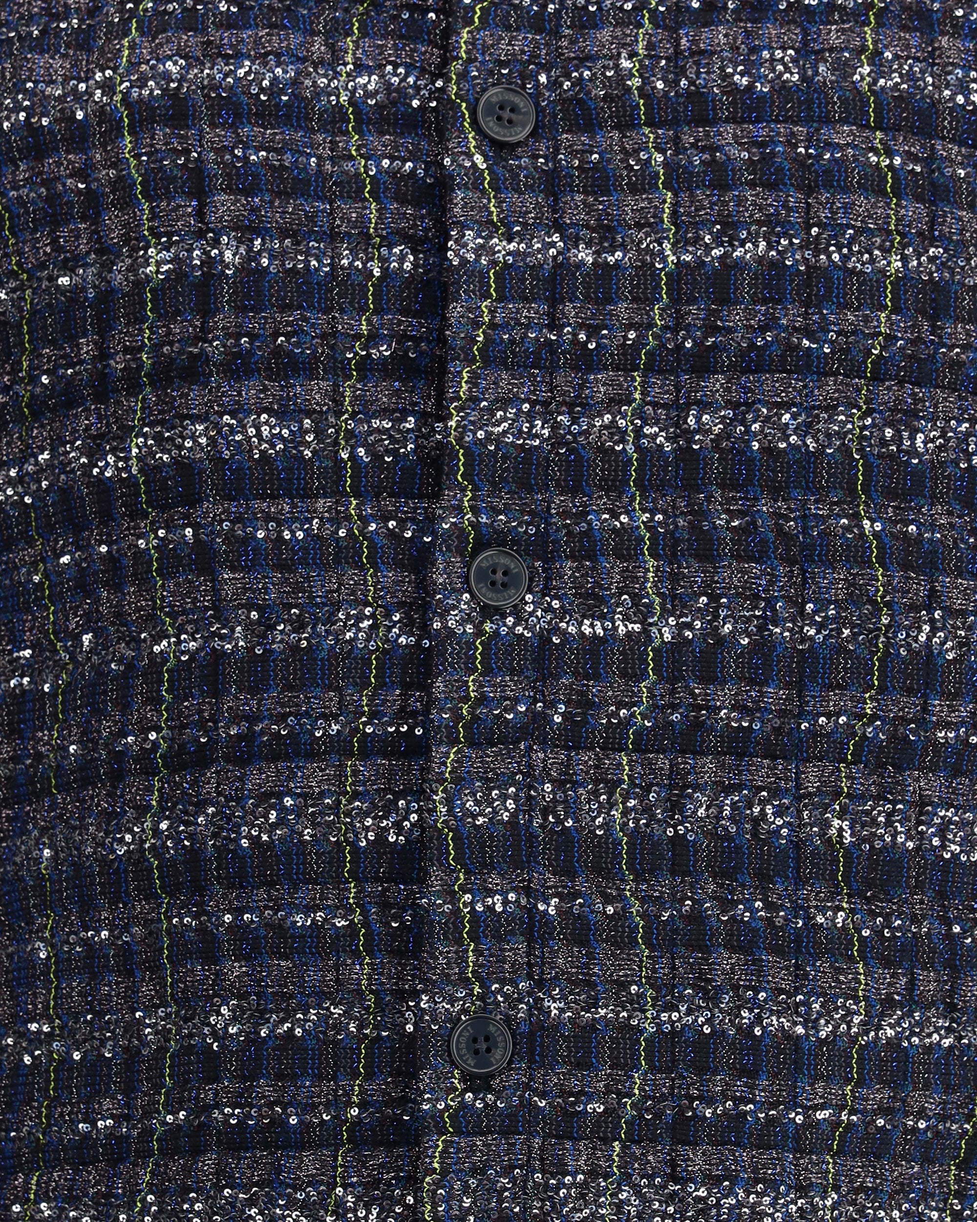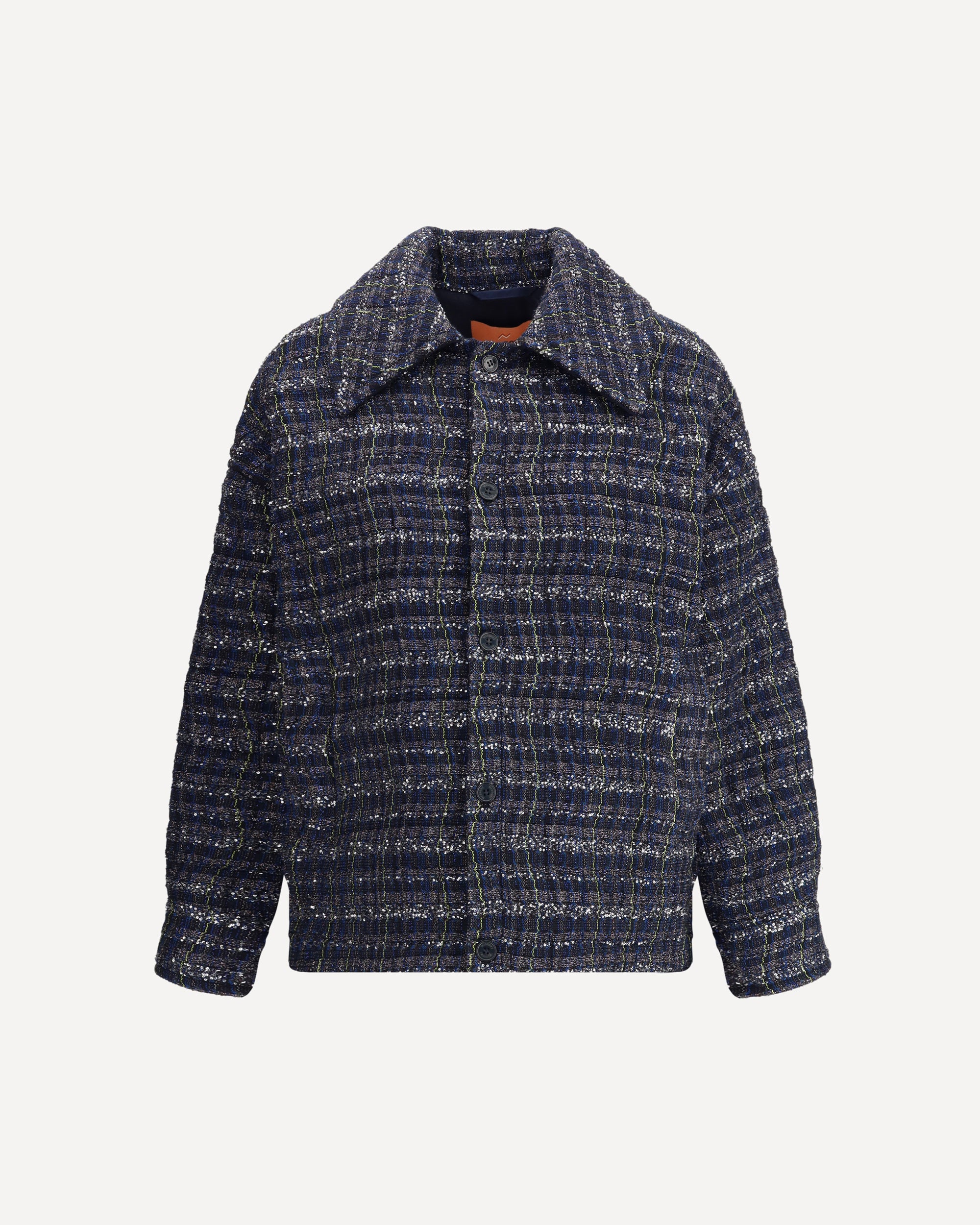 Jacket by Missoni features an exclusive check wave pattern that creates a dynamic and sophisticated visual effect. The viscose blend fabric enriched with lamé filaments gives bright highlights and a sophisticated touch. The design combines contemporary spirit and textile craftsmanship, making this shirt-jacket an ideal choice for those who wish to stand out with elegance and personality.
