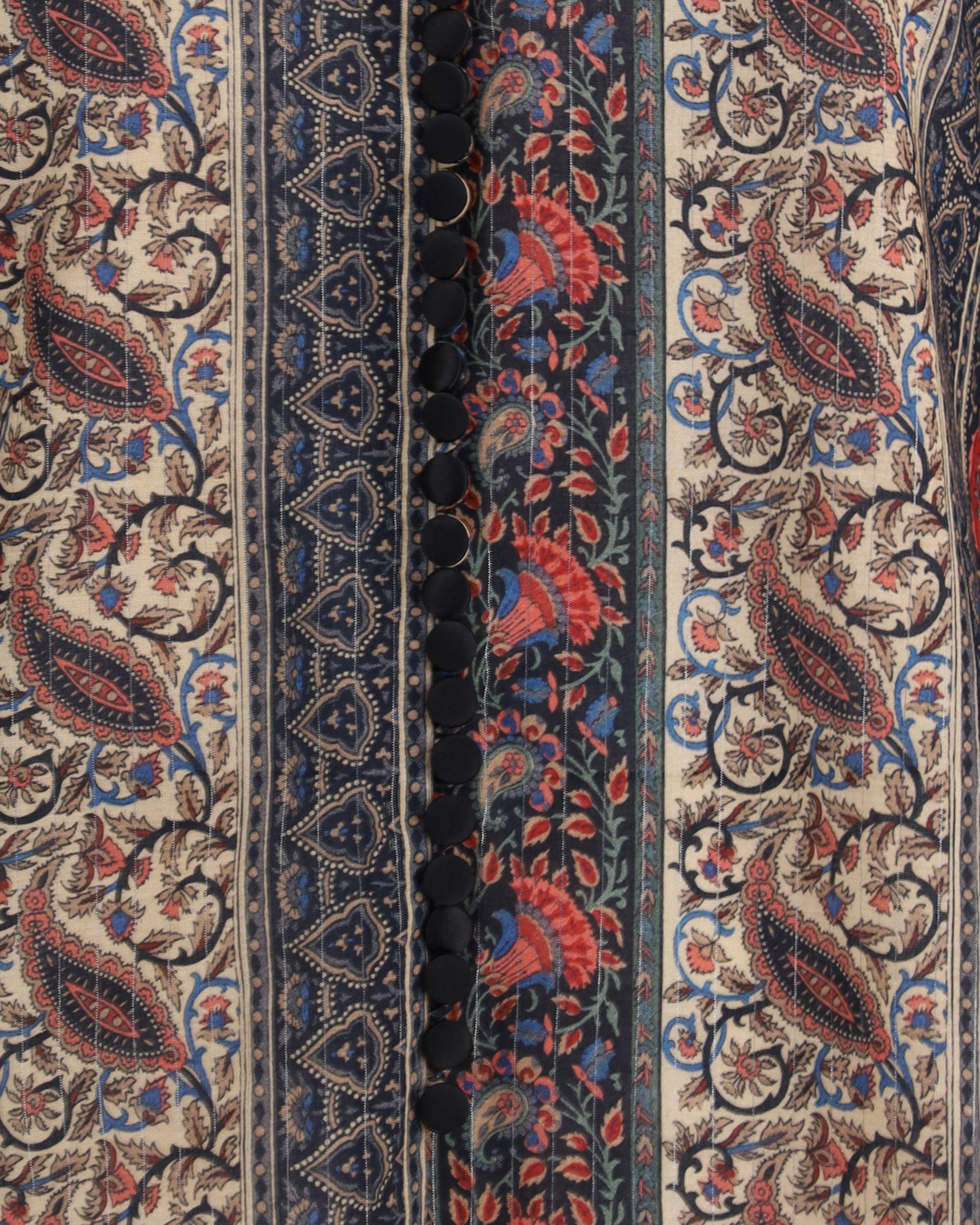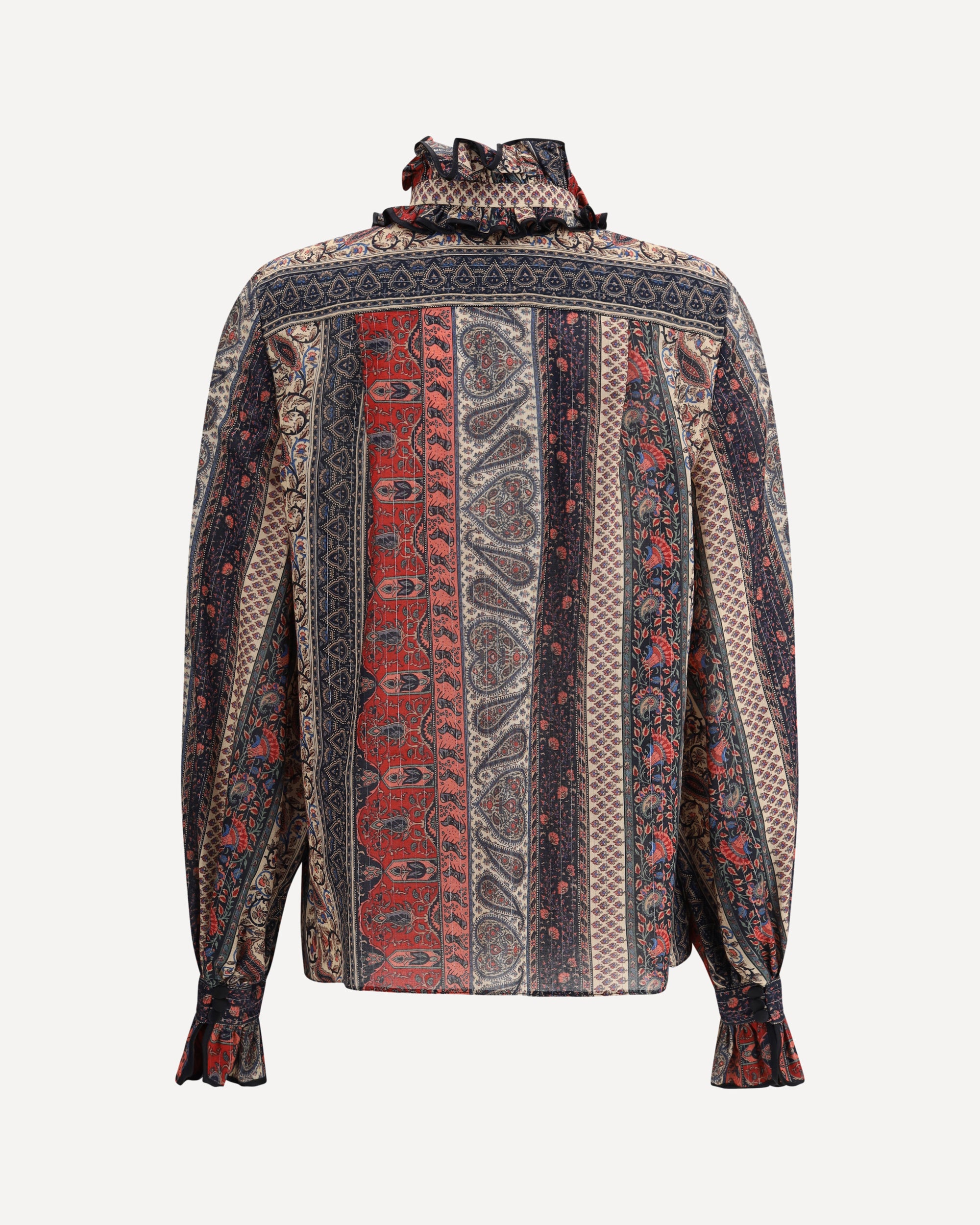 Valentino's Paisley Print Shirt is an elegant garment with a boho-chic flair, perfect for enriching your wardrobe with a refined and original touch. Featuring a high mandarin collar framed by delicate ruffles, it has a V-neckline that adds femininity and lightness to the silhouette. Long sleeves and a front button closure complete the design, while the vibrant paisley print expresses all the decorative and iconic appeal of the house.