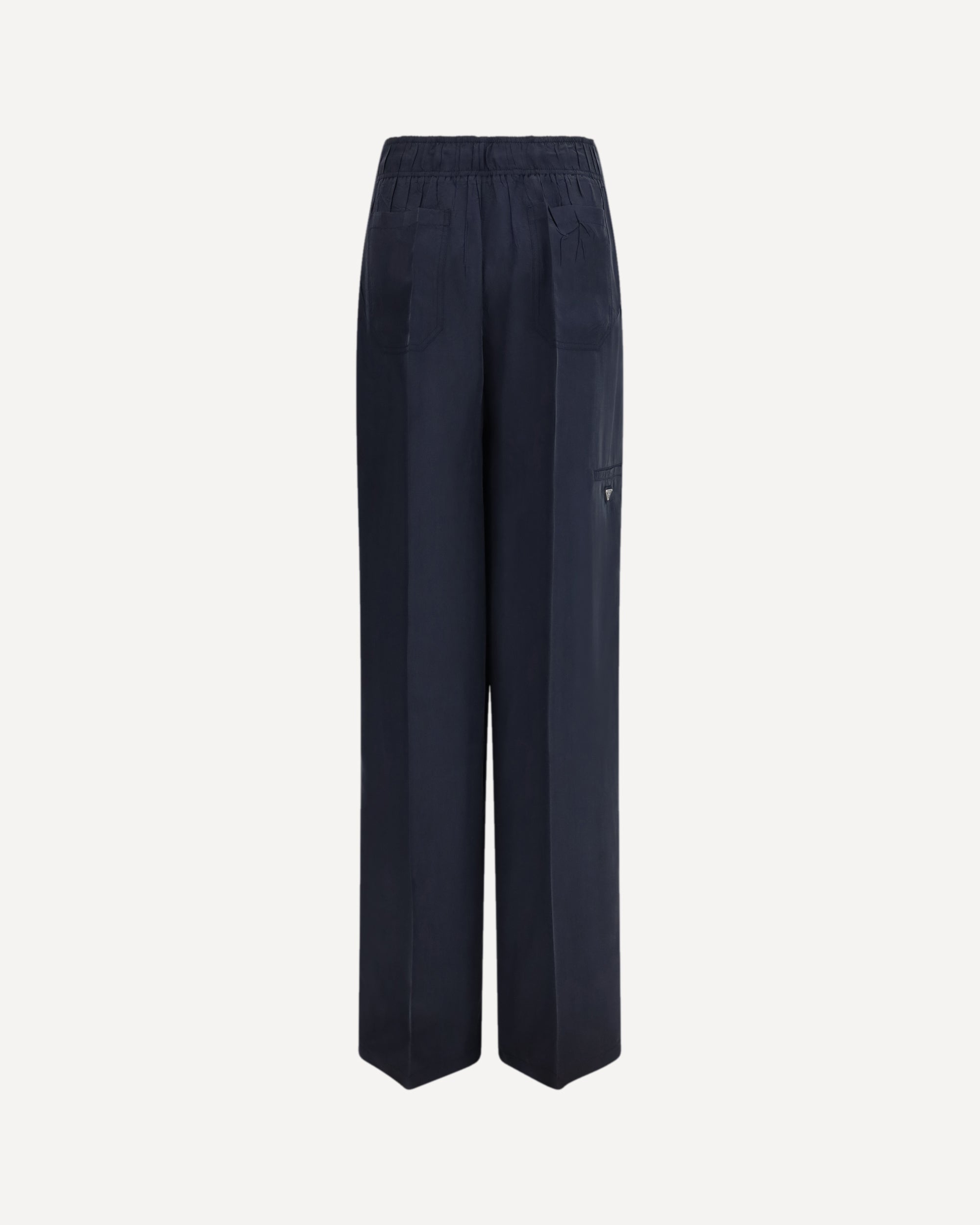 The washed silk Pants by Prada offer a blend of elegance and comfort. Crafted from washed silk, they feature an elasticated waistband for a comfortable and flexible fit. The straight leg and hem create a refined silhouette, while the two patch pockets on the back add practicality. The enameled triangular logo on the hip completes the design, adding a distinctive and luxurious touch to this versatile garment.
