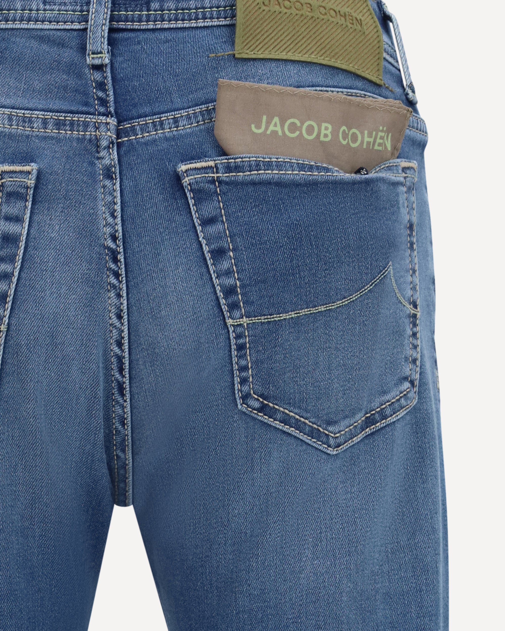 The slim fit Jeans by Jacob Cohën reinterpret the classic five-pocket design with a refined and versatile attitude. The regular fit ensures comfort and ease of movement, while the high-quality denim with a subtly worn finish adds character. The metal logo button with concealed zip highlights the attention to detail, completed by the signature bandana, a distinctive hallmark of the brand.