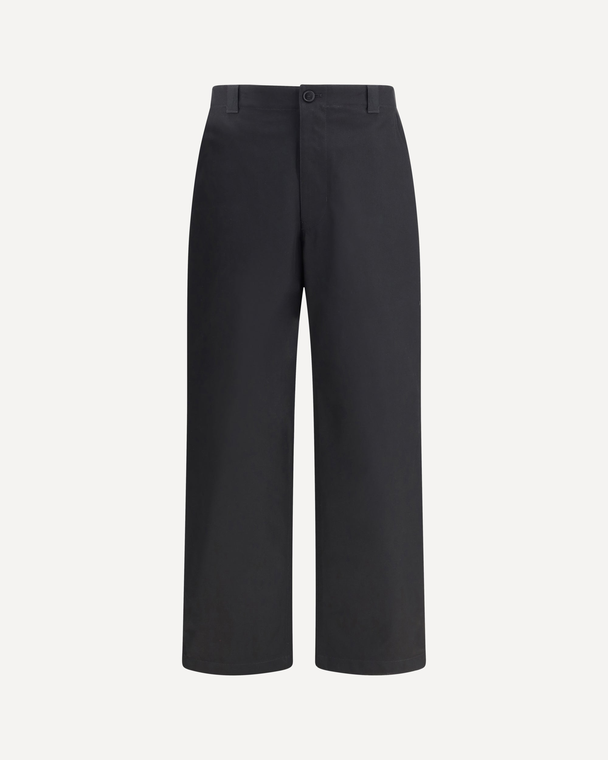 Cotton Pants by Gucci with front zipper and button closure. They feature two side slash pockets, two welt pockets on the back, one with a flap, and belt loops at the waist. The monochrome pattern gives a clean and elegant look, perfect for casual or formal outfits.