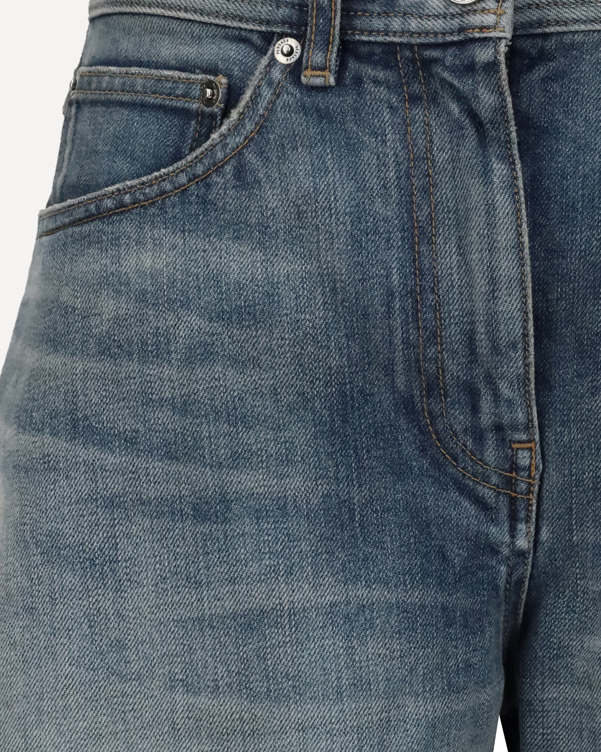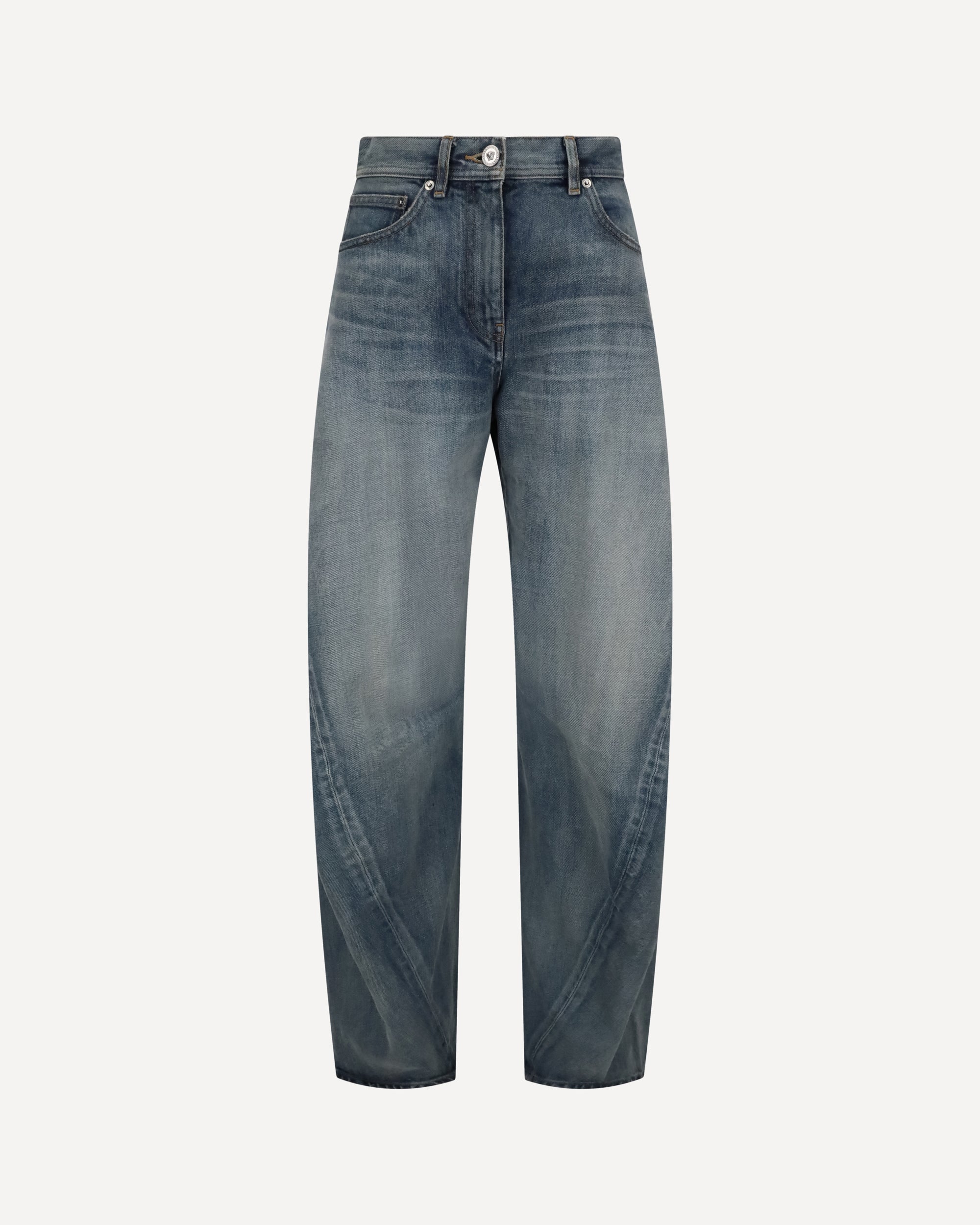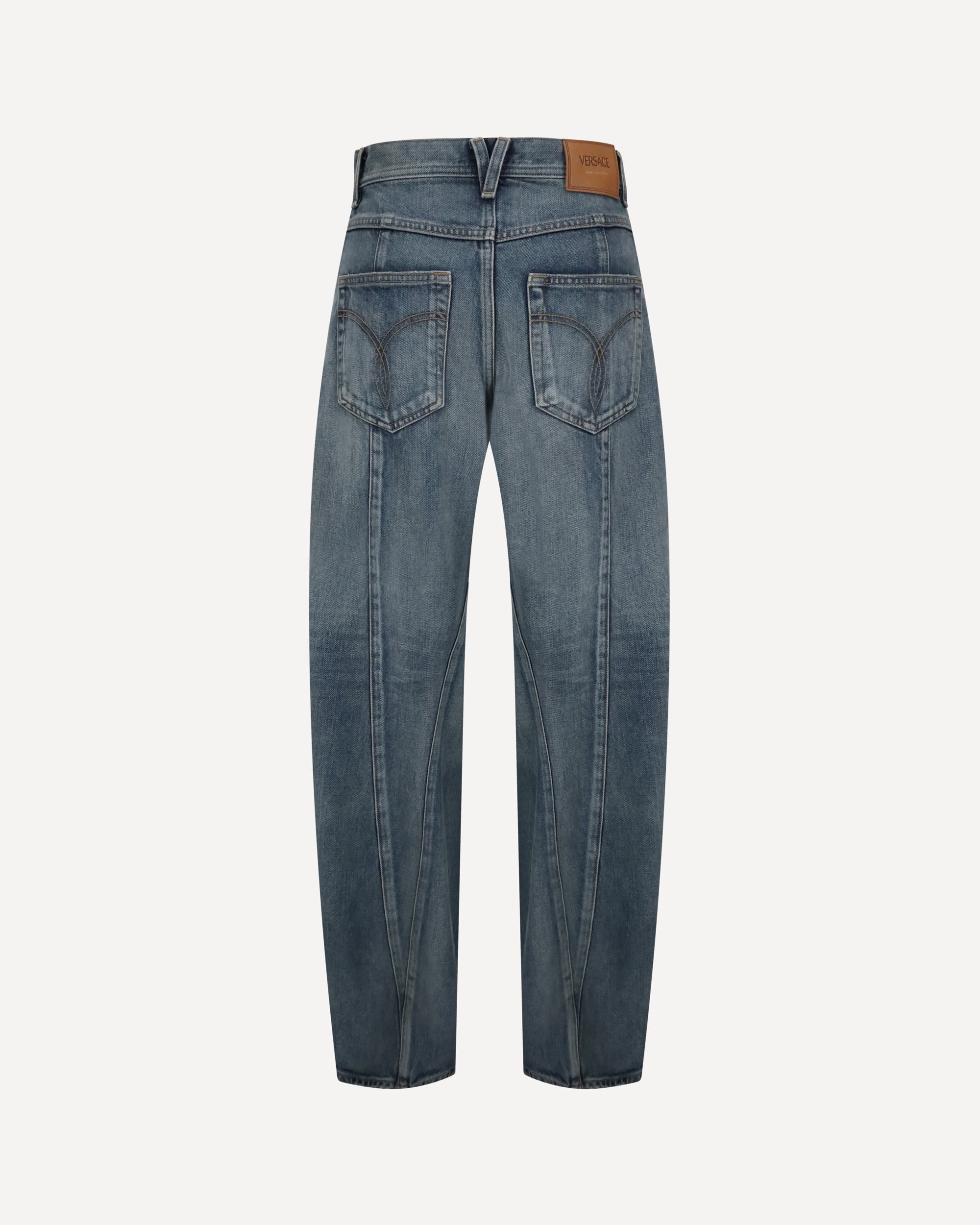 Versace's cotton Jeans combine traditional denim with the brand's bold aesthetic. The five-pocket style features a front zipper and embossed button closure, a distinctive detail that reflects attention to detail. Belt loops at the waist offer practicality, while the leather logo patch at the back lends an iconic and luxurious touch. The design is made unique by the twisted seam, which gives movement and an unexpected visual effect, perfect for those who like to stand out in style.