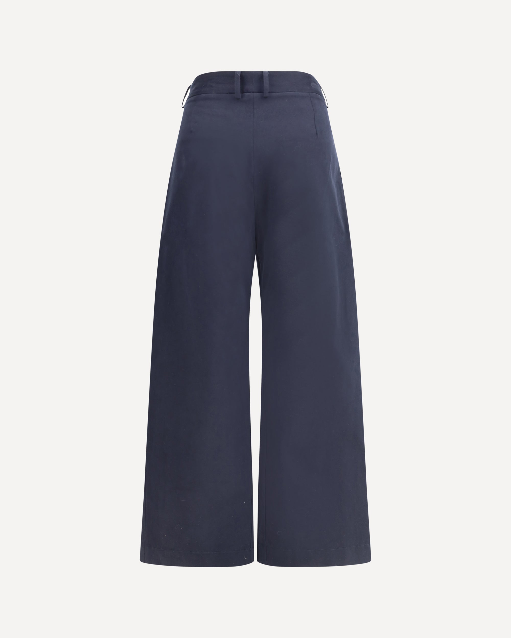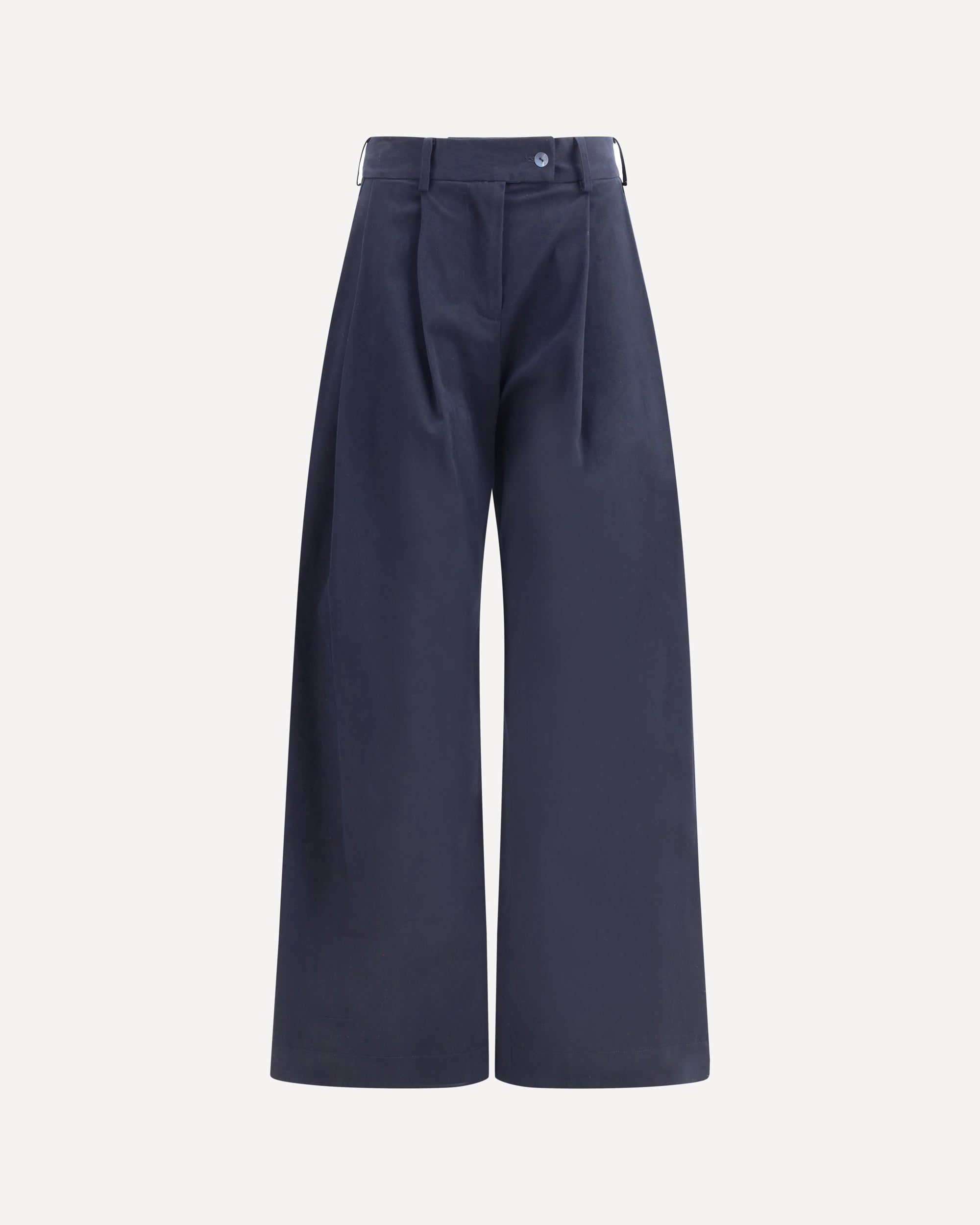 The Ele Ella's Pants feature a wide leg and front pleats, creating an elegant, flowing silhouette. The front zip and button closure, along with belt loops at the waist and two side welt pockets, complete this versatile and refined style.