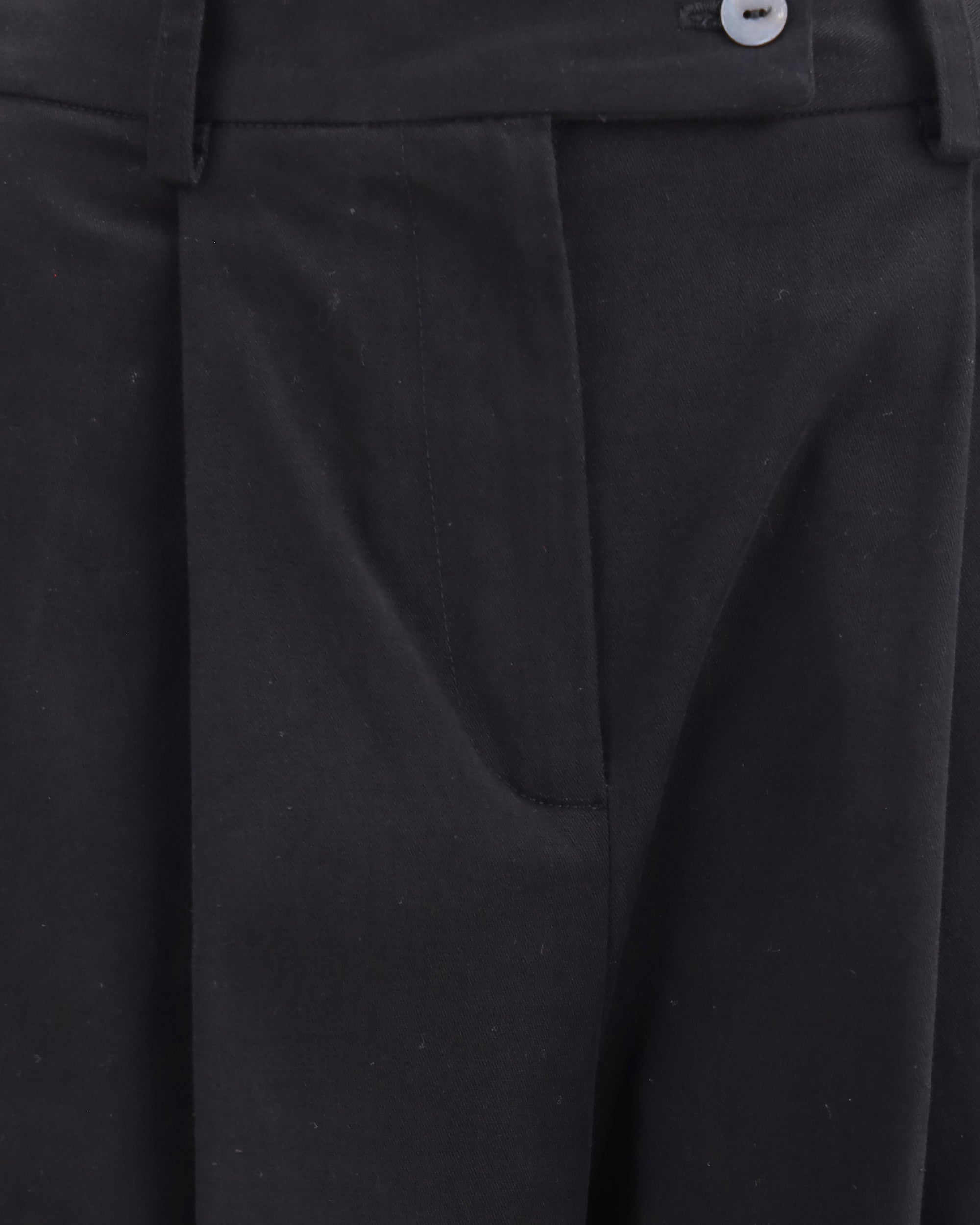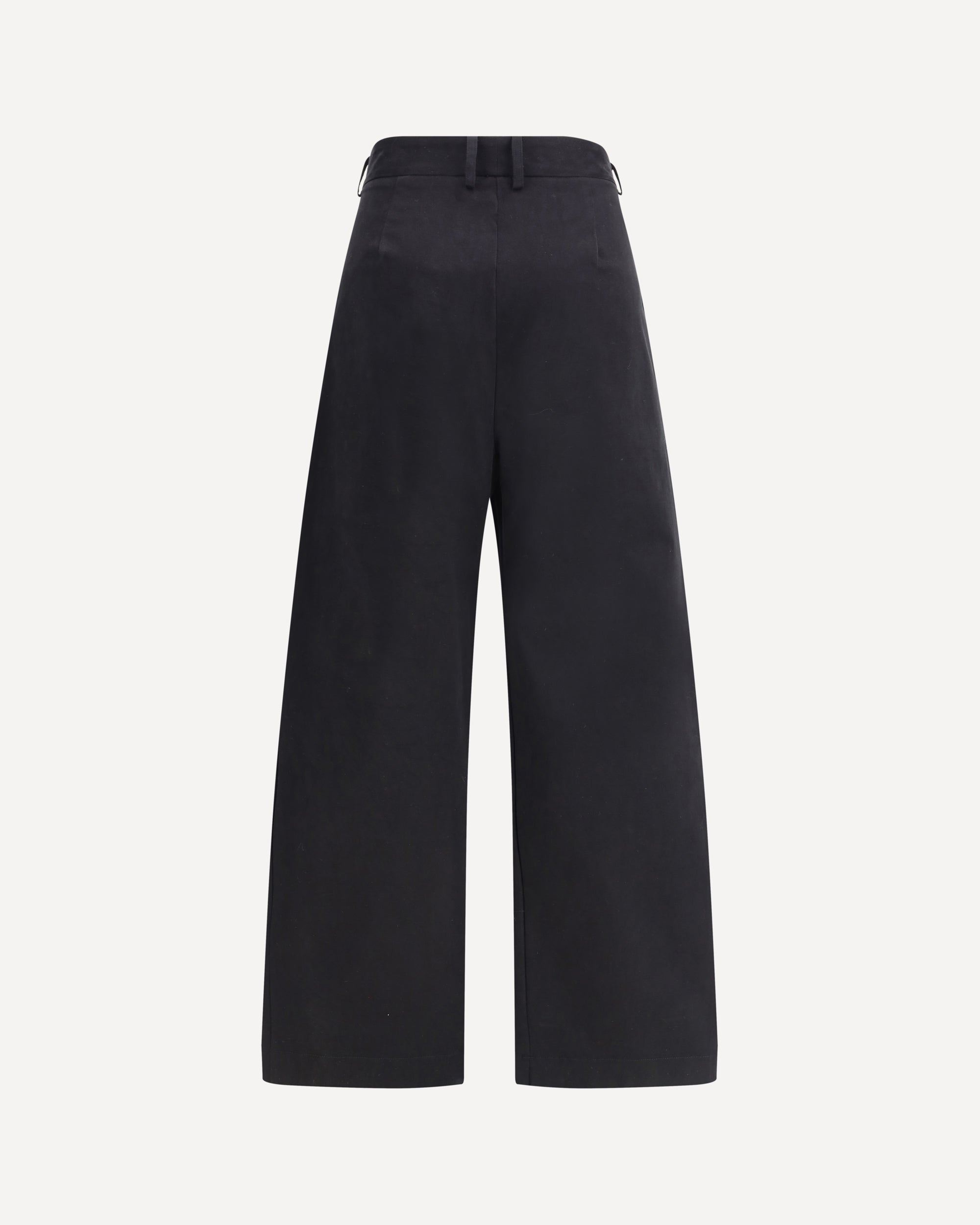 The Ele Ella's Pants feature a wide leg and front pleats, creating an elegant, flowing silhouette. The front zip and button closure, along with belt loops at the waist and two side welt pockets, complete this versatile and refined style.
