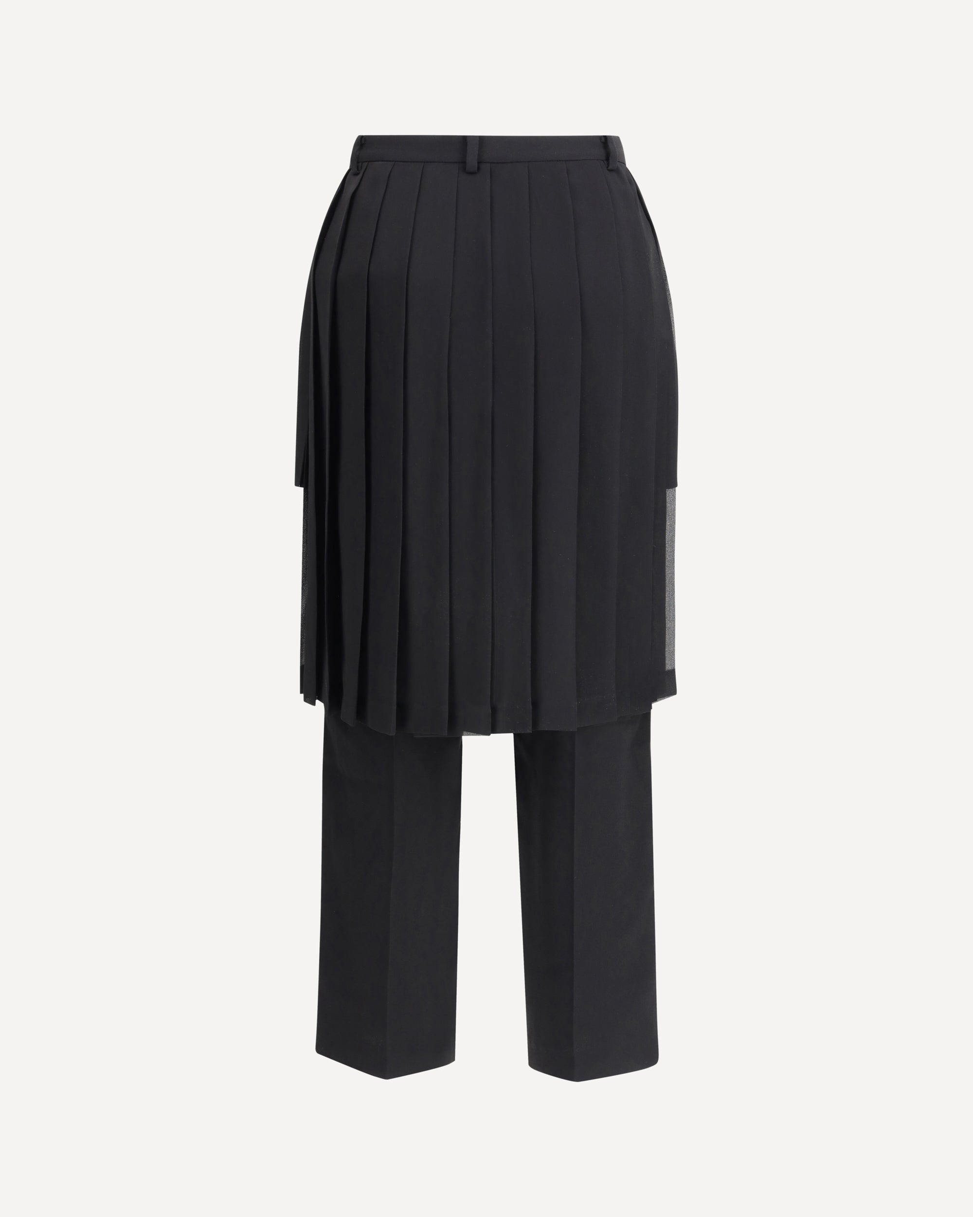 Undercover's Organza Pants combine structure and lightness in a modern, sophisticated design.The straight, slim silhouette is enhanced by an impalpable fabric that ensures comfort and fluidity.Hidden pockets maintain clean, minimal lines,while the overlapping organza pleated skirt lends a touch of ethereal, unexpected elegance.