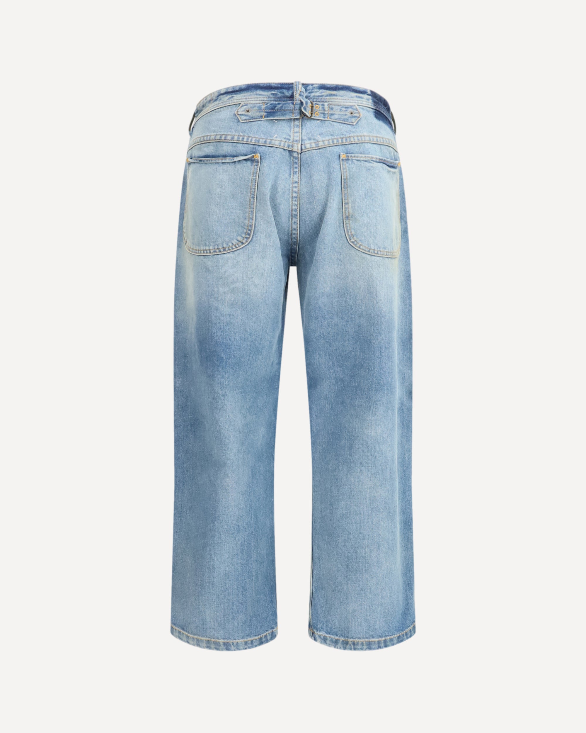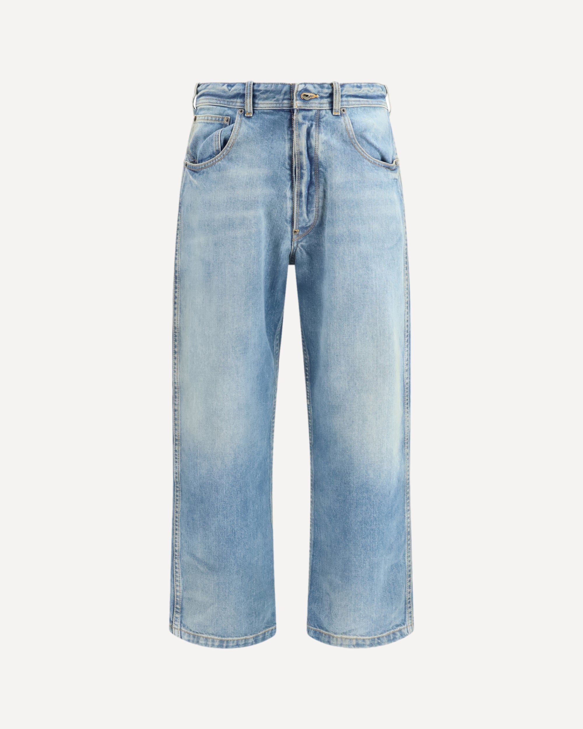 The straight-leg cropped Jeans by Margiela convey a clean, deconstructed aesthetic true to the Maison’s iconic language. Crafted from pure cotton, they feature a wide straight-leg silhouette with a cropped length and raw-cut hems that enhance their contemporary character. The five-pocket construction is finished with a front zip-and-button closure and a back waistband adjuster, while the signature four stitches at the back complete the design with Maison Margiela’s unmistakable hallmark.