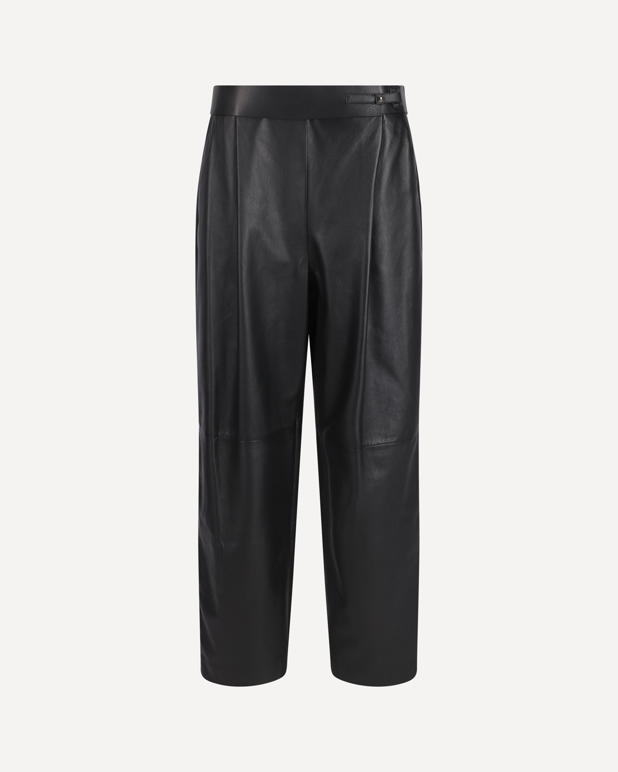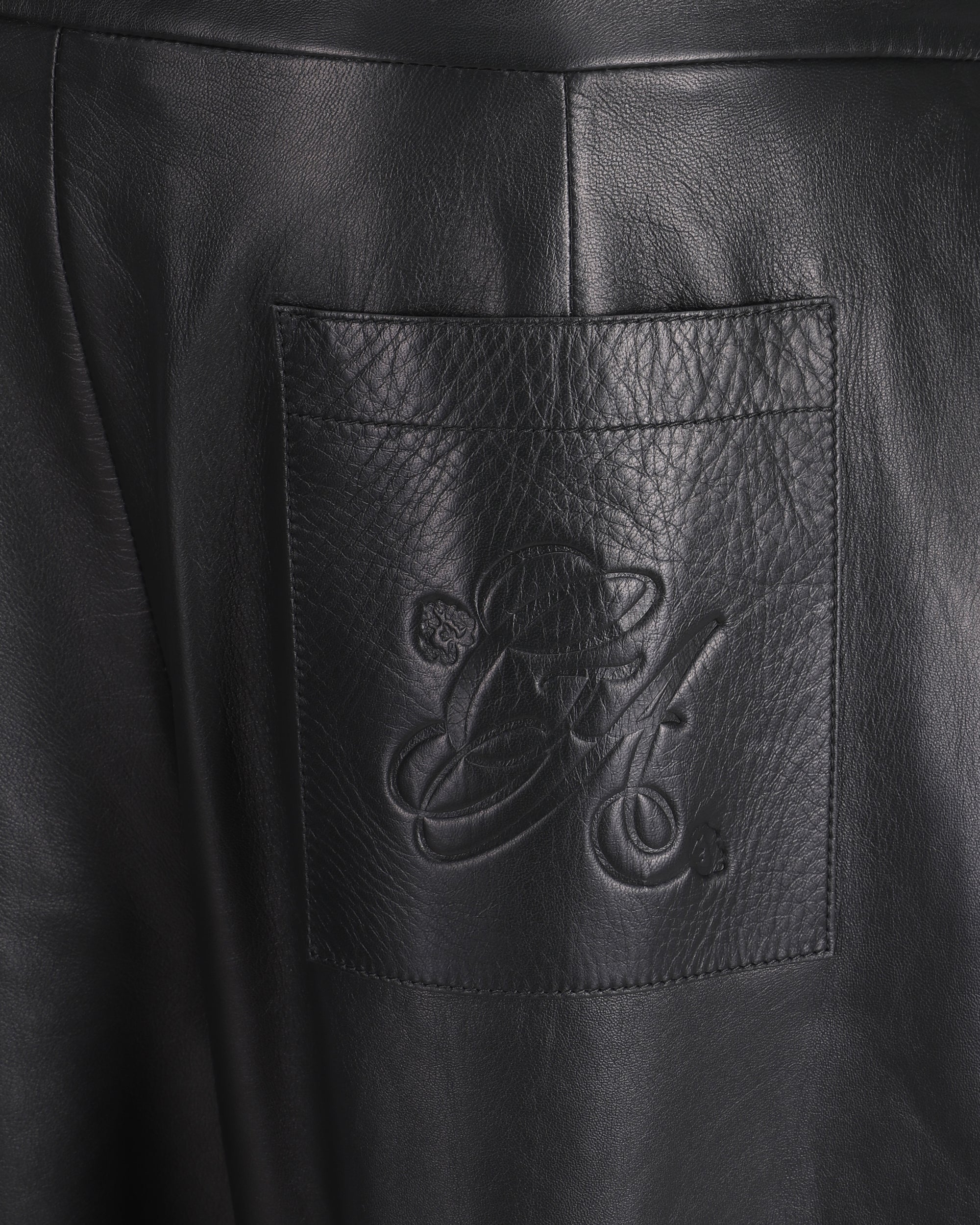 Giorgio Armani's leather Pants combine elegance and comfort with a side zipper closure and matching built-in belt, ensuring a secure and customizable fit. The paneled design lends a sophisticated silhouette, while the two side welt pockets and the patch pocket on the back with the iconic press-stamped monogram add functionality and a distinctive touch. The monochrome pattern ensures an understated and versatile look, while the over fit offers impeccable comfort and a modern look.