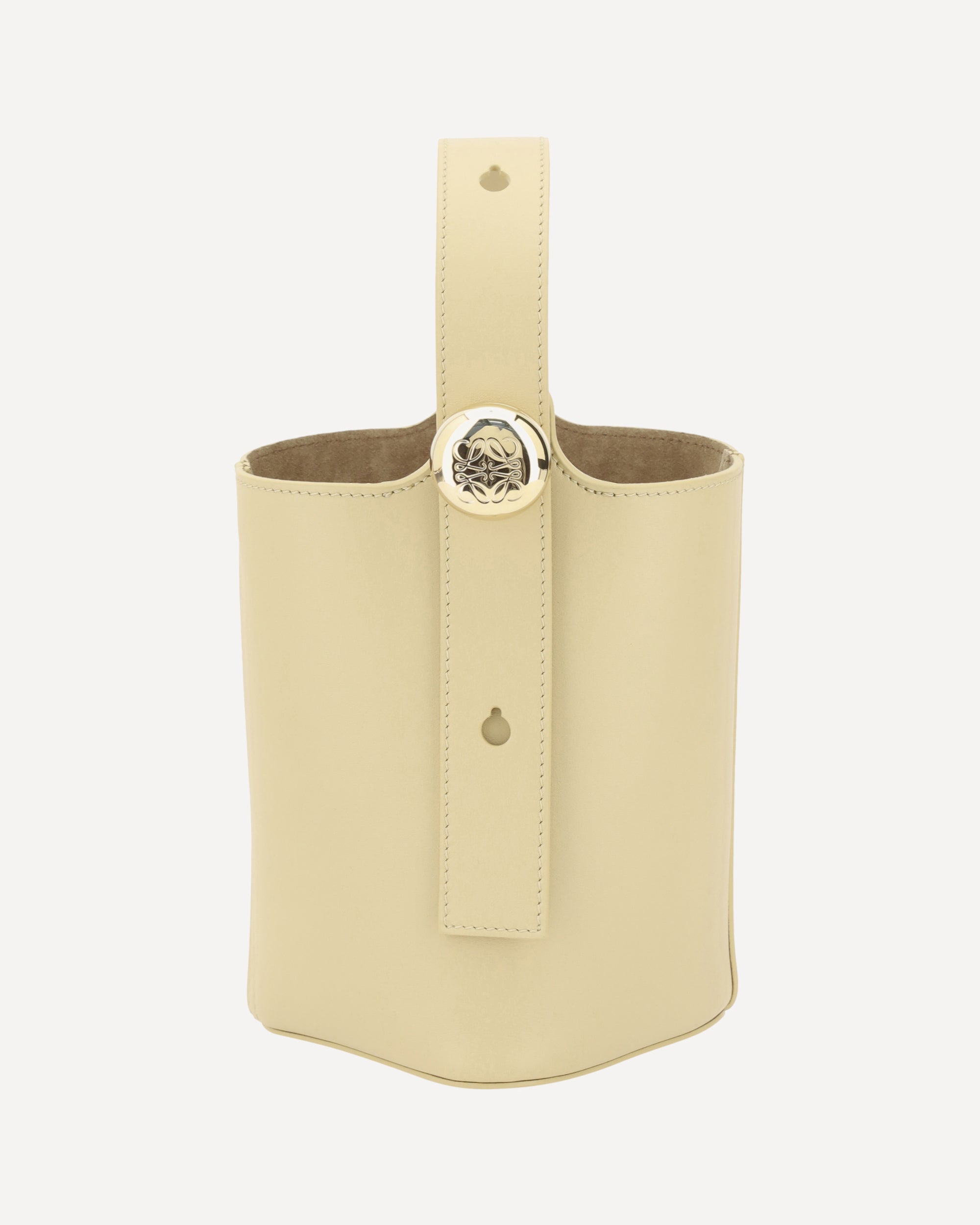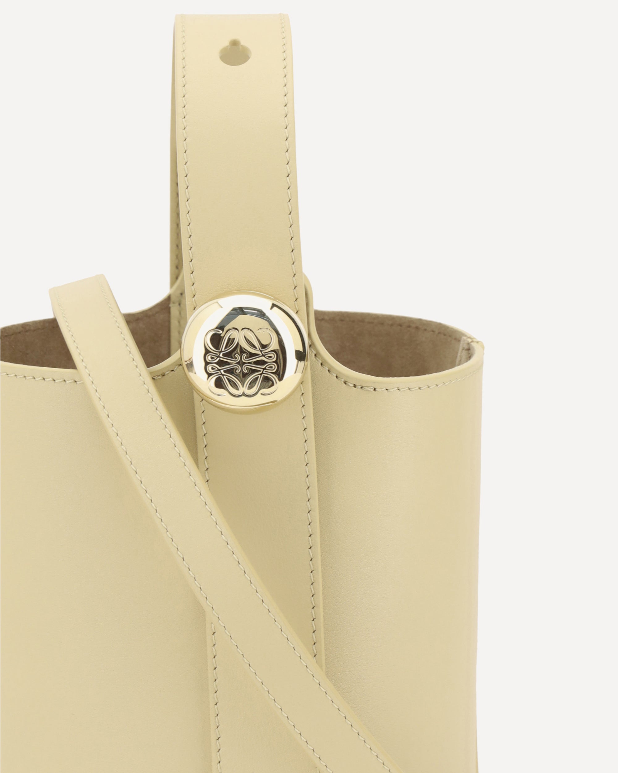 Loewe's Pebble Mini Leather Bucket Bag features an adjustable flat top handle, allowing you to adjust it to your needs. The flat shoulder strap is adjustable and removable, offering versatility in carrying. The hardware is enhanced by the brand's iconic logo applied to the handle, adding a distinctive touch of class. A compact and stylish accessory, perfect for a modern and practical look.