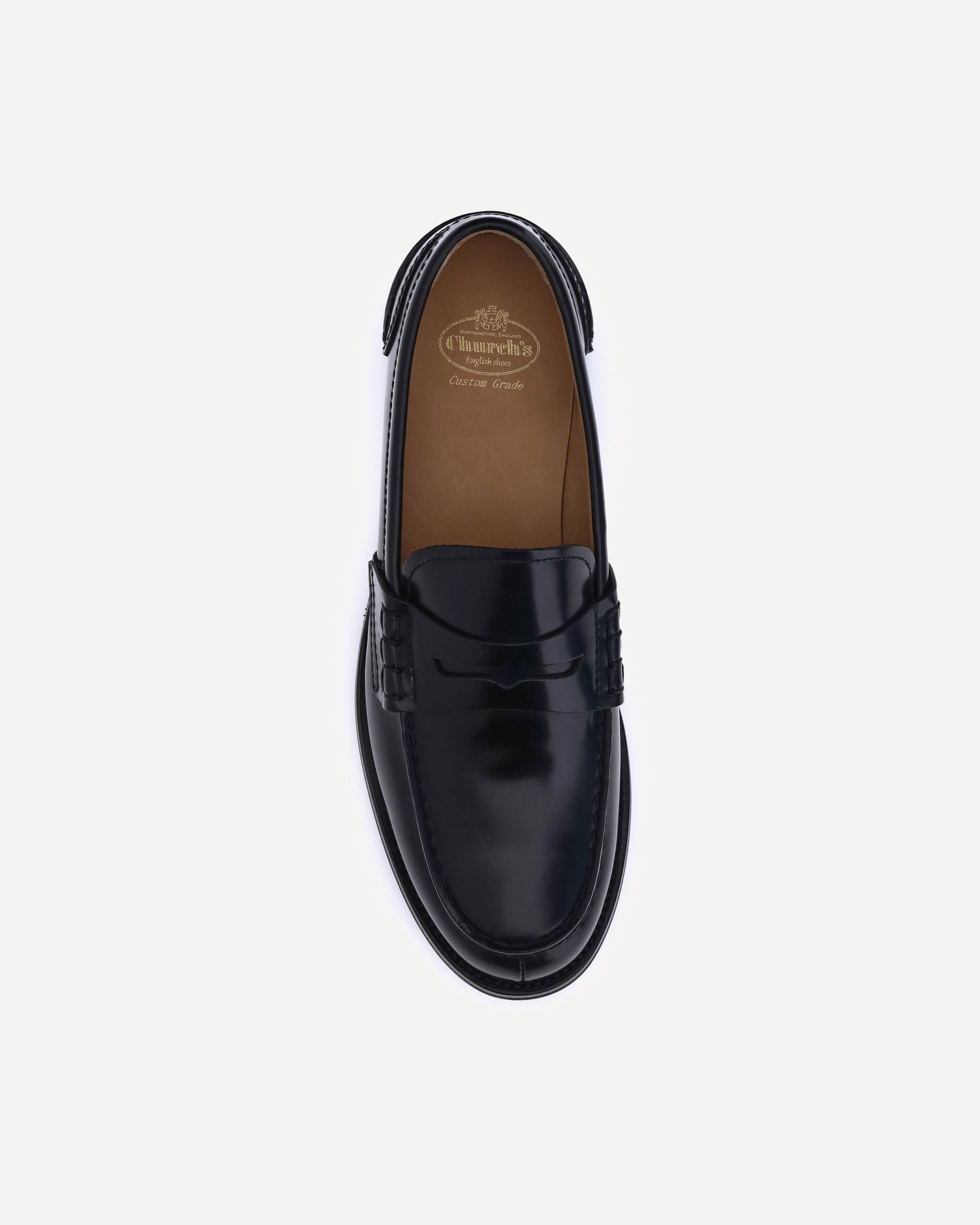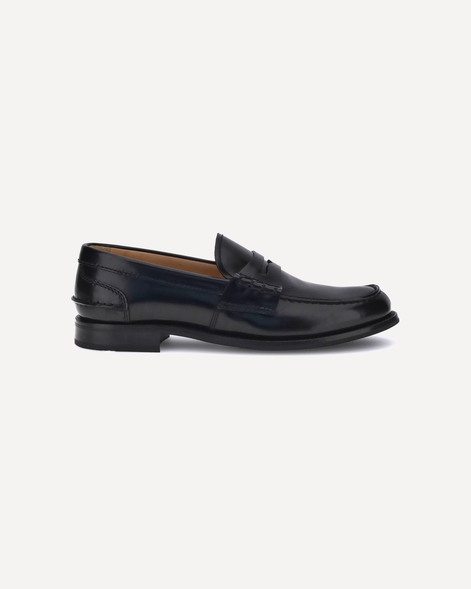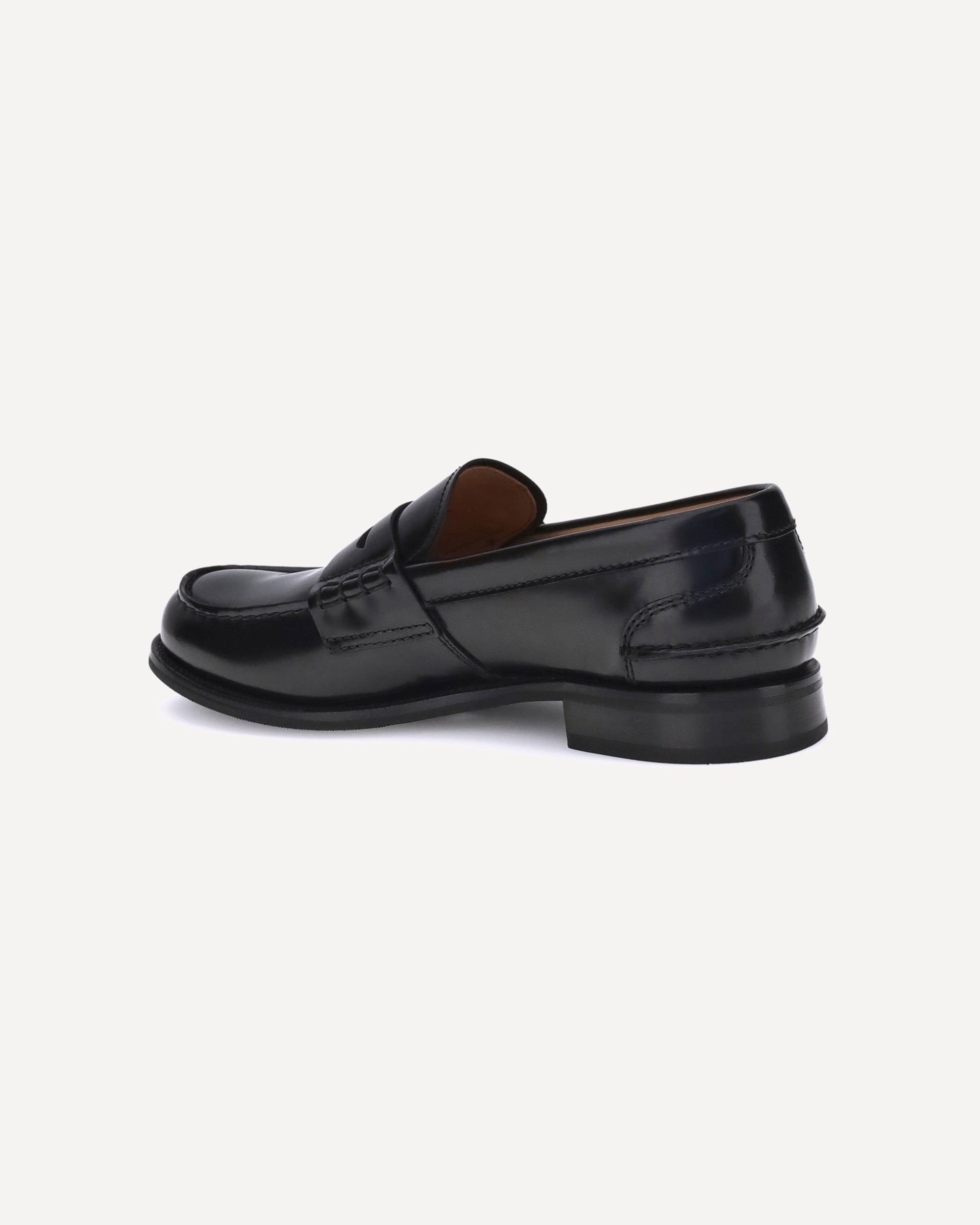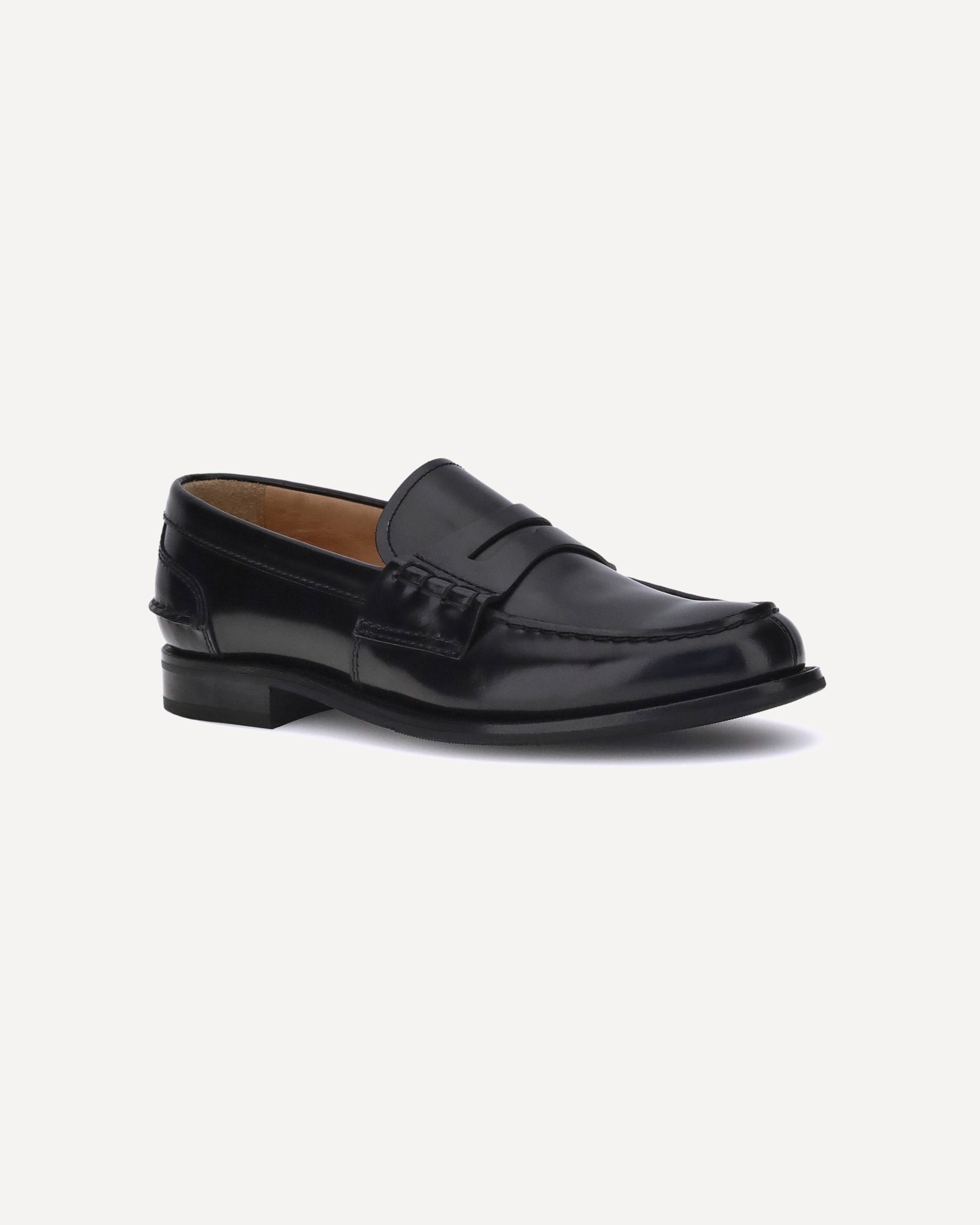 Church's leather Pembrey Loafers feature a sleek patent leather design and tone-on-tone embossed stitching trim. Featuring a leather front tray, elongated toe and a slight leather heel, they offer a logo-embossed insole that combines comfort and classic sophistication.