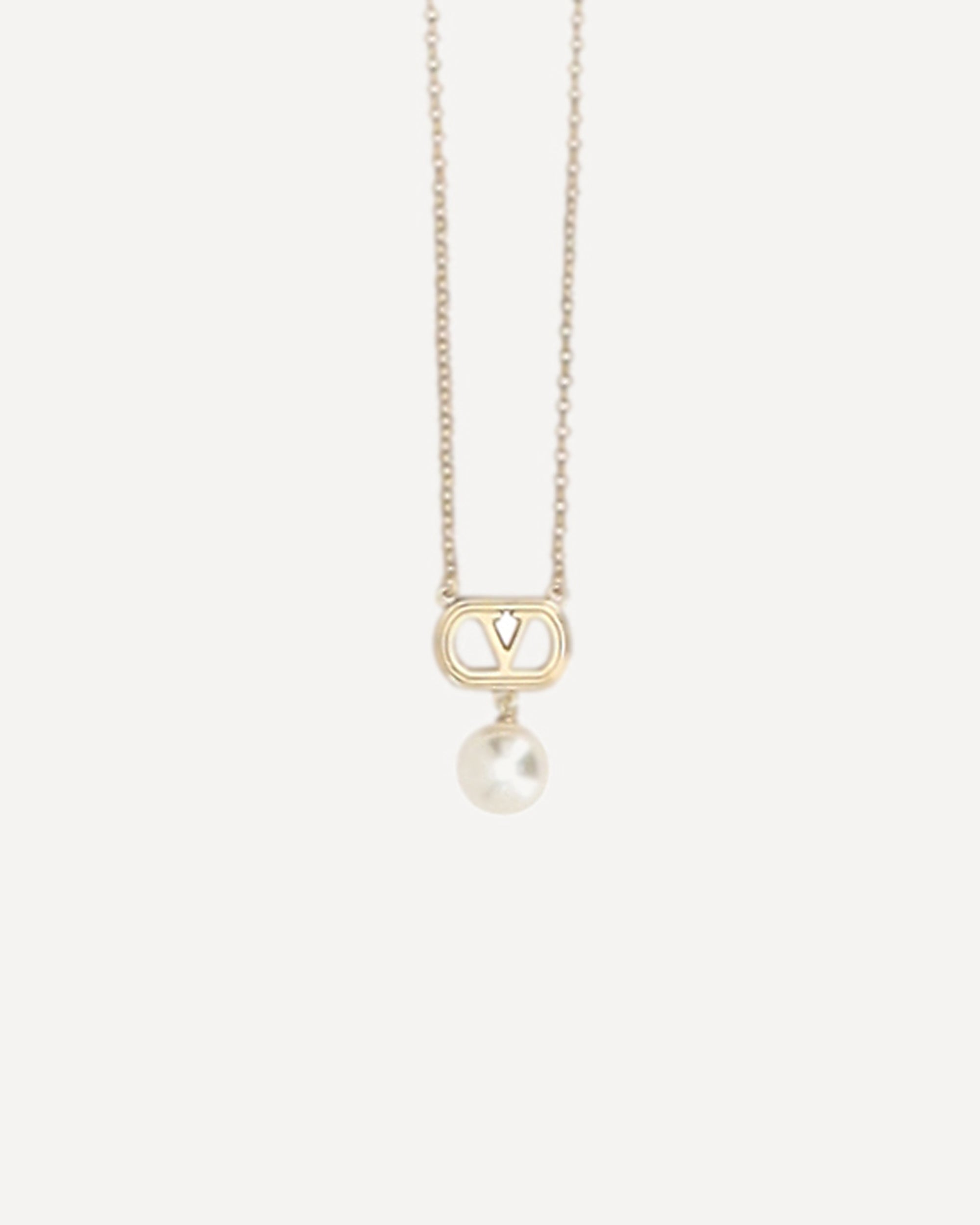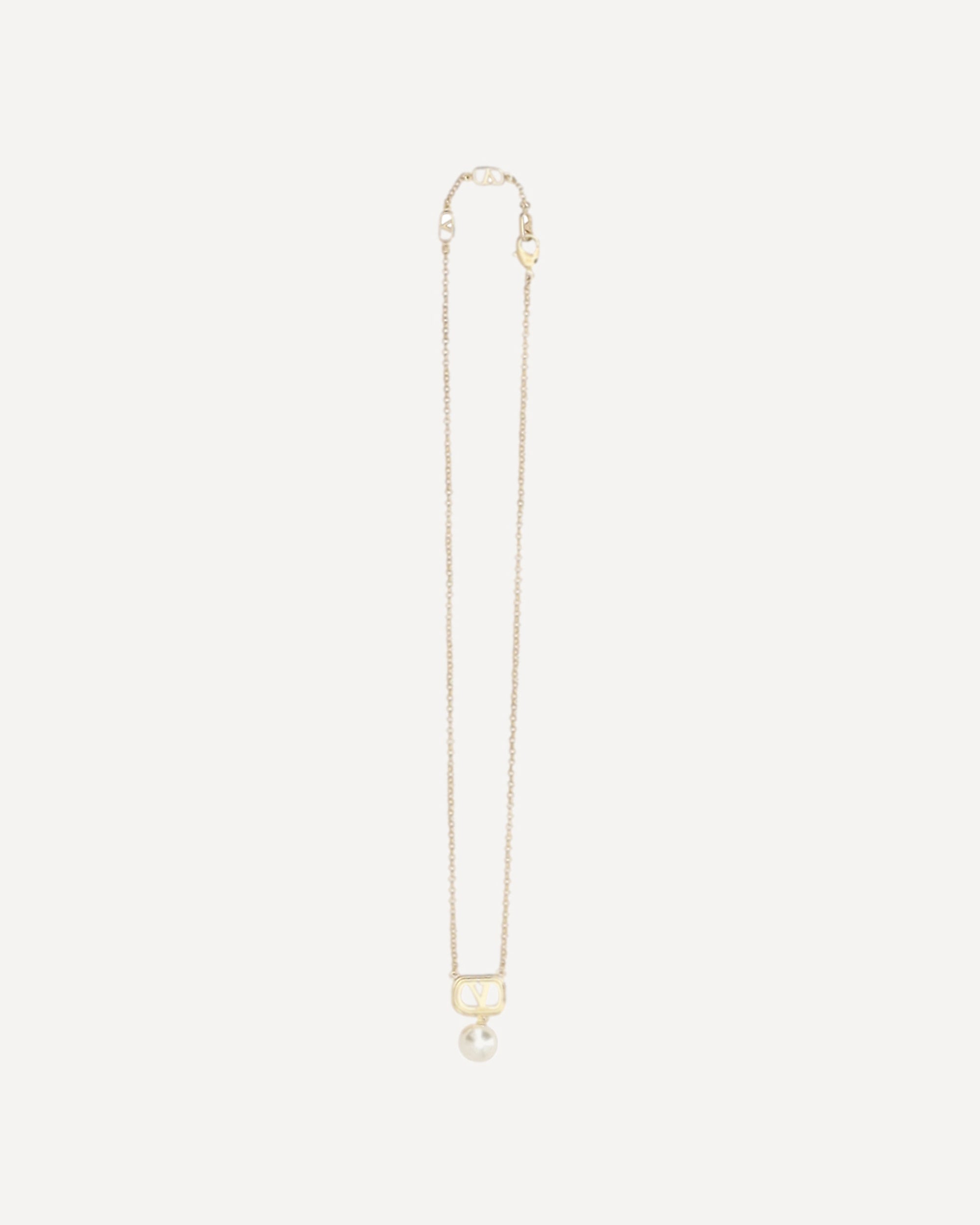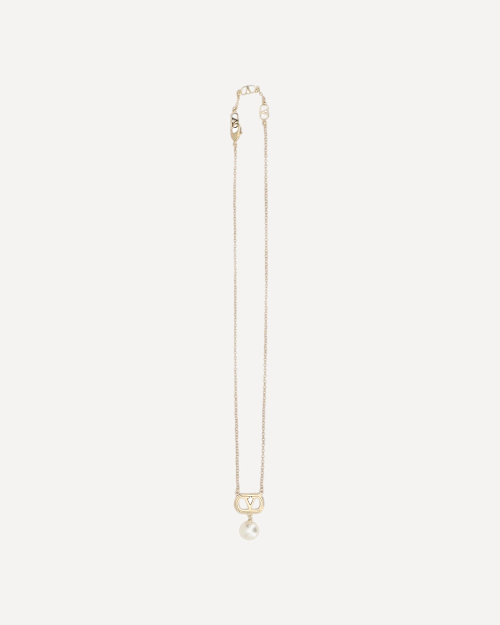 The Valentino Garavani Necklace features a classic clasp and an iconic VLogo with an applied pearl pendant, adding a touch of elegance and sophistication. A distinctive accessory that combines the brand's luxury with the timeless beauty of pearl, perfect for completing any look with a sophisticated detail.