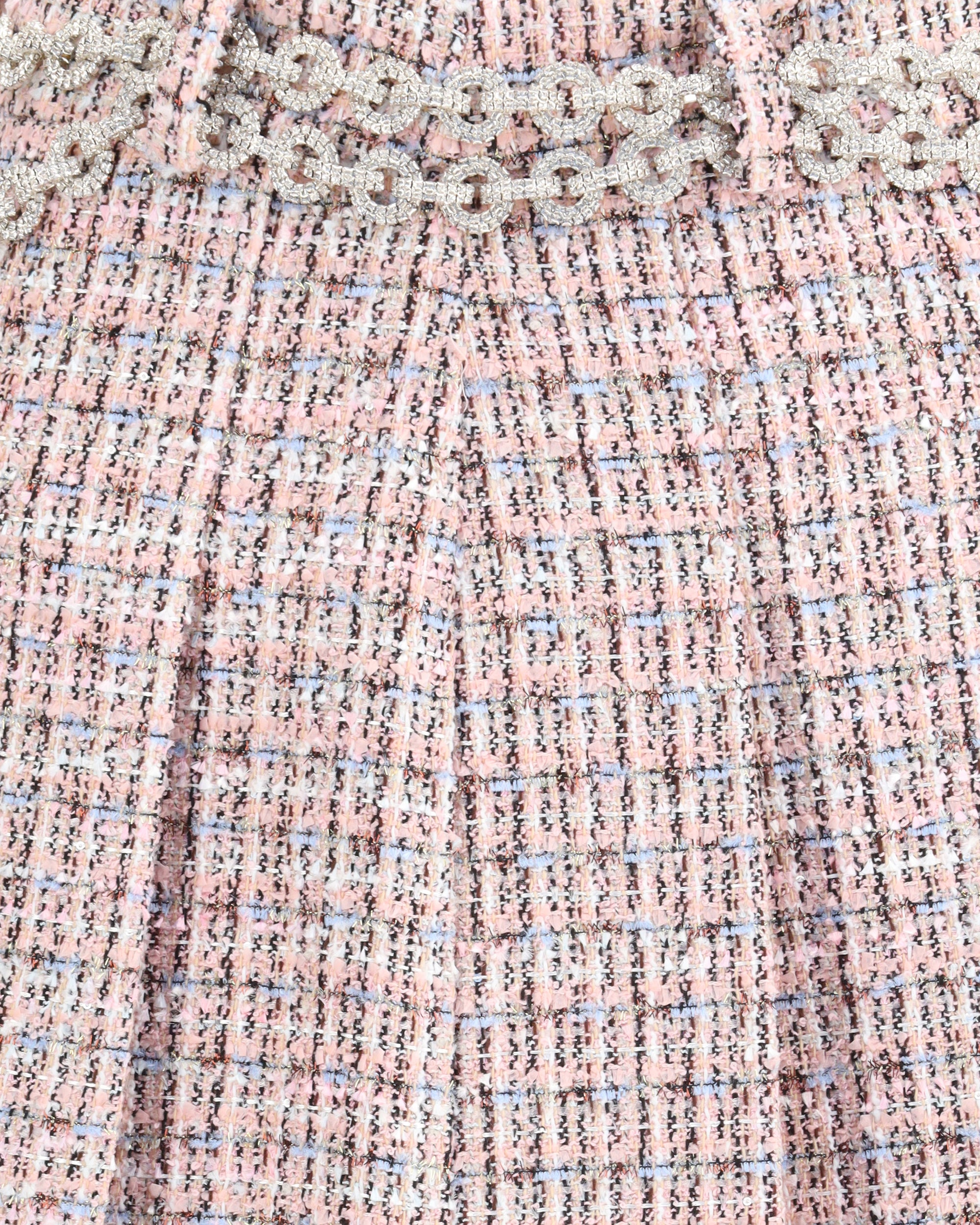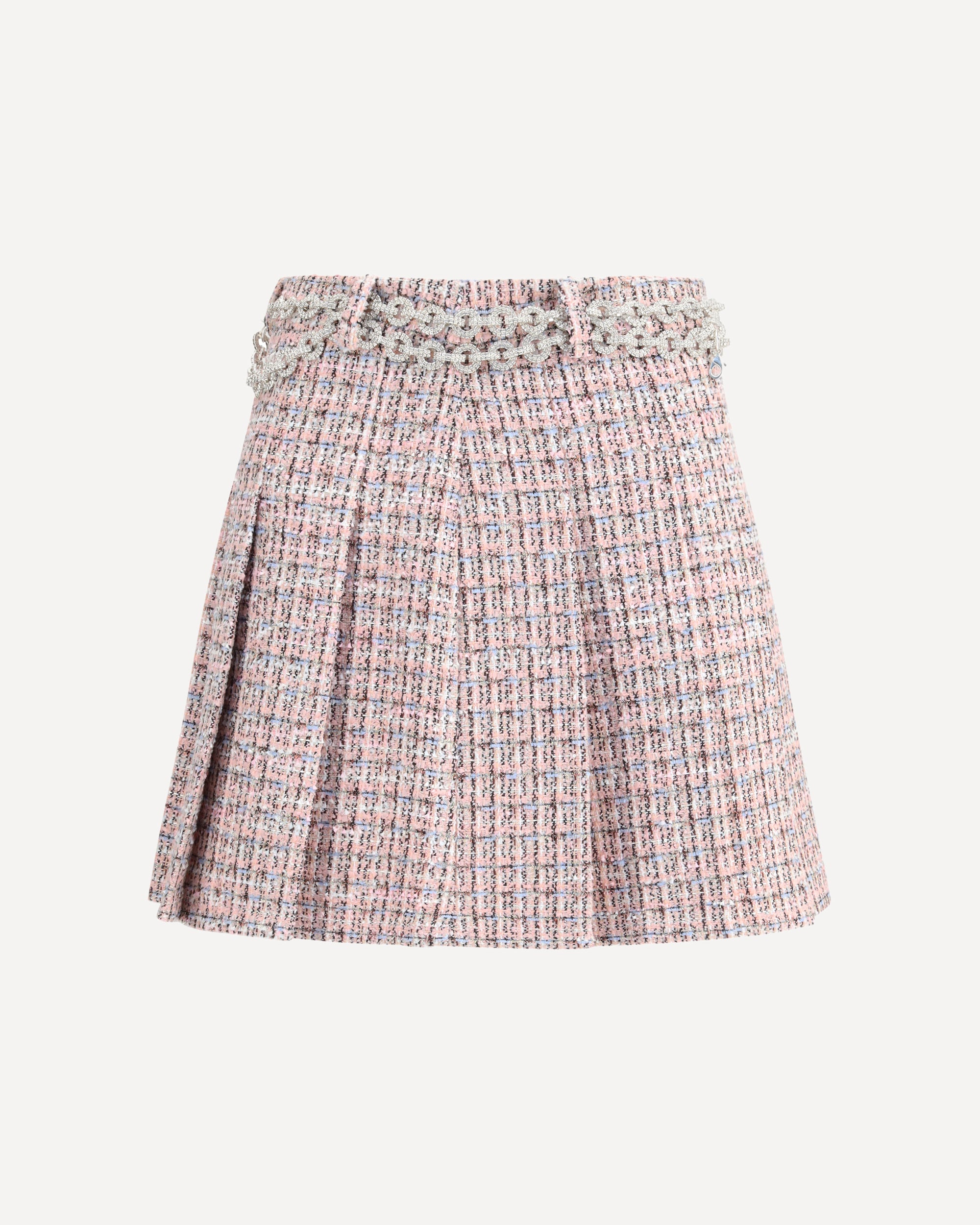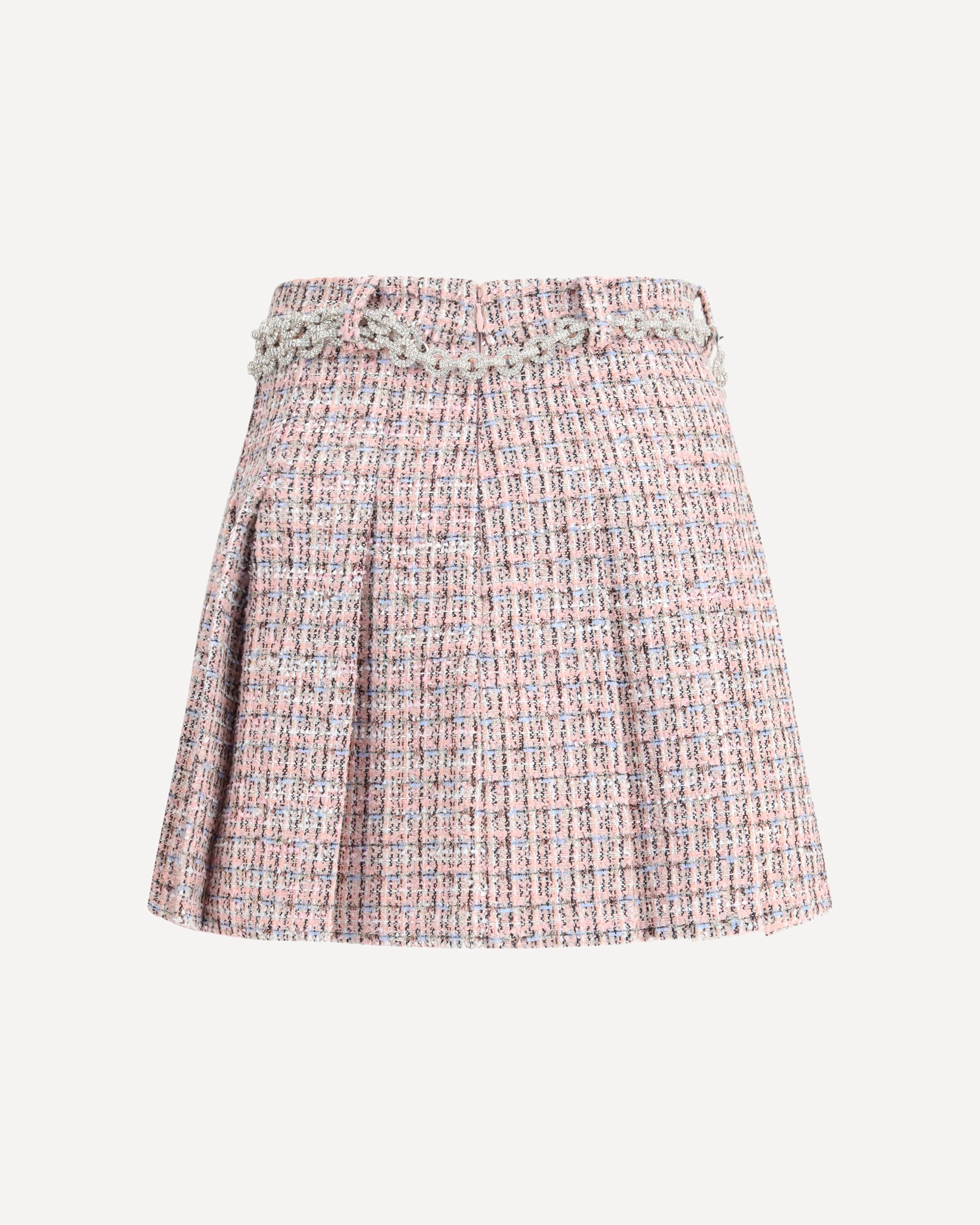 Self-Portrait's Crystal Belted Miniskirt reinterprets the preppy aesthetic with a touch of glamour. Fitted cut and made of pleated pink bouclé, it is embellished with a rhinestone chain belt that brightens the look. The hidden side zipper closure keeps the line clean, while the fabric has minimal stretch. For a statement ensemble, a coordinating jacket is available.