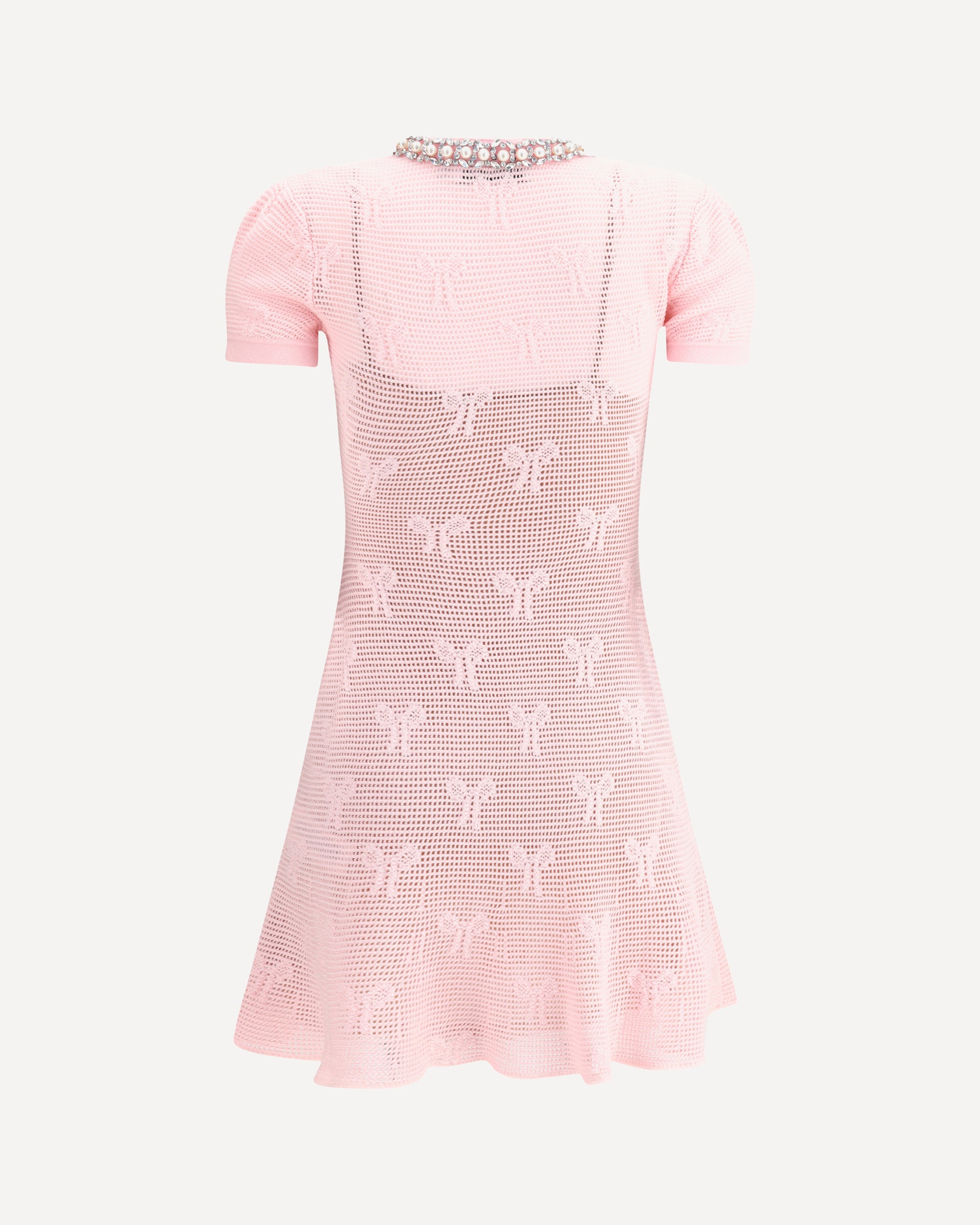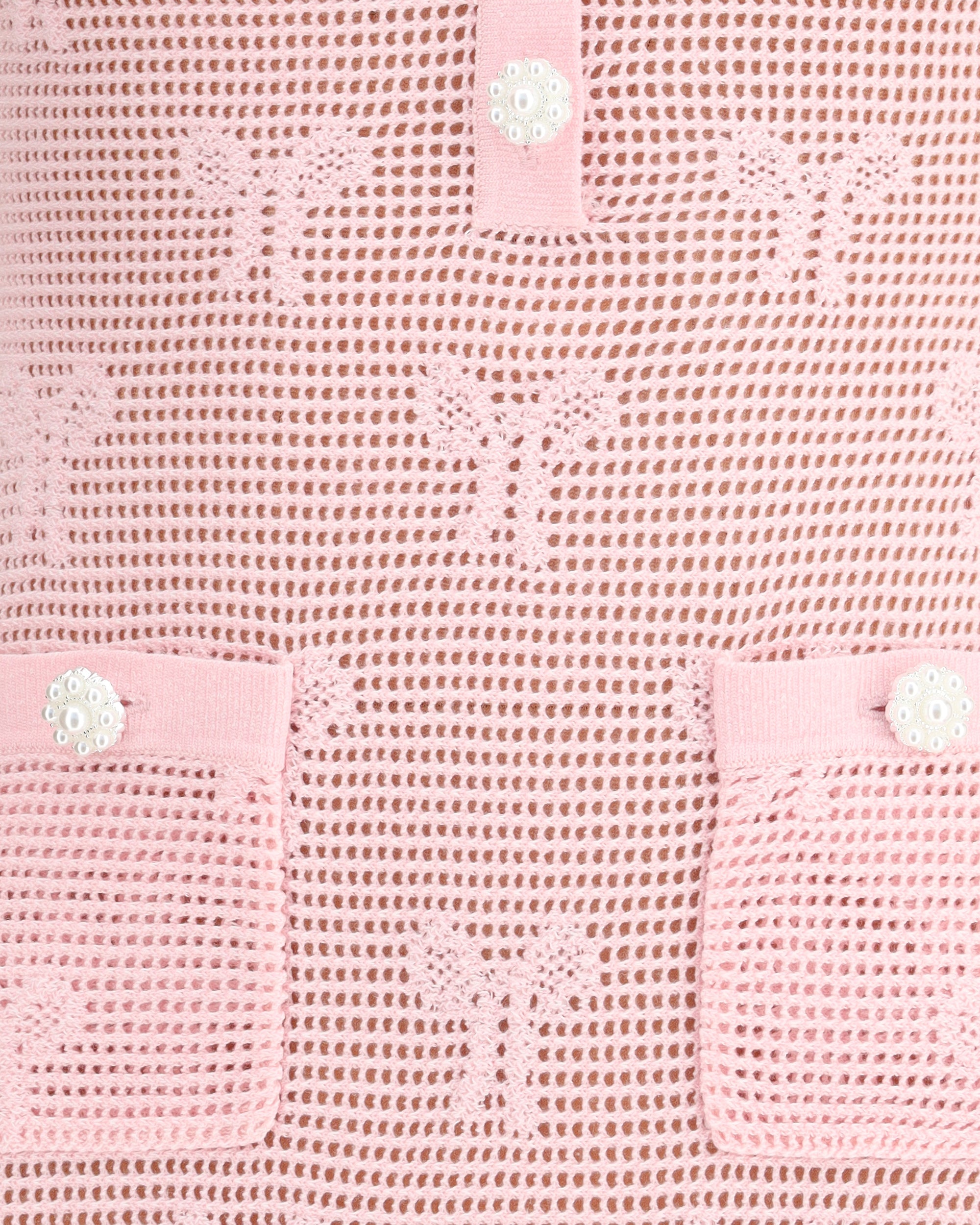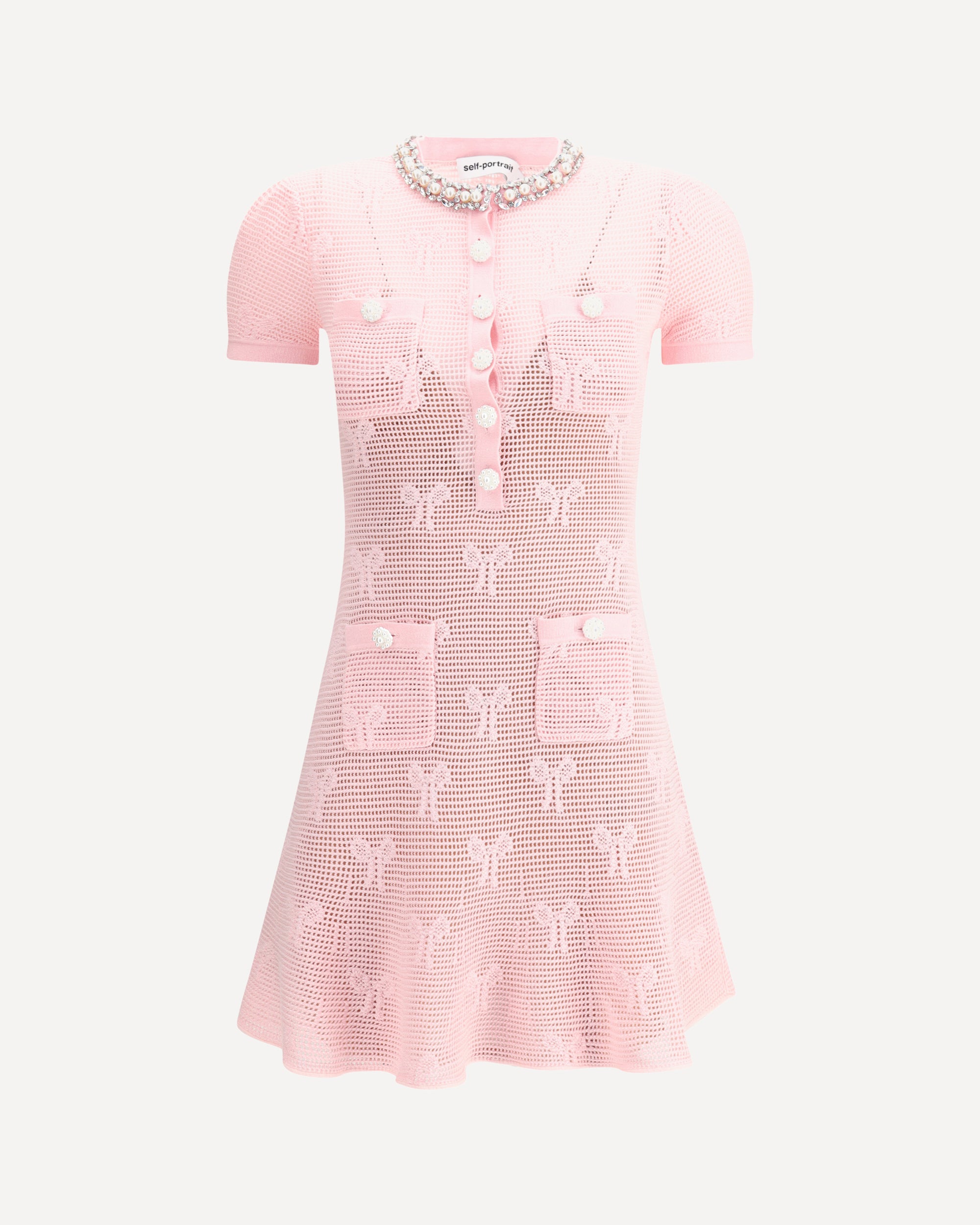 Self-Portrait's Crochet Knit Short Dress is a masterpiece of craftsmanship and femininity. Featuring a choker embellished with rhinestones and pearls, it features a front button closure decorated with pearls. The four patch pockets on the front, together with the crochet pattern enriched with delicate bows, give the garment a romantic and sophisticated appeal, perfect for those who love precious details.