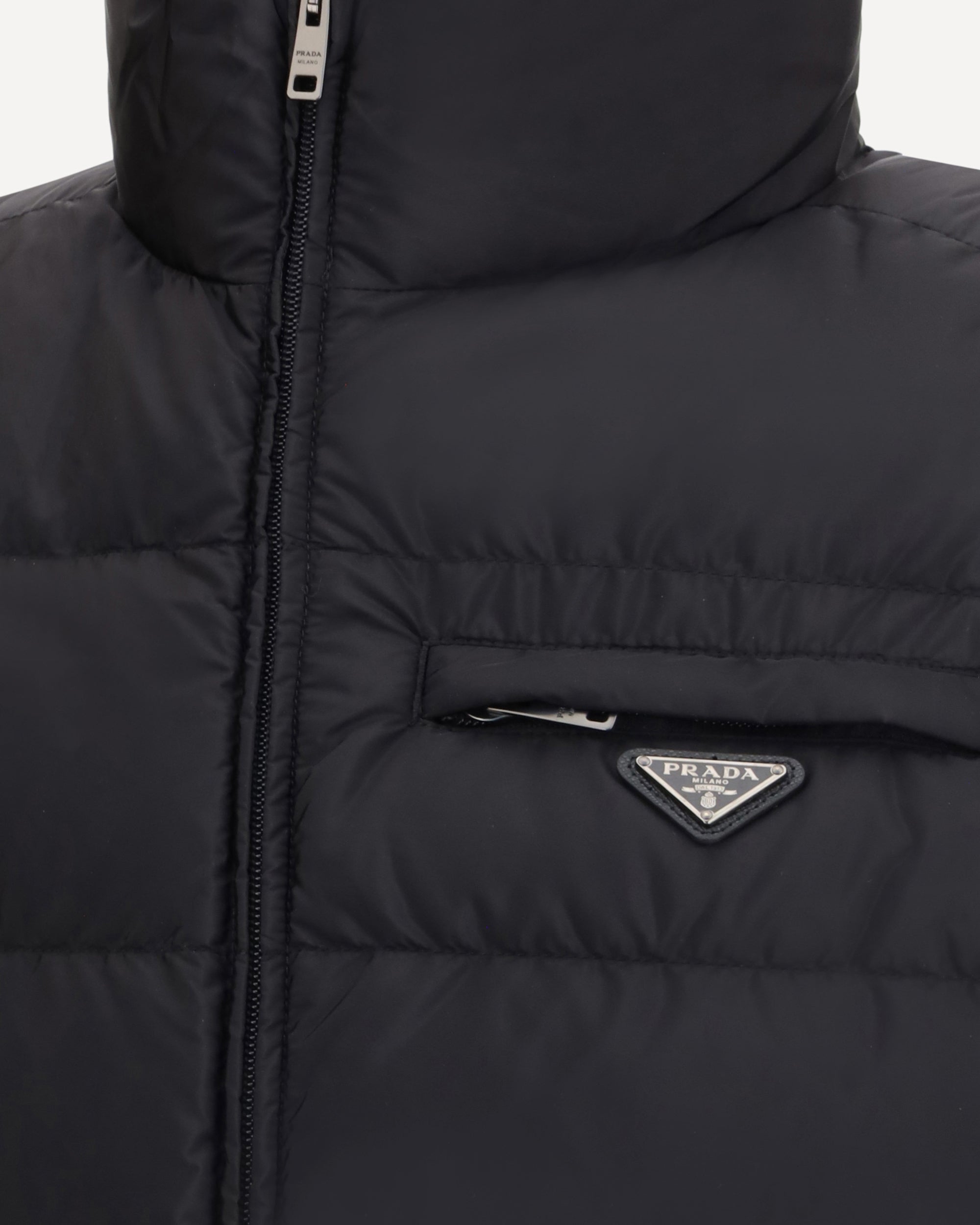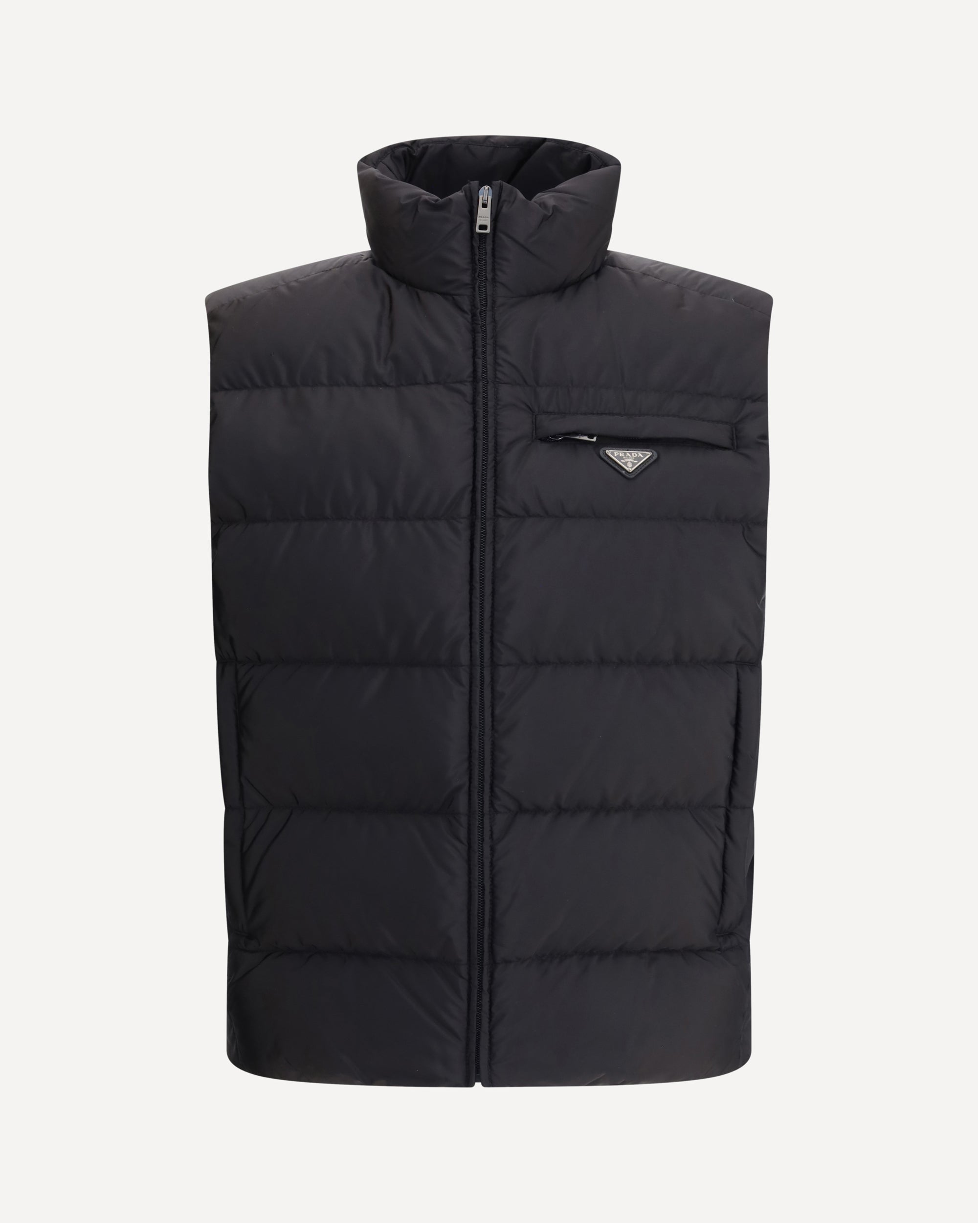 Prada's re-nylon Down Vest features a padded and quilted design, ideal for a functional and refined look. It features a zippered front closure, two zippered side welt pockets and the iconic triangular logo plaque applied to the front, a hallmark of the Maison.