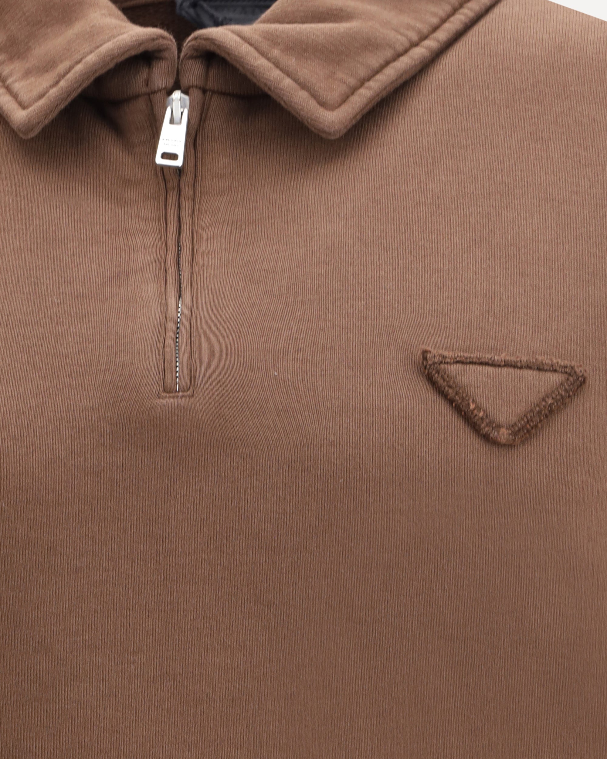 Cotton Sweatshirt by Prada with a polo-inspired design, featuring a classic collar and front zip fastening. Finished with ribbed cuffs and hem, it is embellished with the iconic triangular patch applied to the front. A casual and sophisticated garment, perfect for an essential yet distinctive style.
