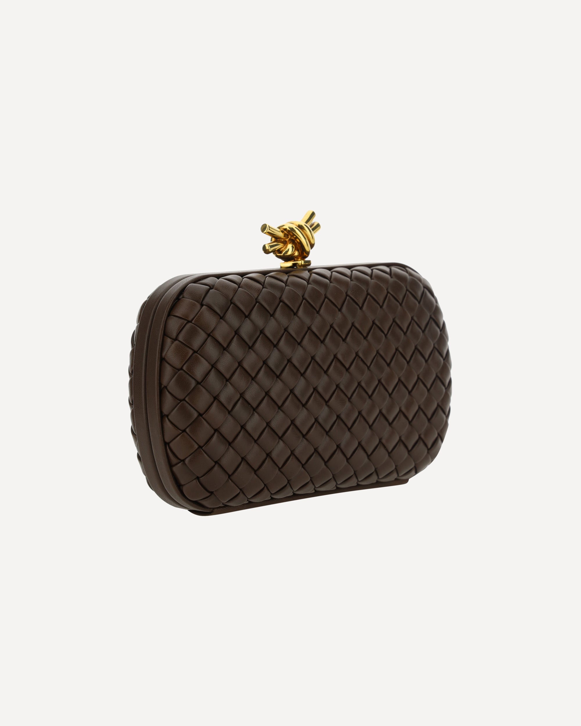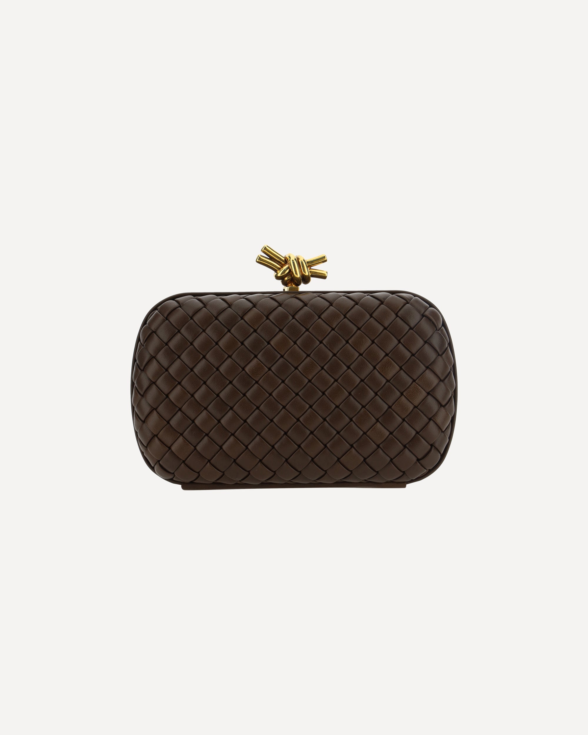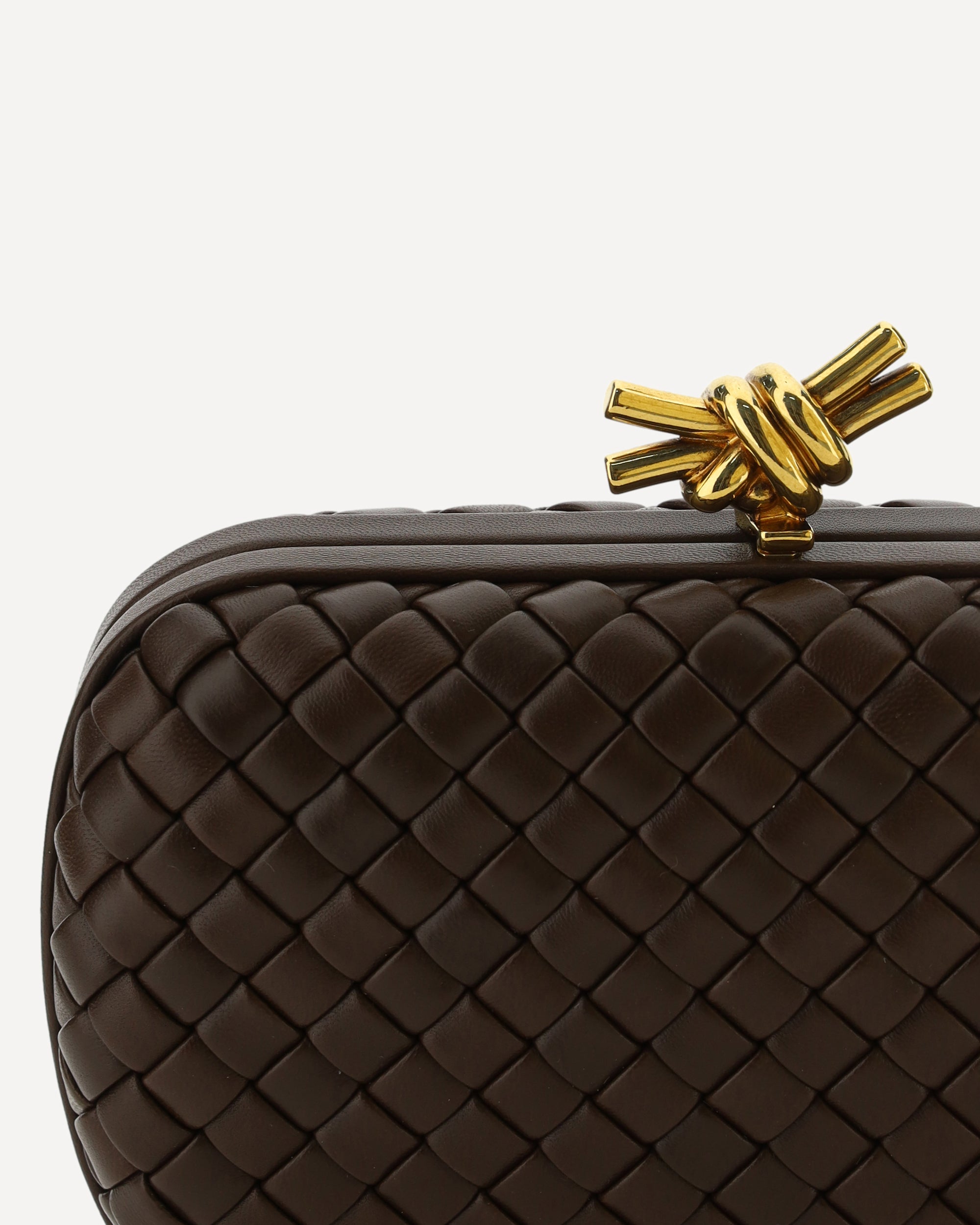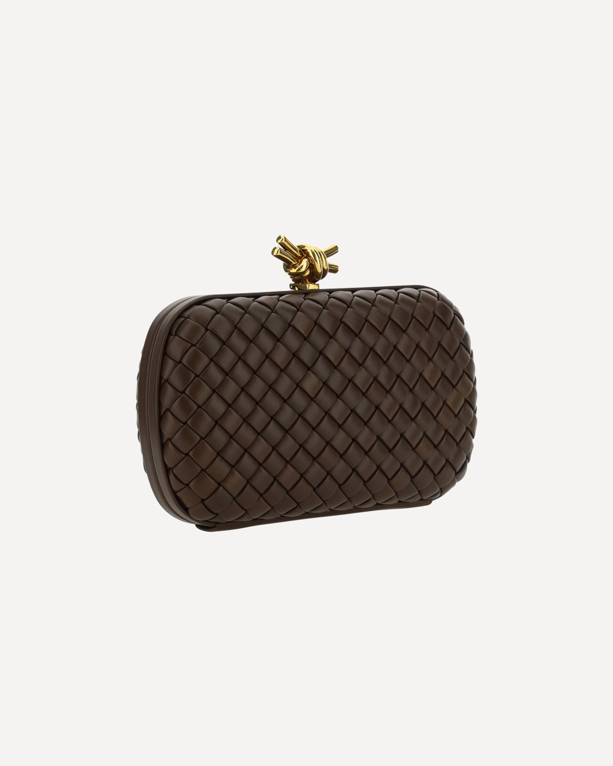 Lambskin Padded Clutch Bag by Bottega Veneta, iconic all-over woven pattern, magnetic top snap closure, knotted detail at top plated with antique brass, single interior compartment.