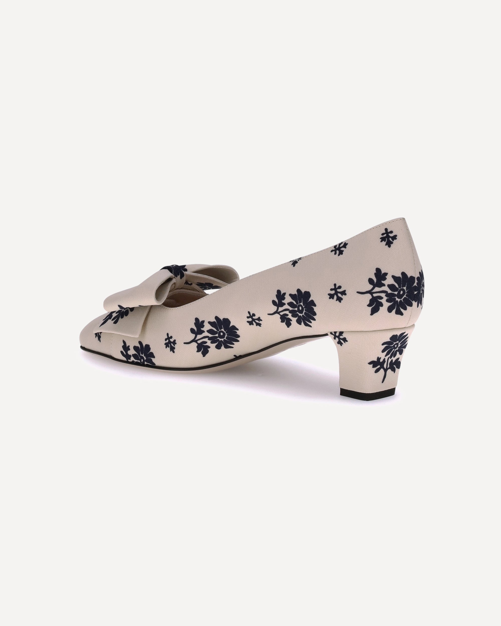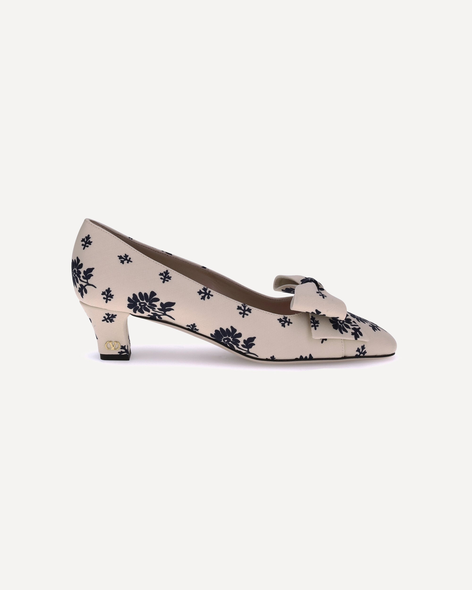 Valentino Garavani's Bowow Pumps, made of fine 100% silk moiré fabric with a floral print, combine elegance and sophistication. The bow detail adds a feminine touch, while the heel is embellished with the iconic Signature VLogo in brass with antique-effect finish. The custom floral-patterned footbed completes the design, lending a delicate and sophisticated note.