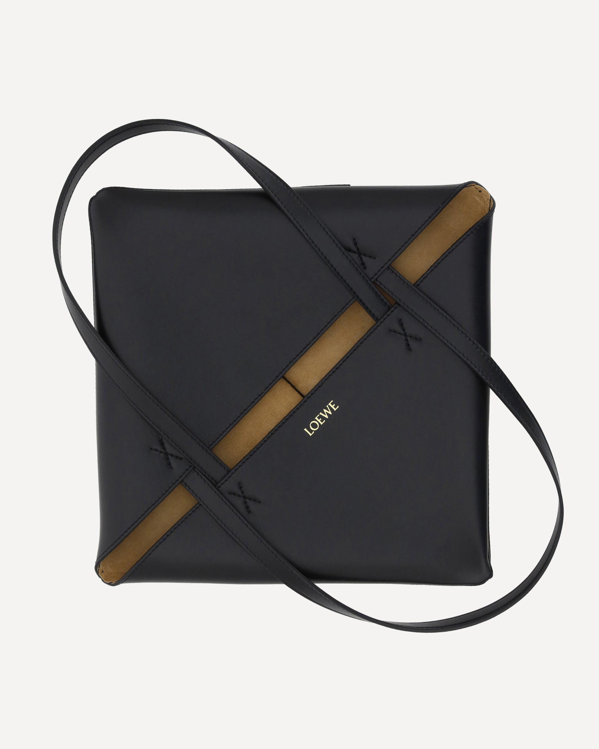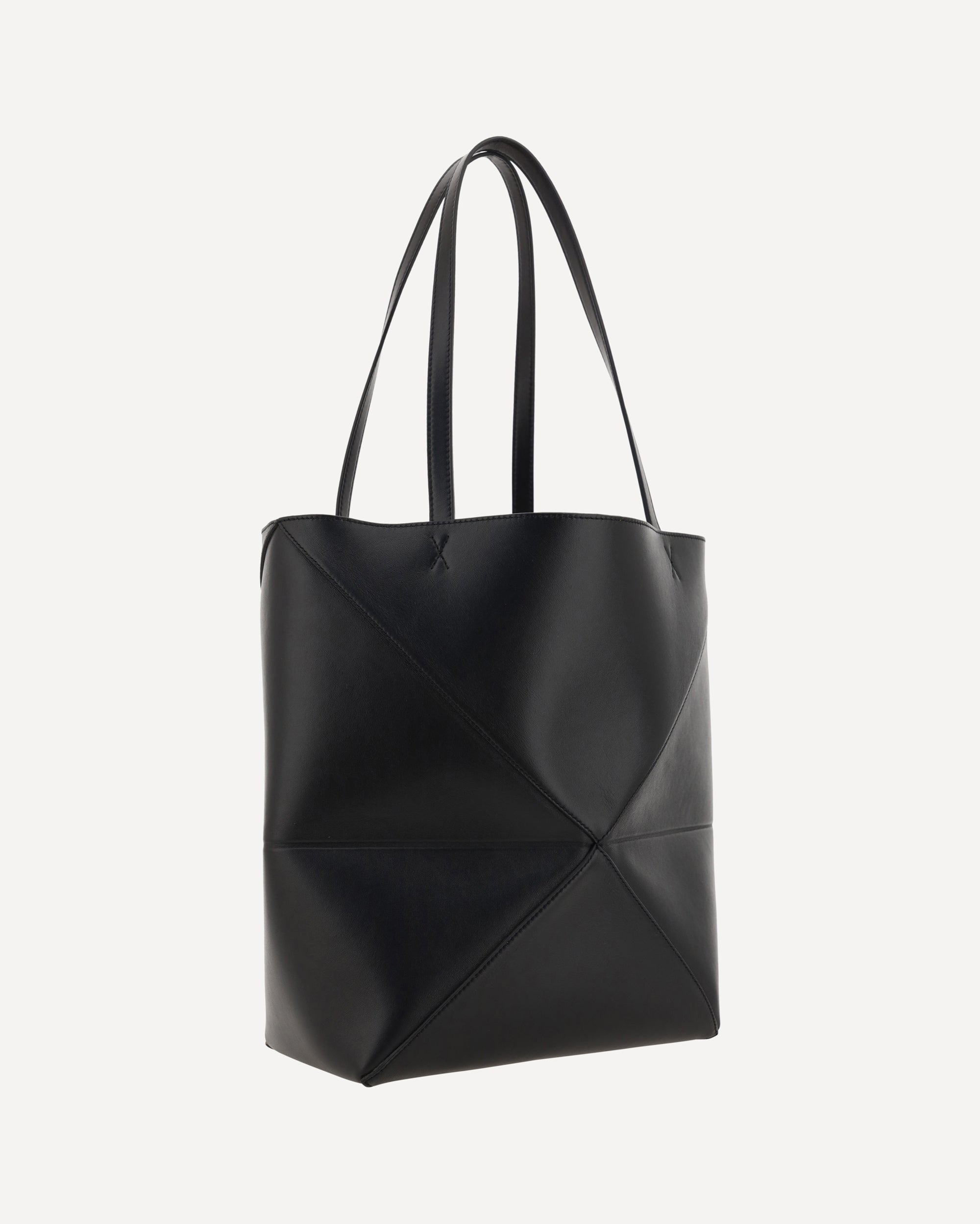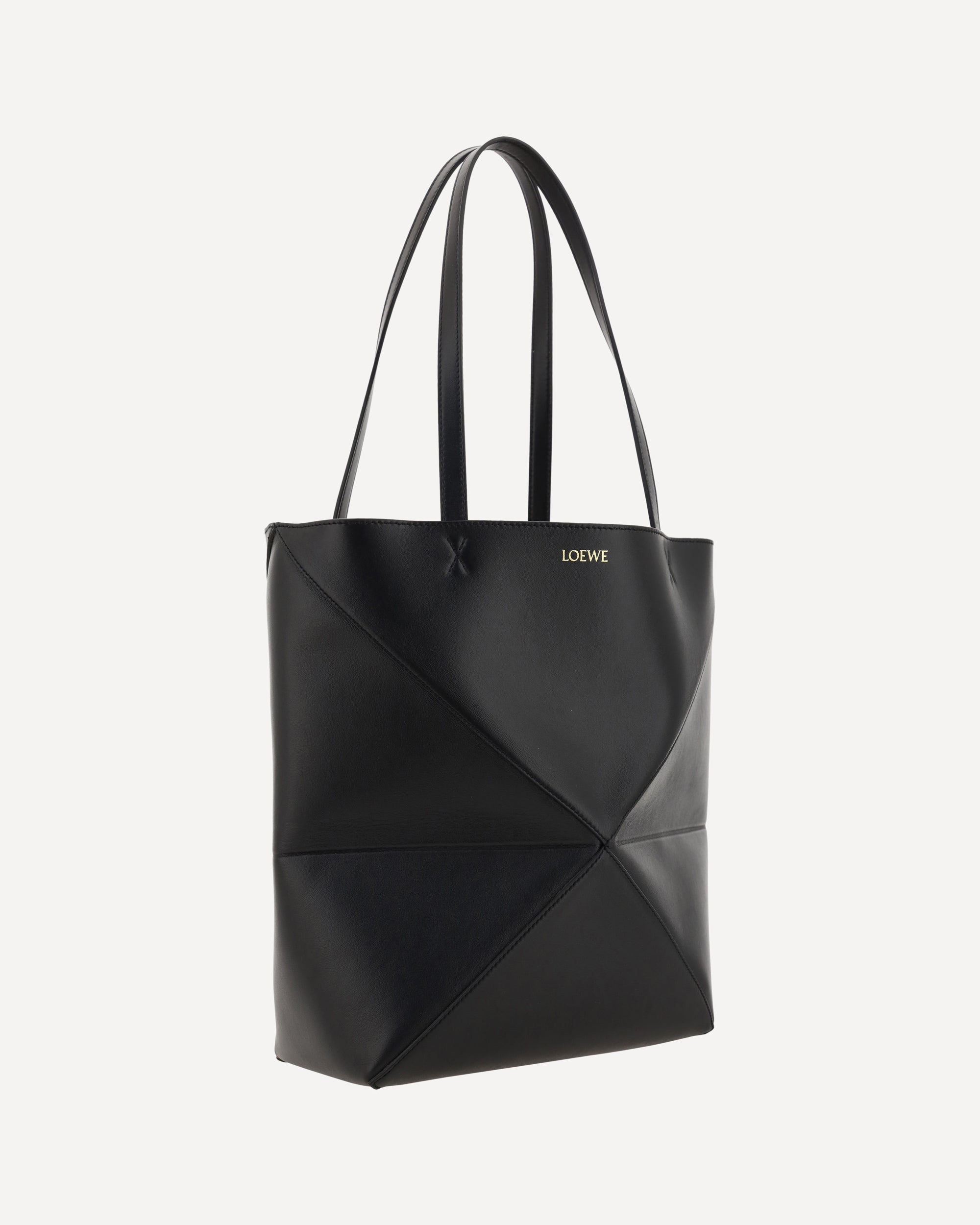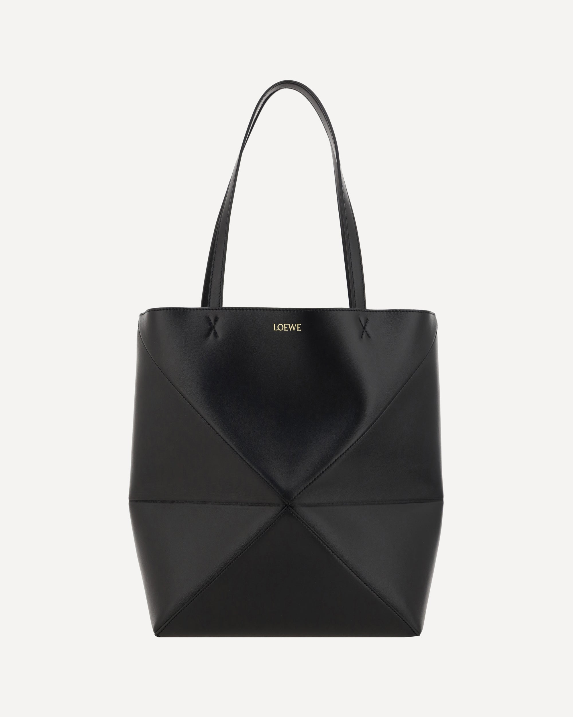 Loewe's Puzzle Fold Tote Bag is crafted from high-quality smooth leather, with an innovative design that features iconic geometric panels that allow the bag to fold in on itself for added versatility. The two wide top handles ensure comfortable carry, while contrasting topstitching adds a touch of sophistication. The brand's logo, press-stamped on the front, lends an additional distinctive detail. An accessory that combines functionality and contemporary design with elegance.