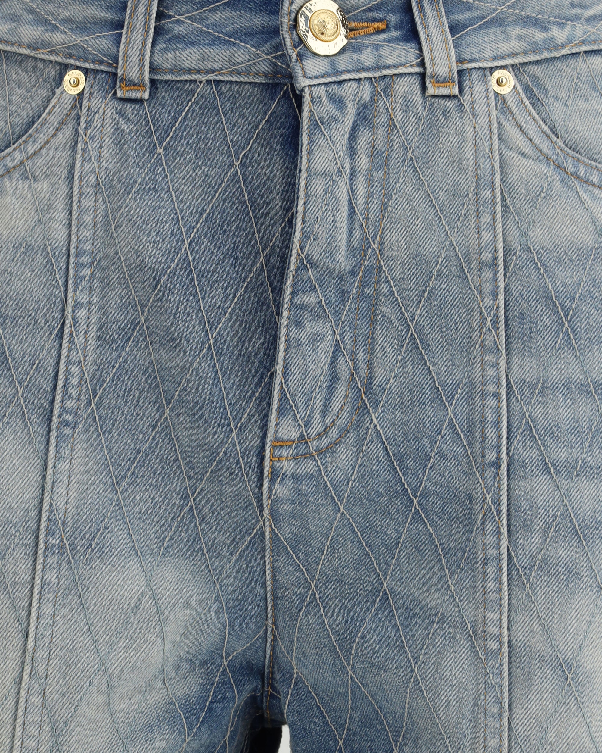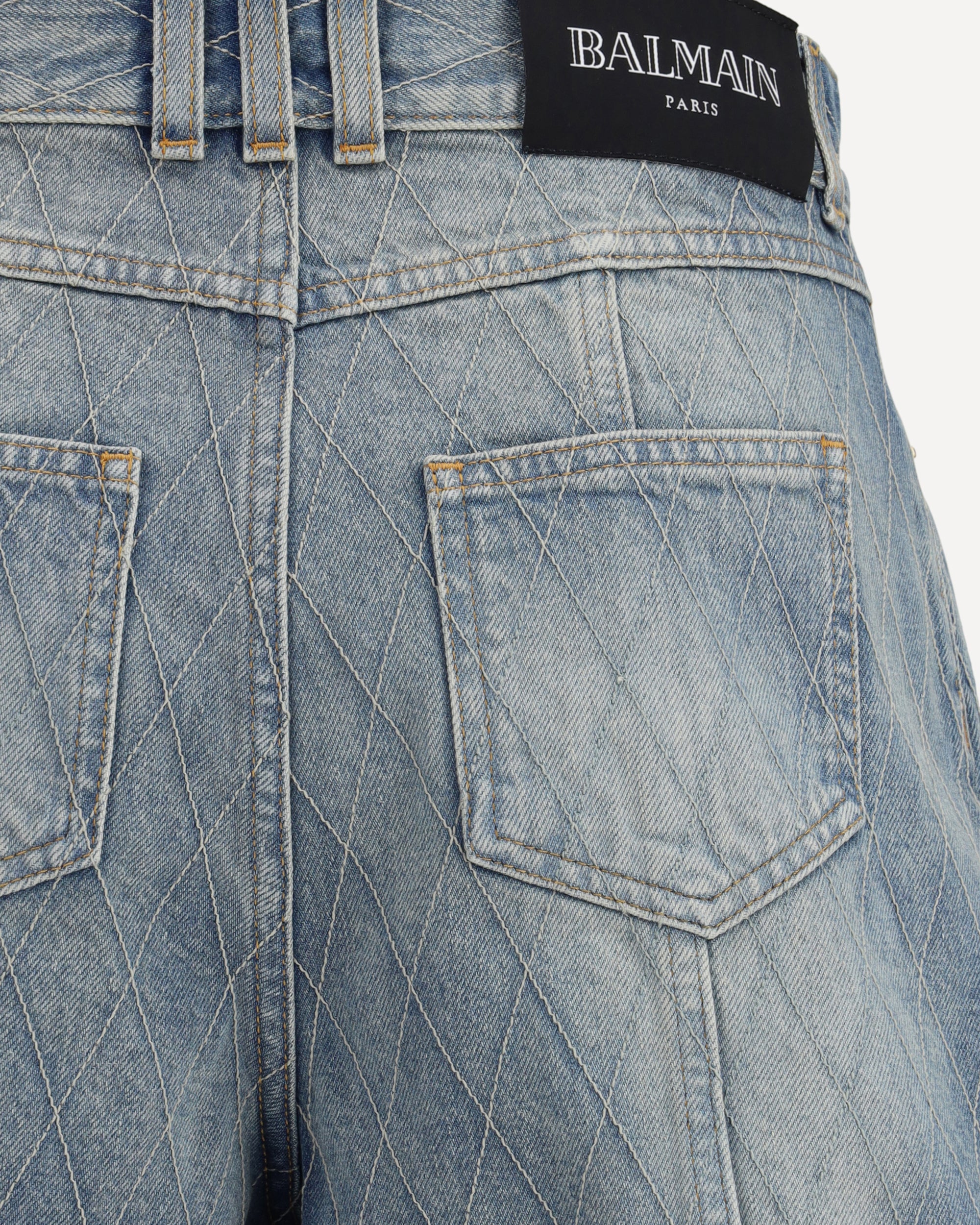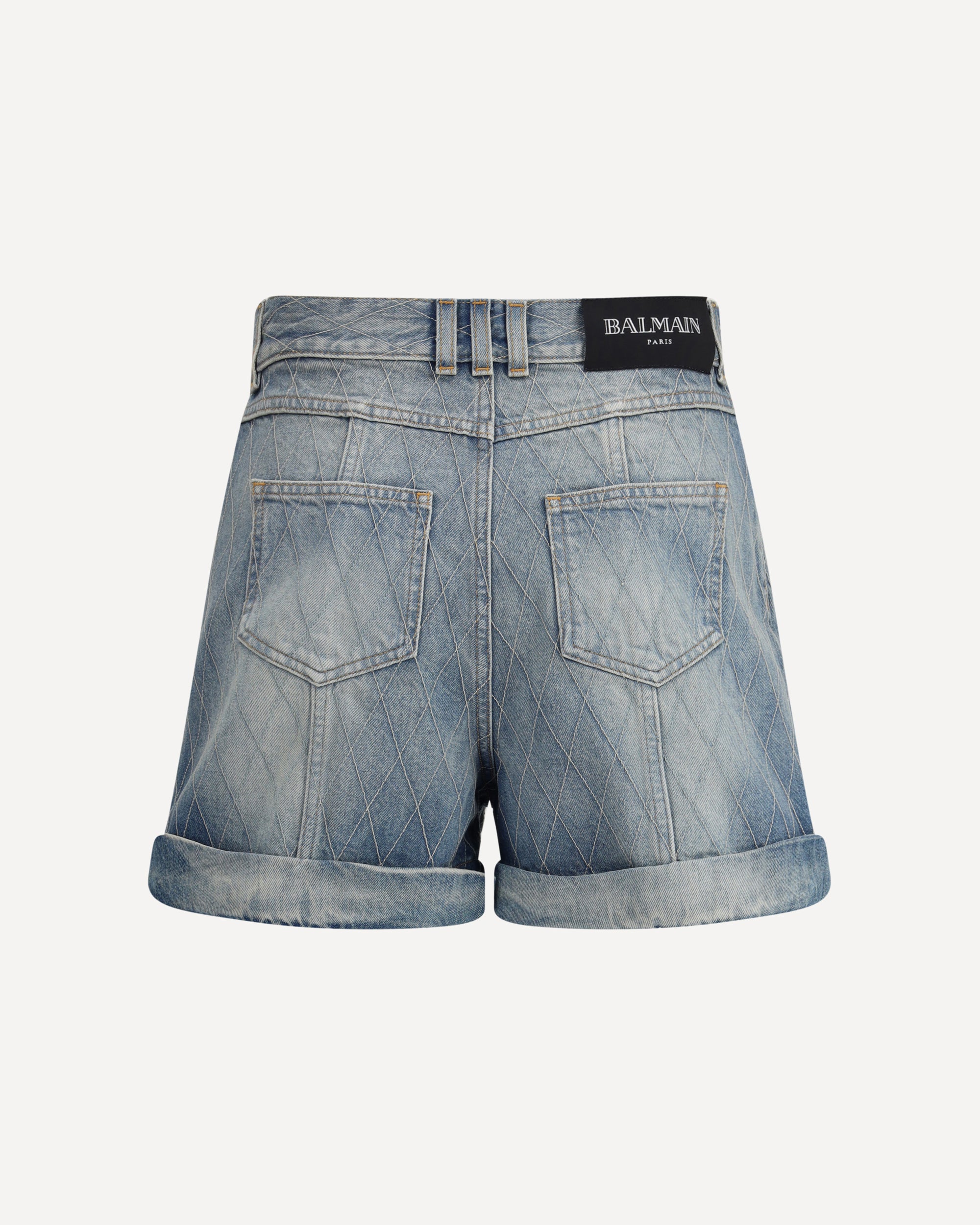 Balmain's Denim Shorts combine a bold aesthetic with iconic details. Featuring a refined diamond-stitched pattern, they feature a waistband with belt loops and the unmistakable triple back loop. The front closure is embellished with metal "Gold and Silver Coin" buttons and a zipper under the flap. Completing the design are two knight pockets on the front for a bold and recognizable look.