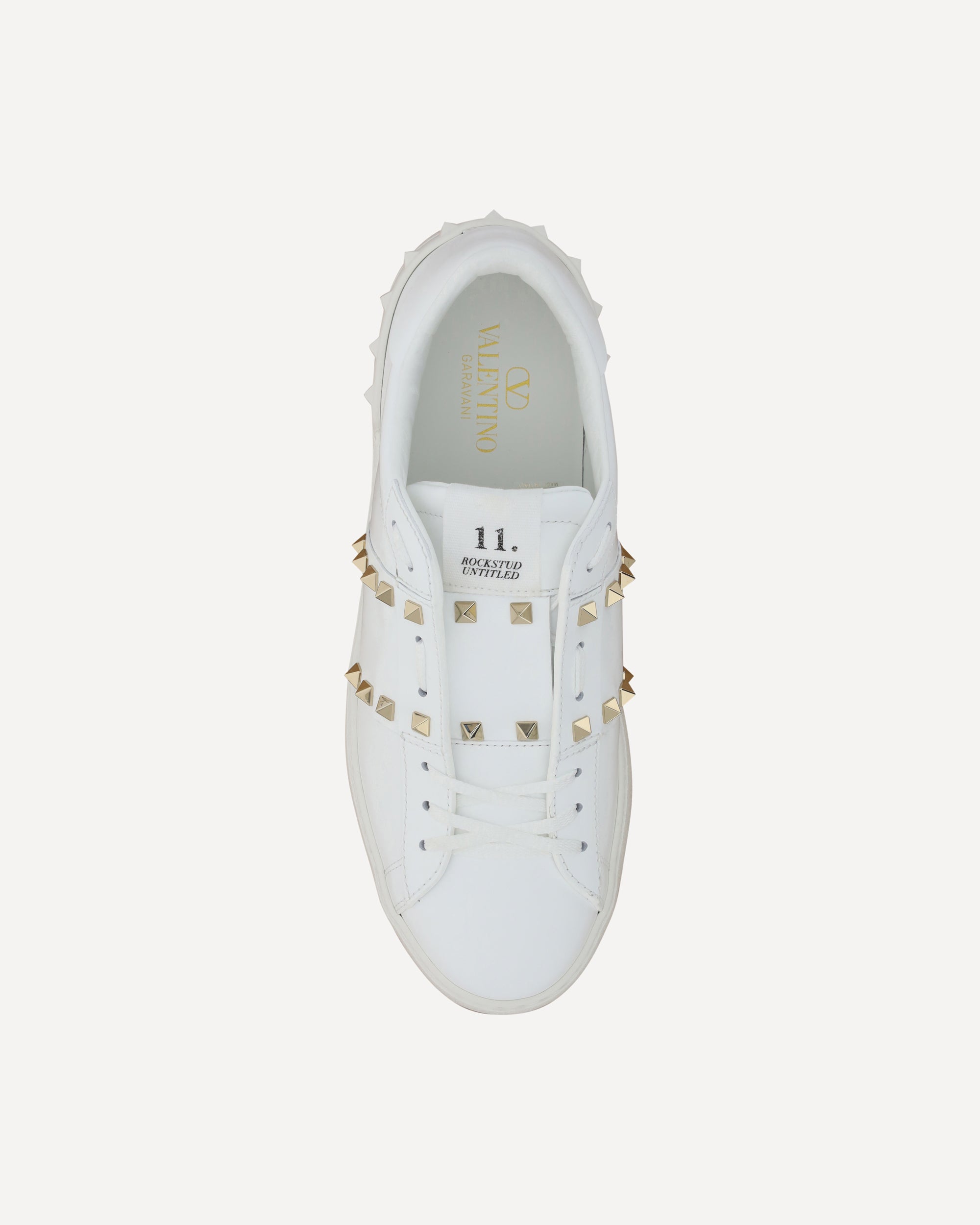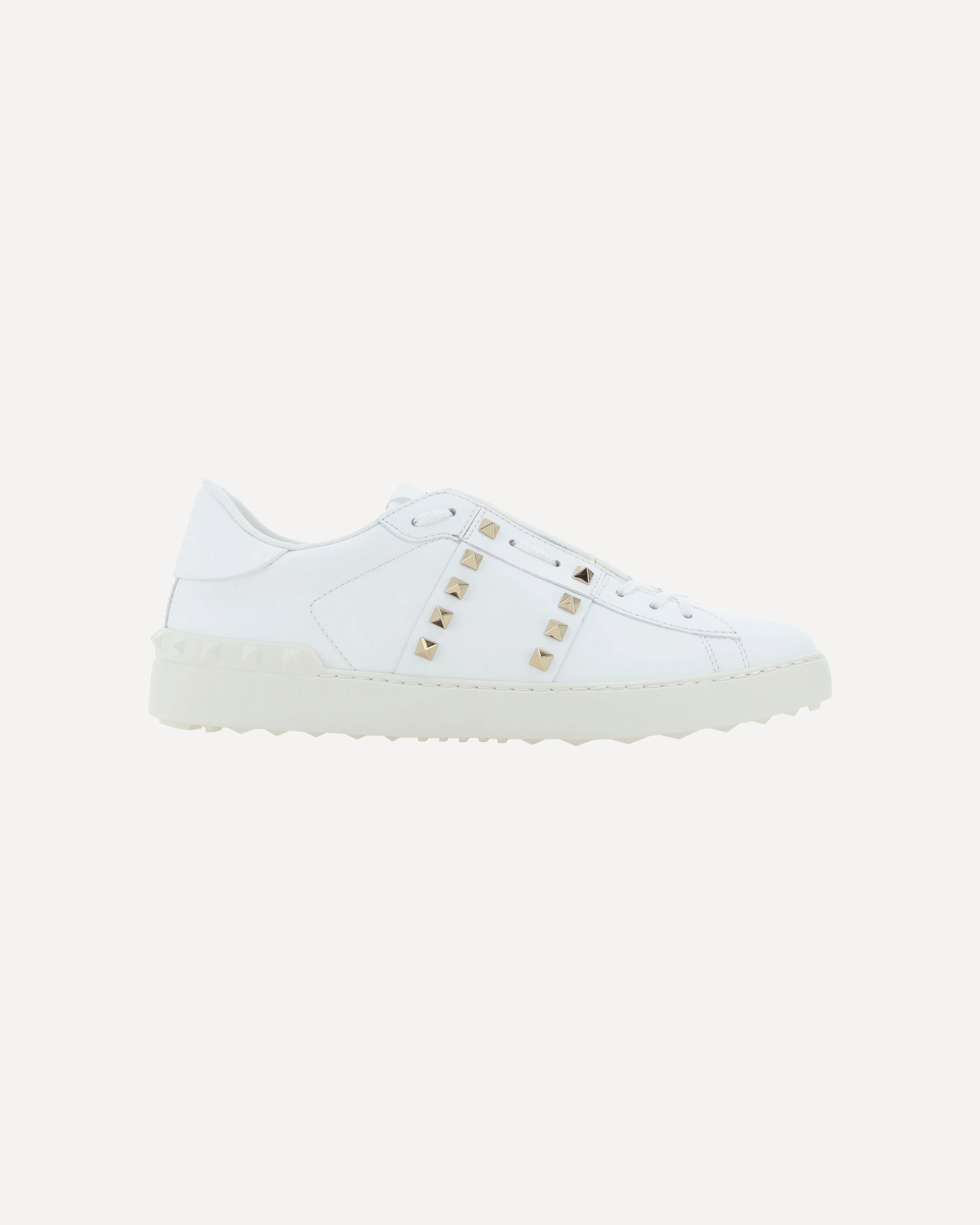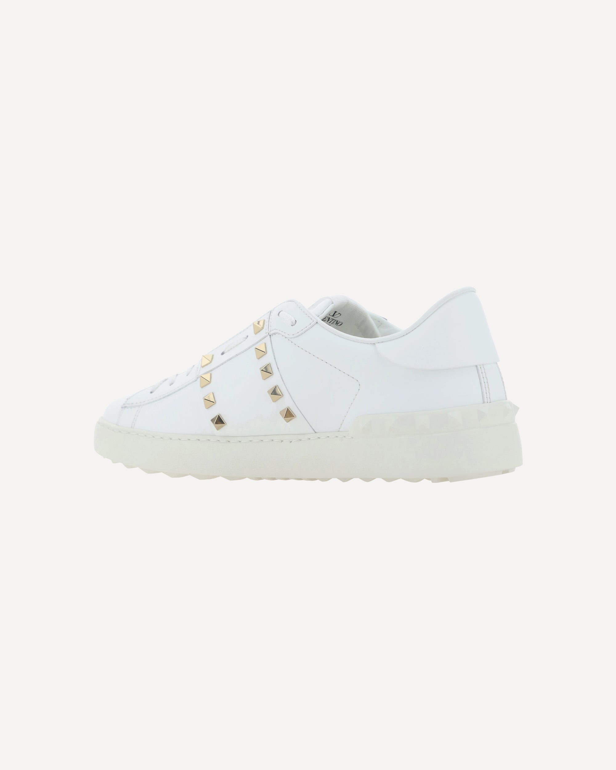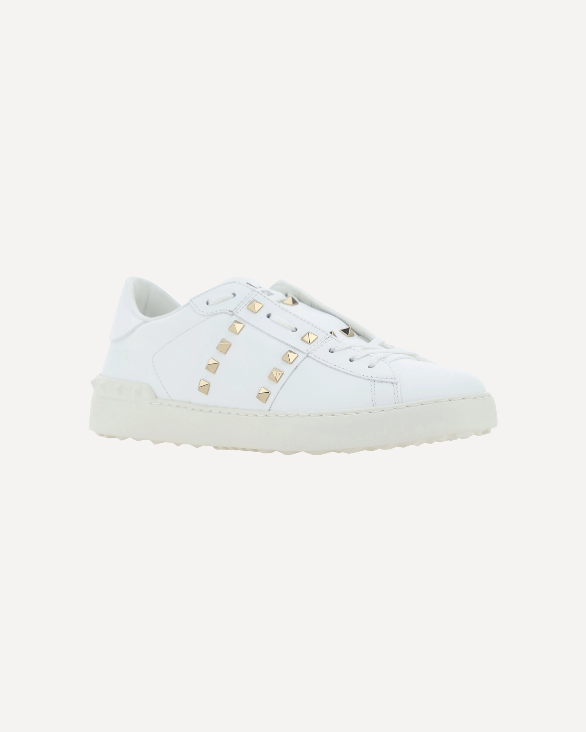 Leather Rockstud Sneakers by Valentin Garavani, slip-on style, flat sole with iconic studs on heel and perimeter of upper, iconic contrasting monogram on tongue, iconic studs applied on side panels, logoed insole.