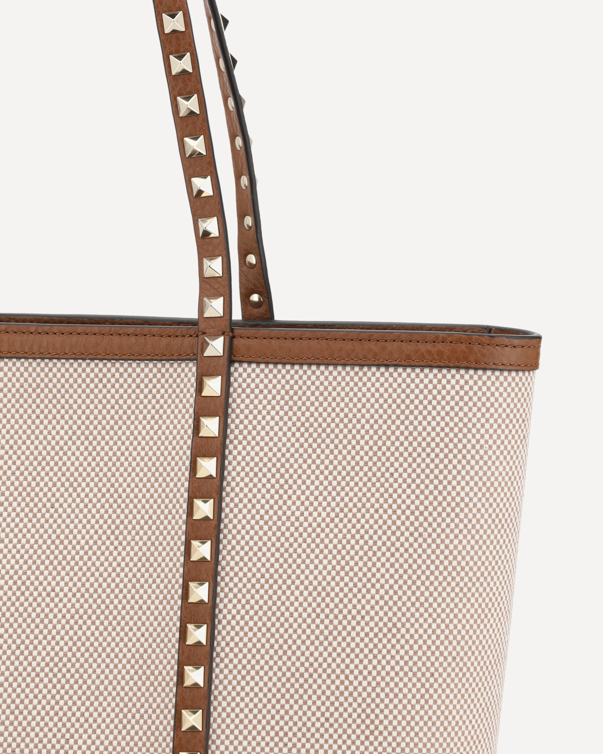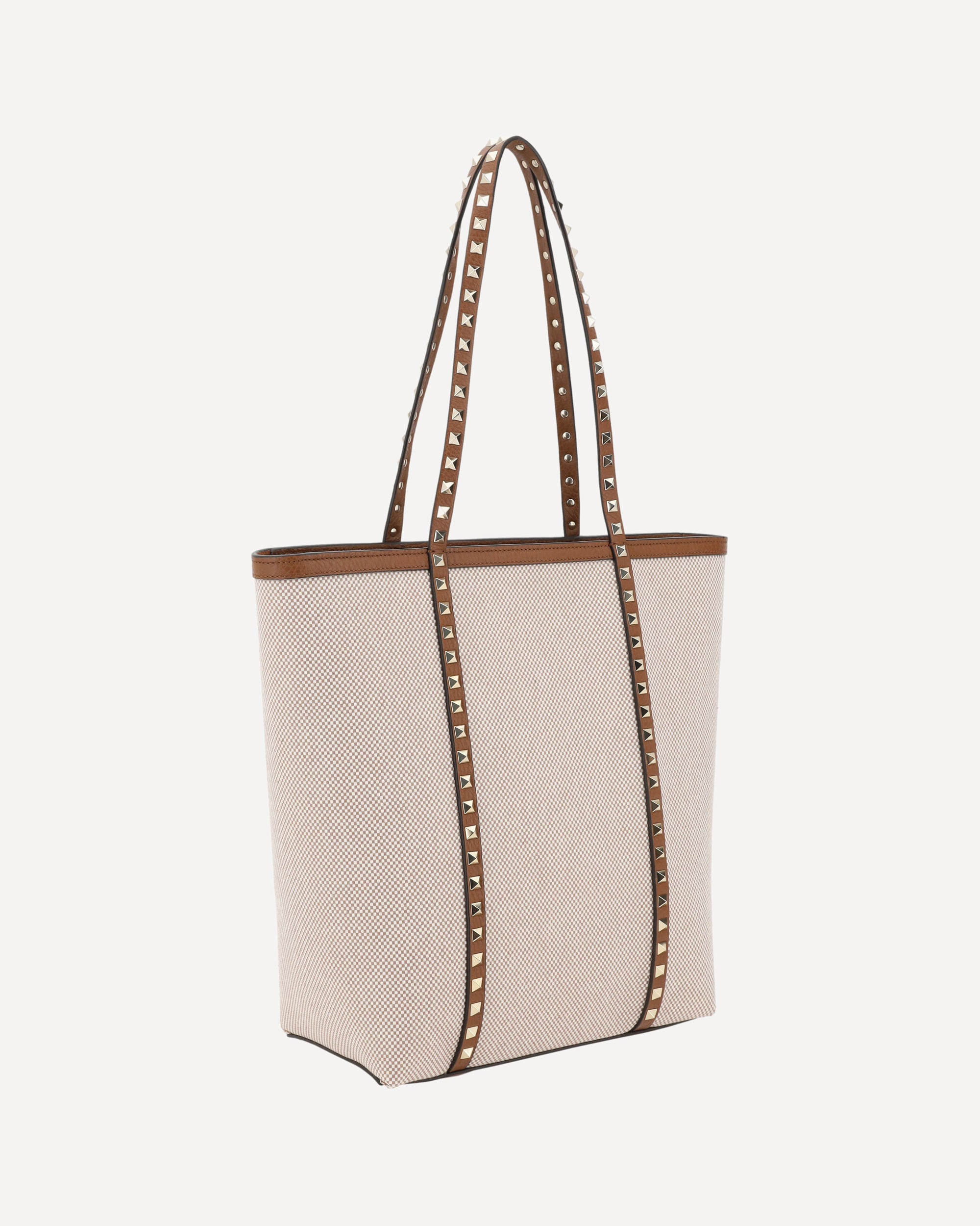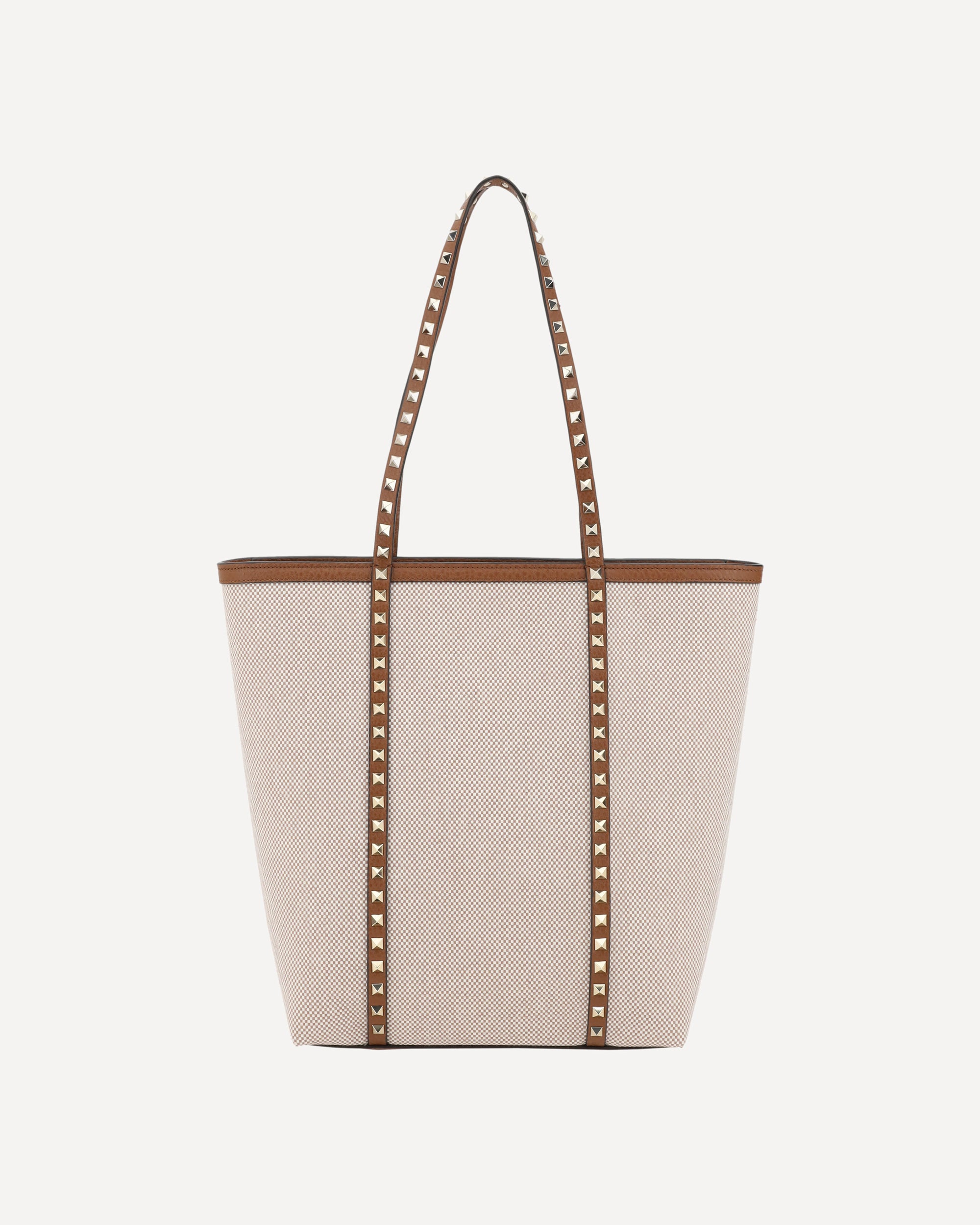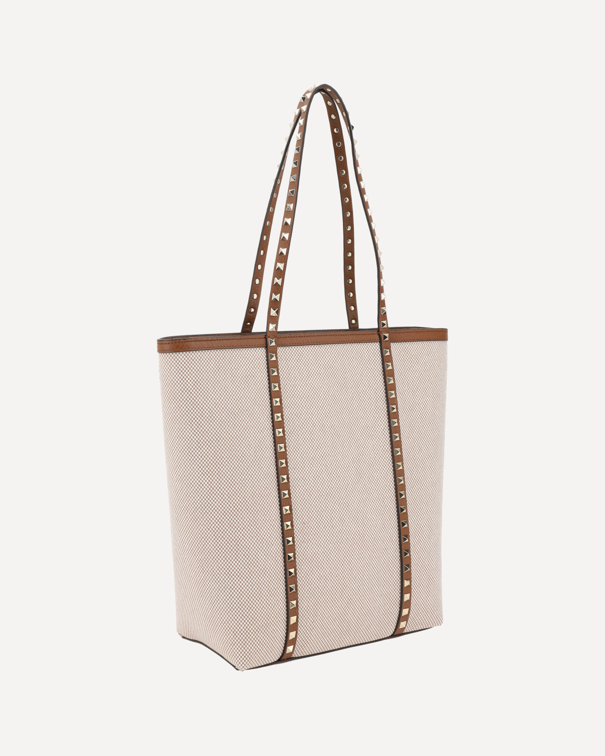 The Valentino Garavani canvas Tote Bag features two flat handles that extend onto the front and back panels, where the iconic Rockstud studs, the brand's distinctive symbol, are applied. The minimalist design is completed by a single internal compartment, which adds practicality without sacrificing style. Perfect for those looking for an elegant and contemporary accessory, with a touch of boldness.