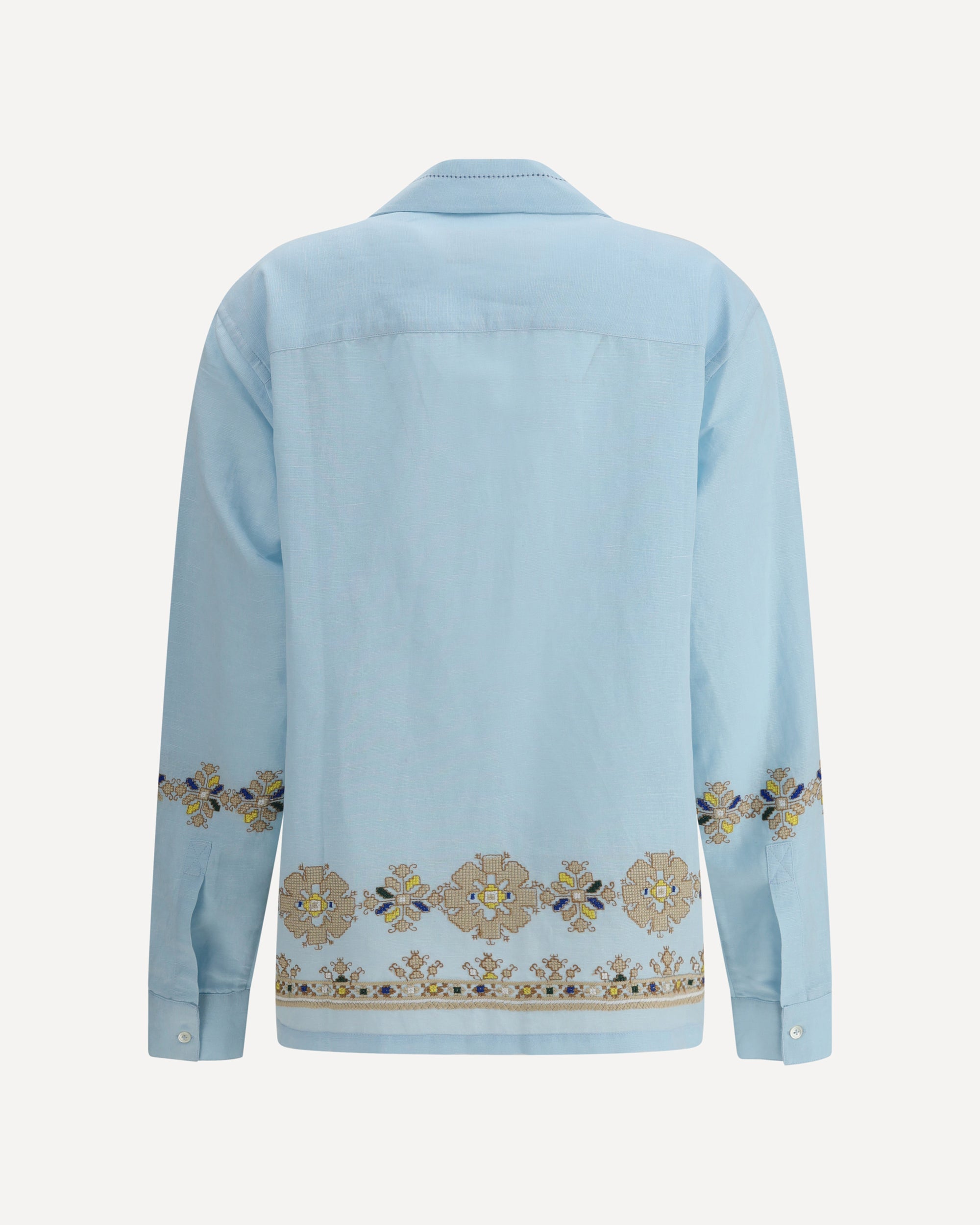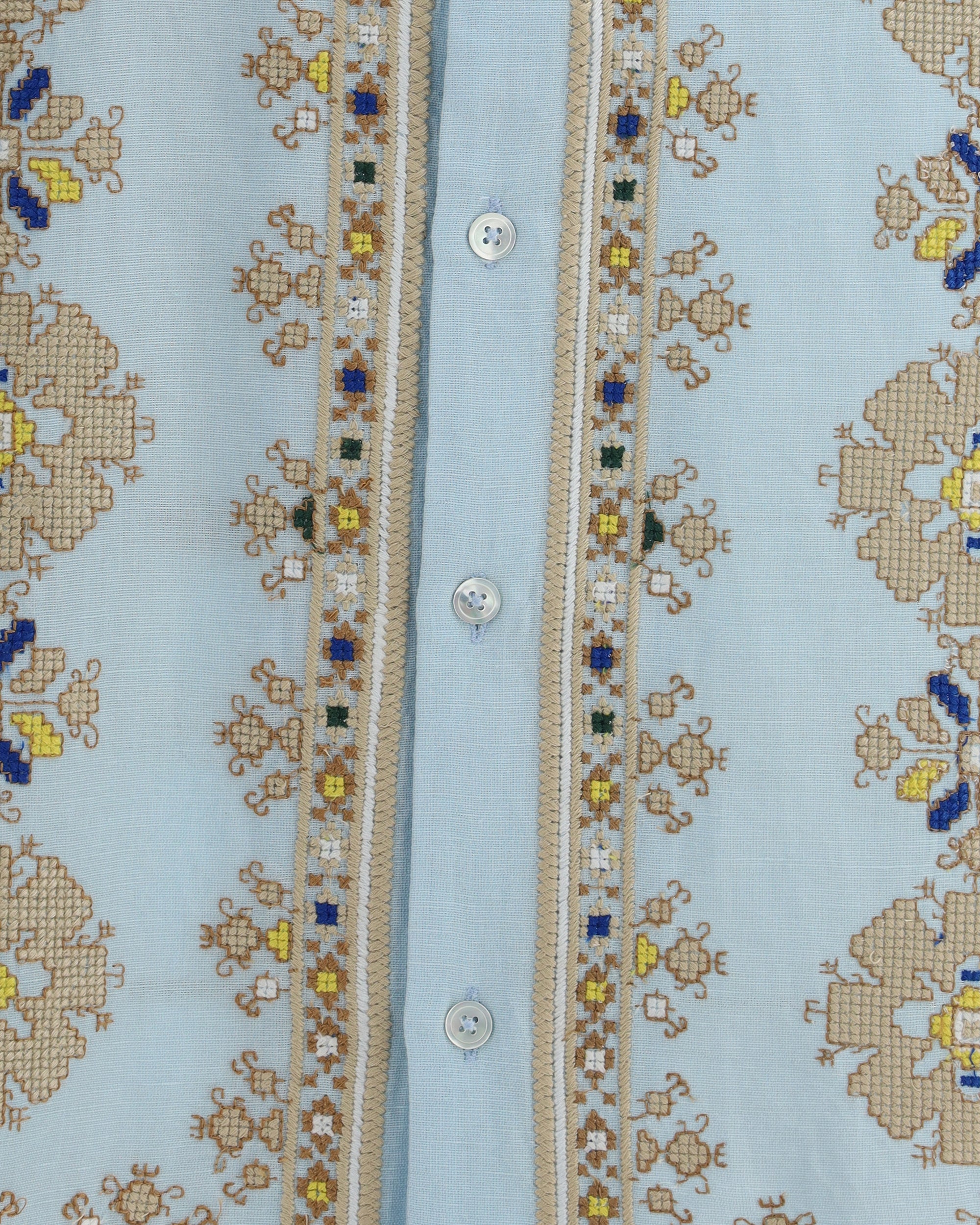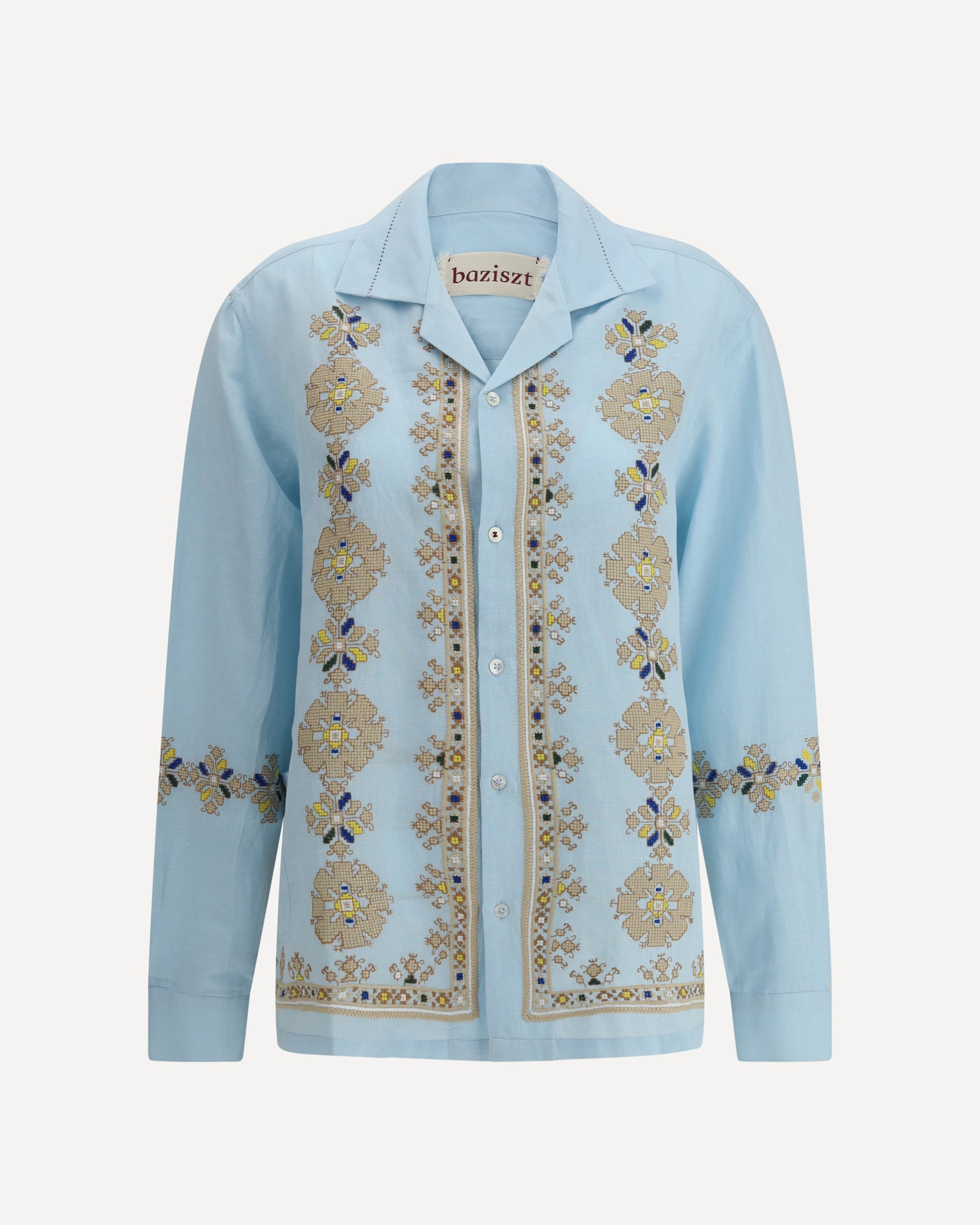 The Roses Shirt by Baziszt is a garment that stands out for its mix of elegance and delicacy. With a classic collar and front button closure, the shirt features a clean, refined design that is easily adaptable to a variety of styles. What makes it truly special, however, are the cross-stitch embroideries, both on the front and back, which give the garment a unique texture and handcrafted touch. The floral details, thanks to the cross-stitch technique, create a charming and feminine visual effect. The two side patch pockets complete the look, adding a practical and somewhat casual note without sacrificing its elegance.