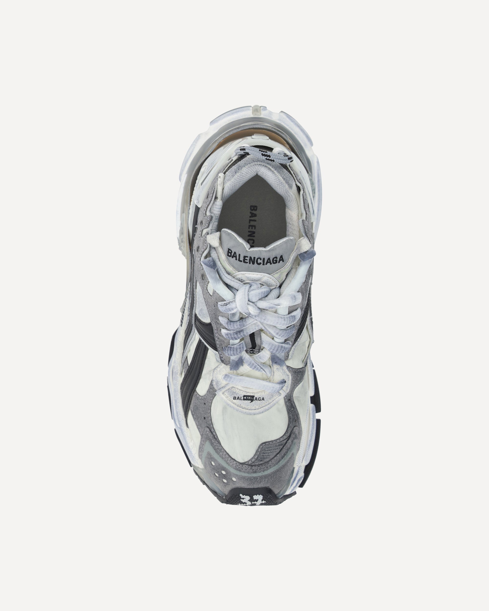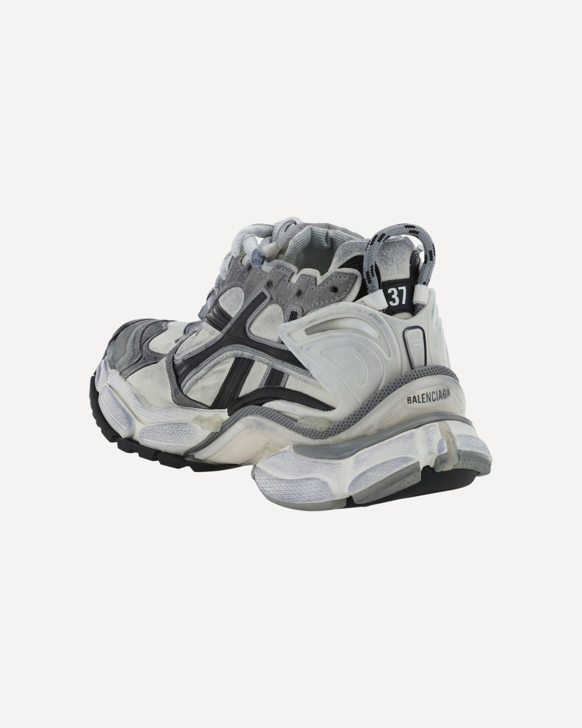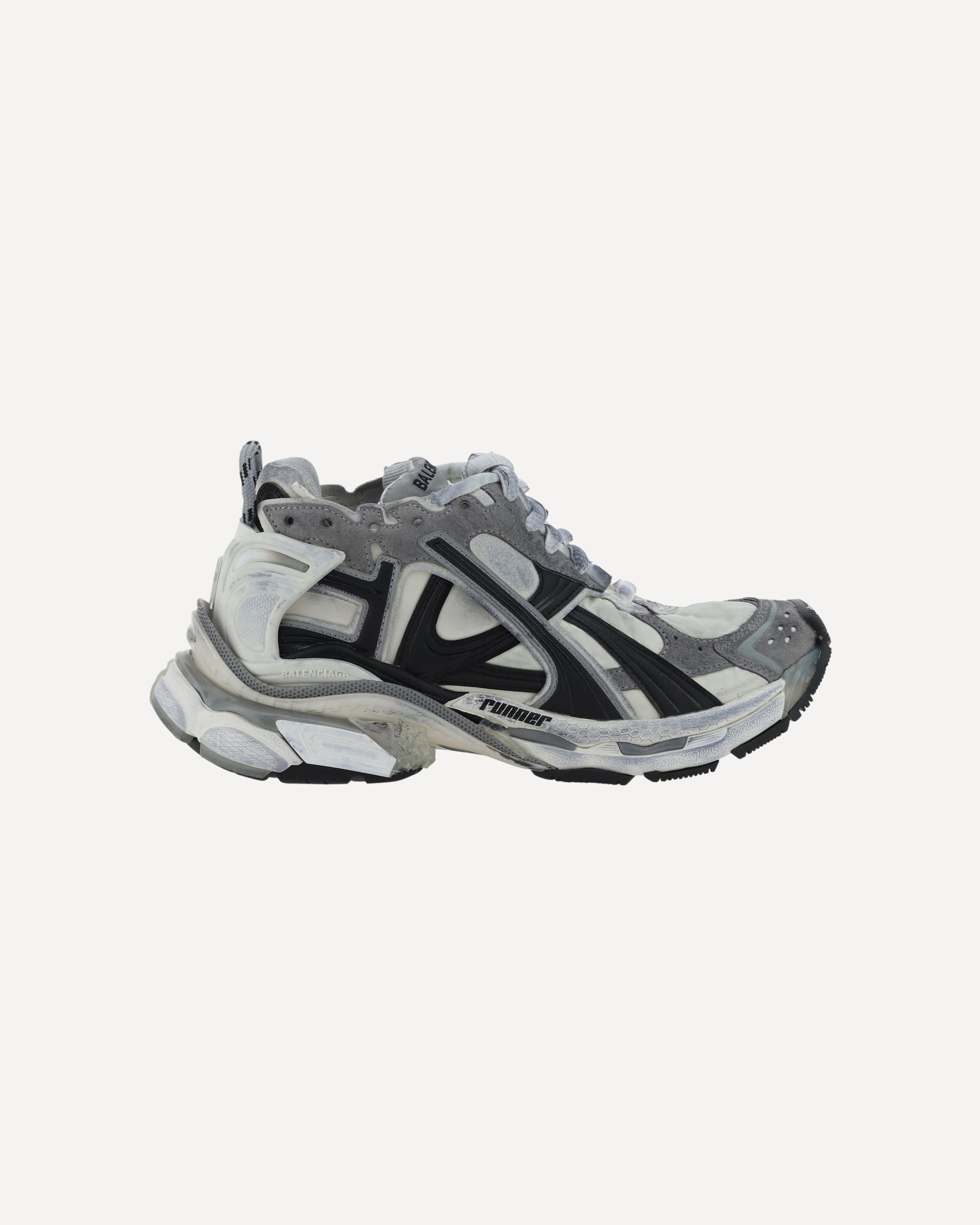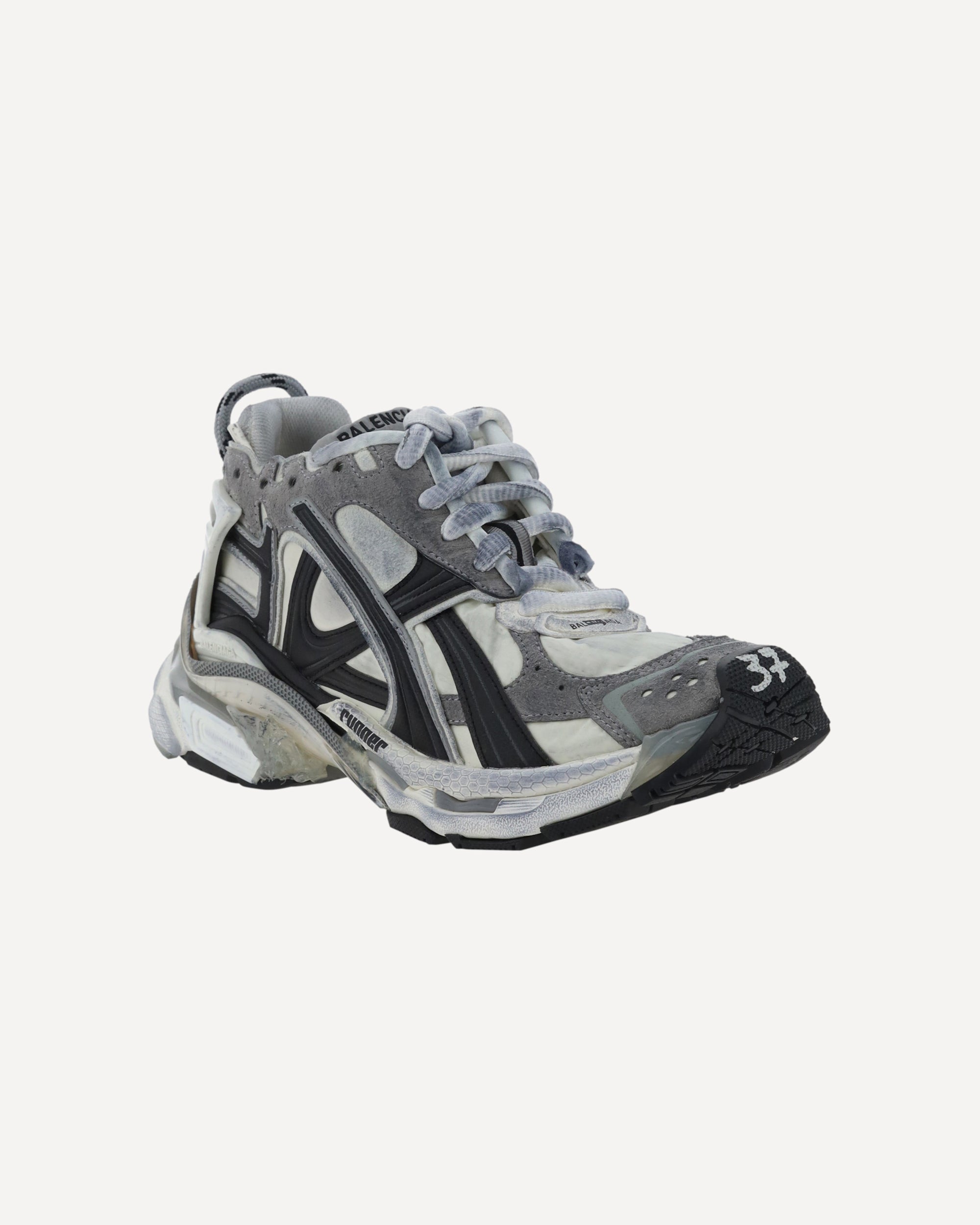 Runner Sneakers by Balenciaga, structured platform sole, suede details woven panel design, lace-up front closure, embroidered size number at toe, contrasting embroidered iconic brand monogram label on front tongue, logo on sole and insole.