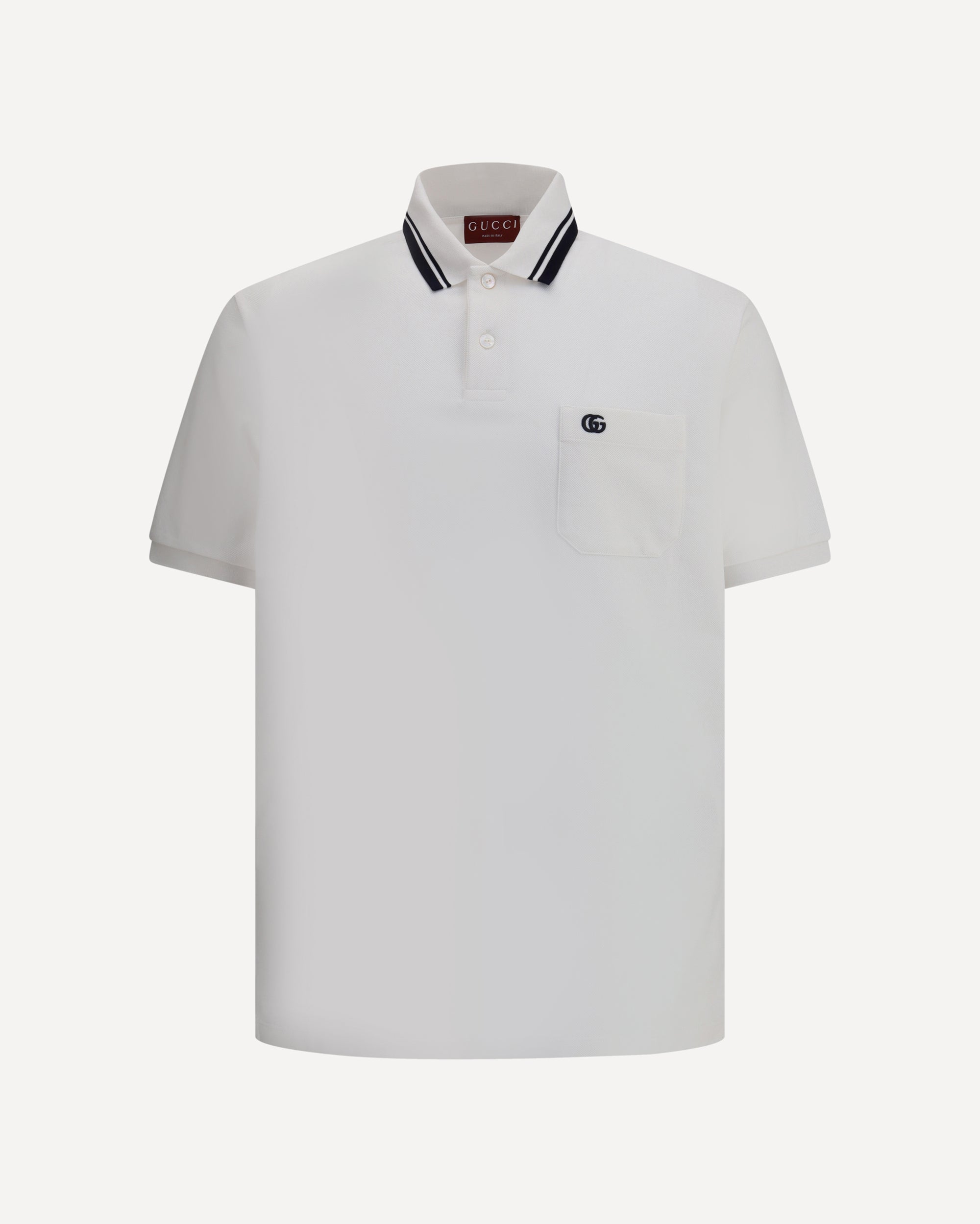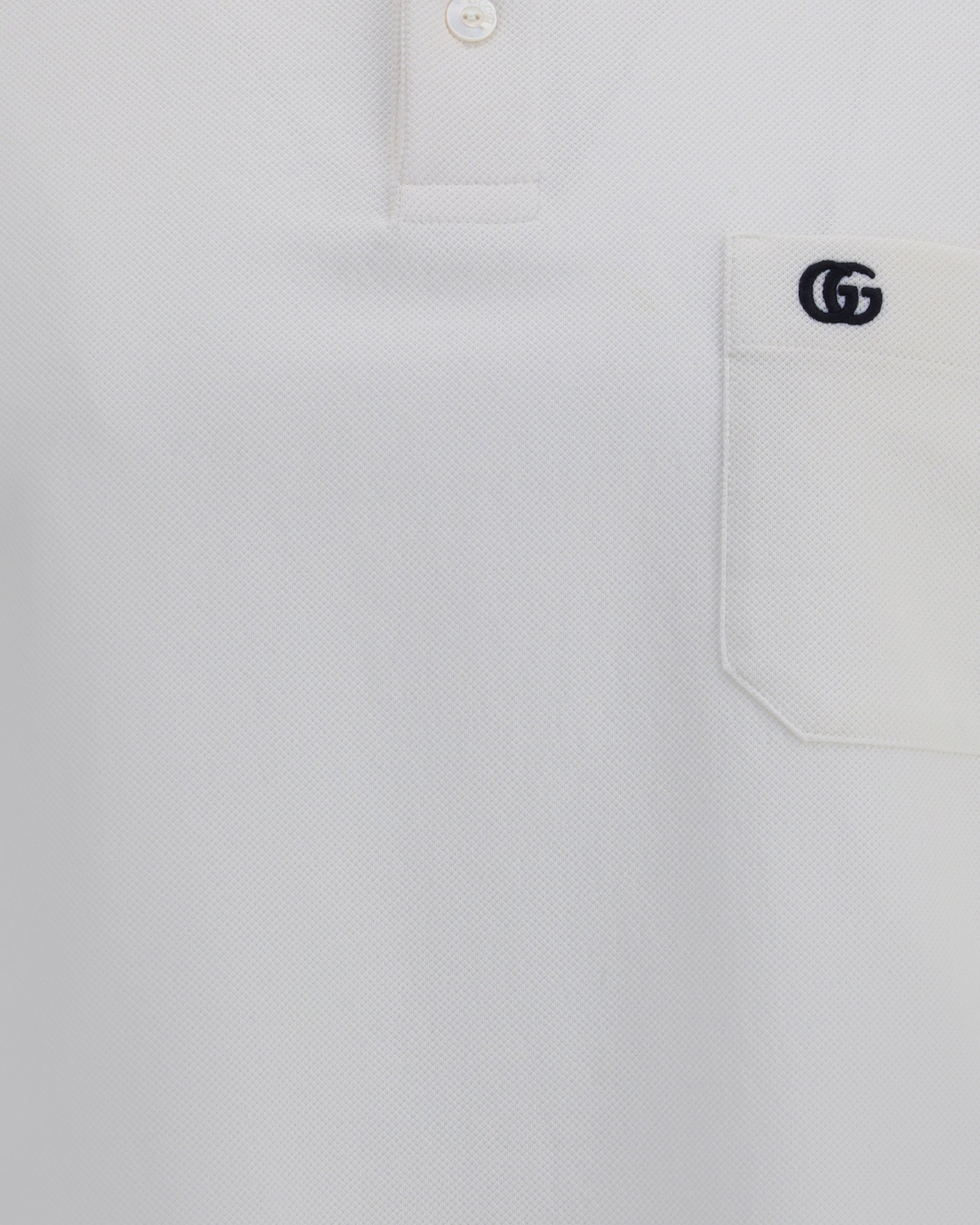 Cotton Polo Shirt by Gucci, perfect for a casual yet detail-oriented style. It features a classic collar with contrasting piping, buttons on the front and a logoed welt pocket applied to the chest. Side slits provide added comfort and freedom of movement. An iconic garment that combines elegance and versatility, signed by the unmistakable Gucci aesthetic.