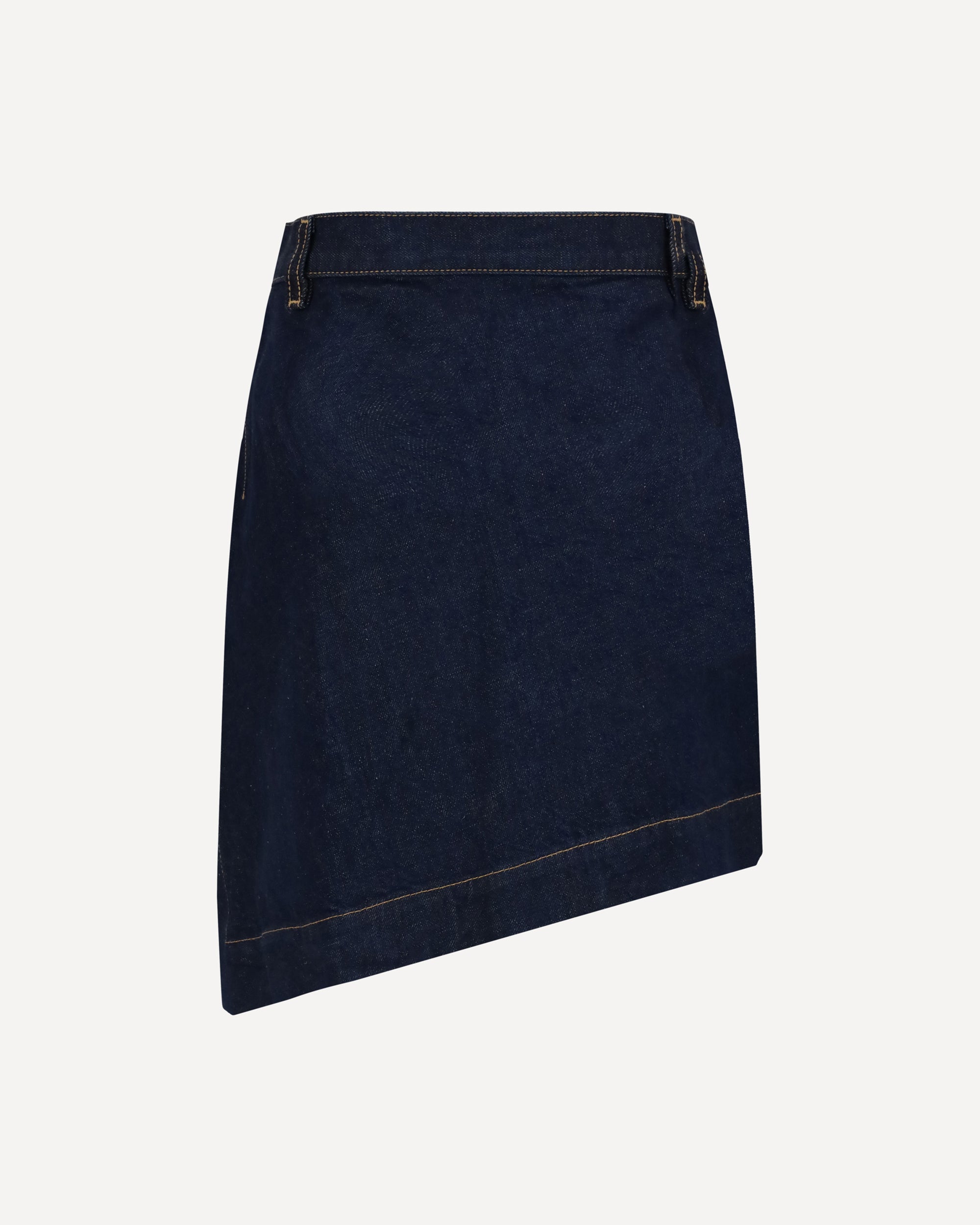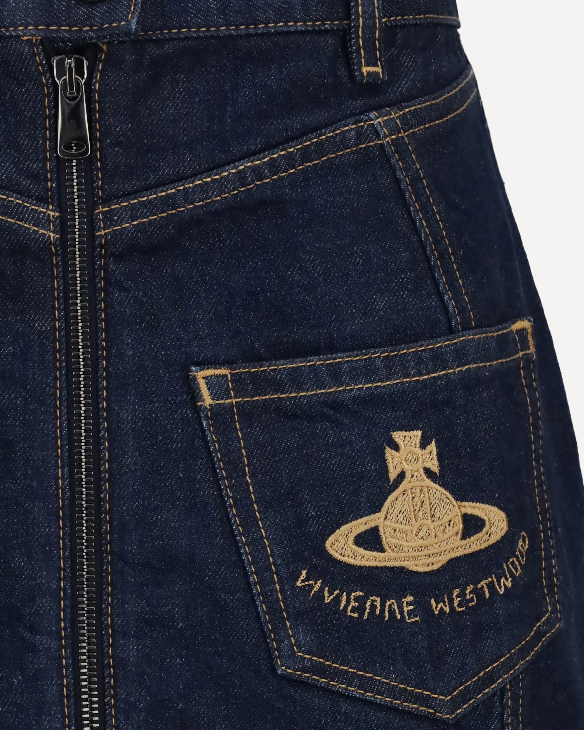 Vivienne Westwood's denim Miniskirt is a bold, modern design featuring an asymmetrical hemline that accentuates its personality. The full-length front zipper and button closure adds functionality and style, while the two front patch pockets and waistband loops offer practicality and versatility. The embroidered logo on the front gives the design a distinctive touch, making this mini skirt a must-have for those who love a contemporary, characterful look.