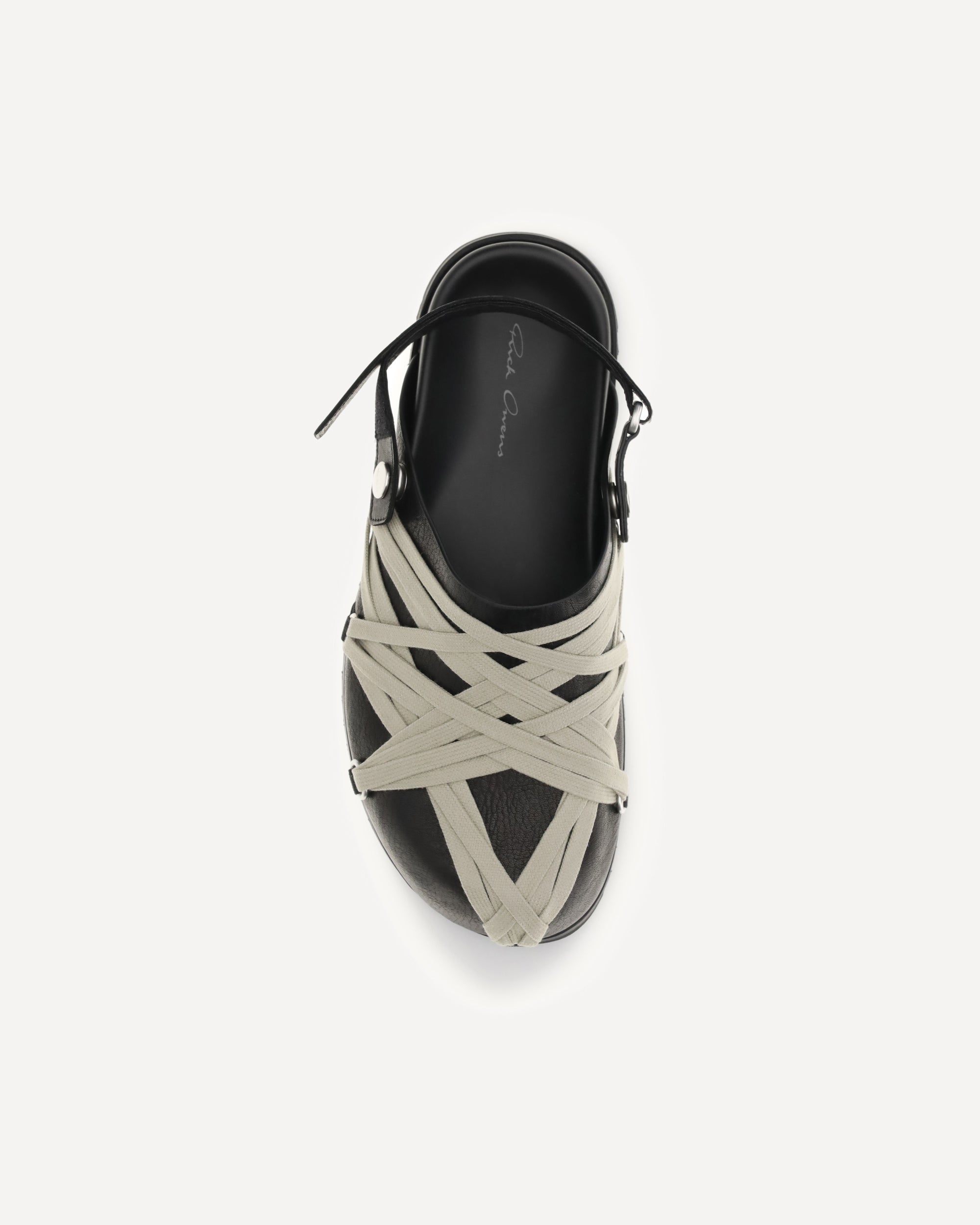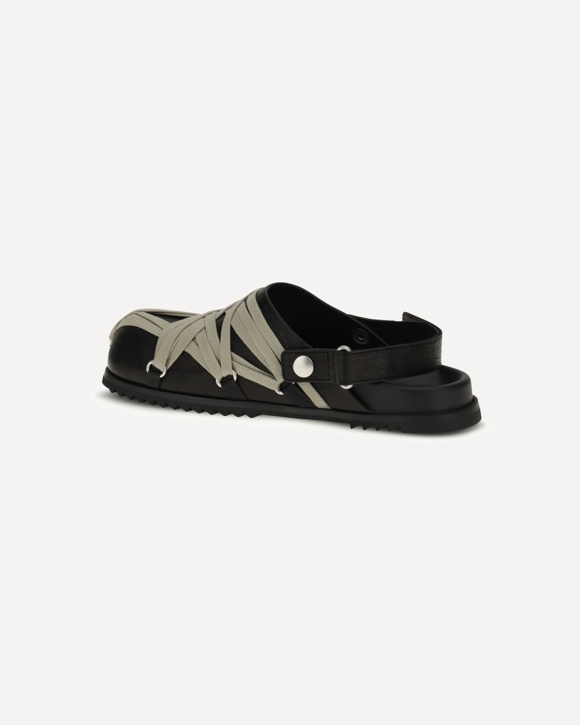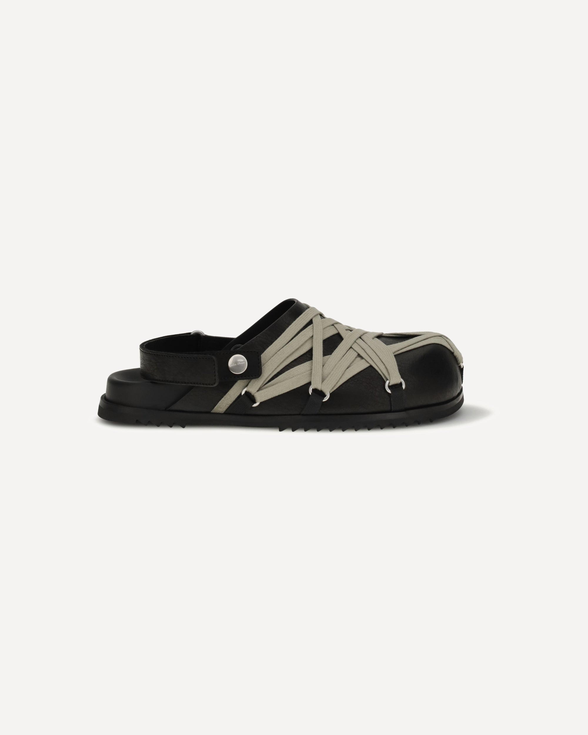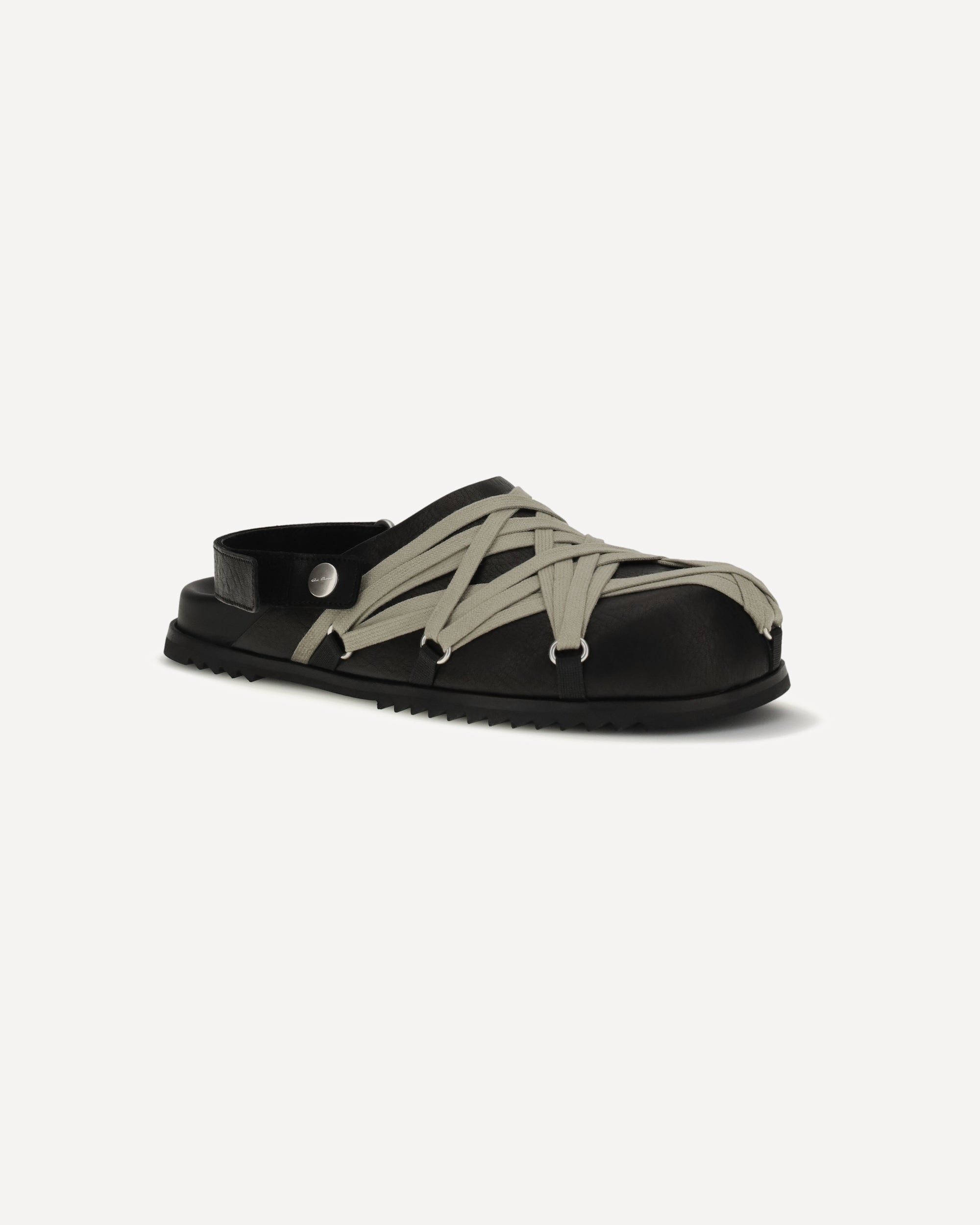 The Megalace Mules by Rick Owens are a bold interpretation of contemporary design. The leather upper, with long laces crossed on the outside, creates a "harness" effect that gives the model a distinctive look. The round toe and open back, with adjustable strap, offer comfort and a customizable fit. A unique design that combines elegance and innovation.