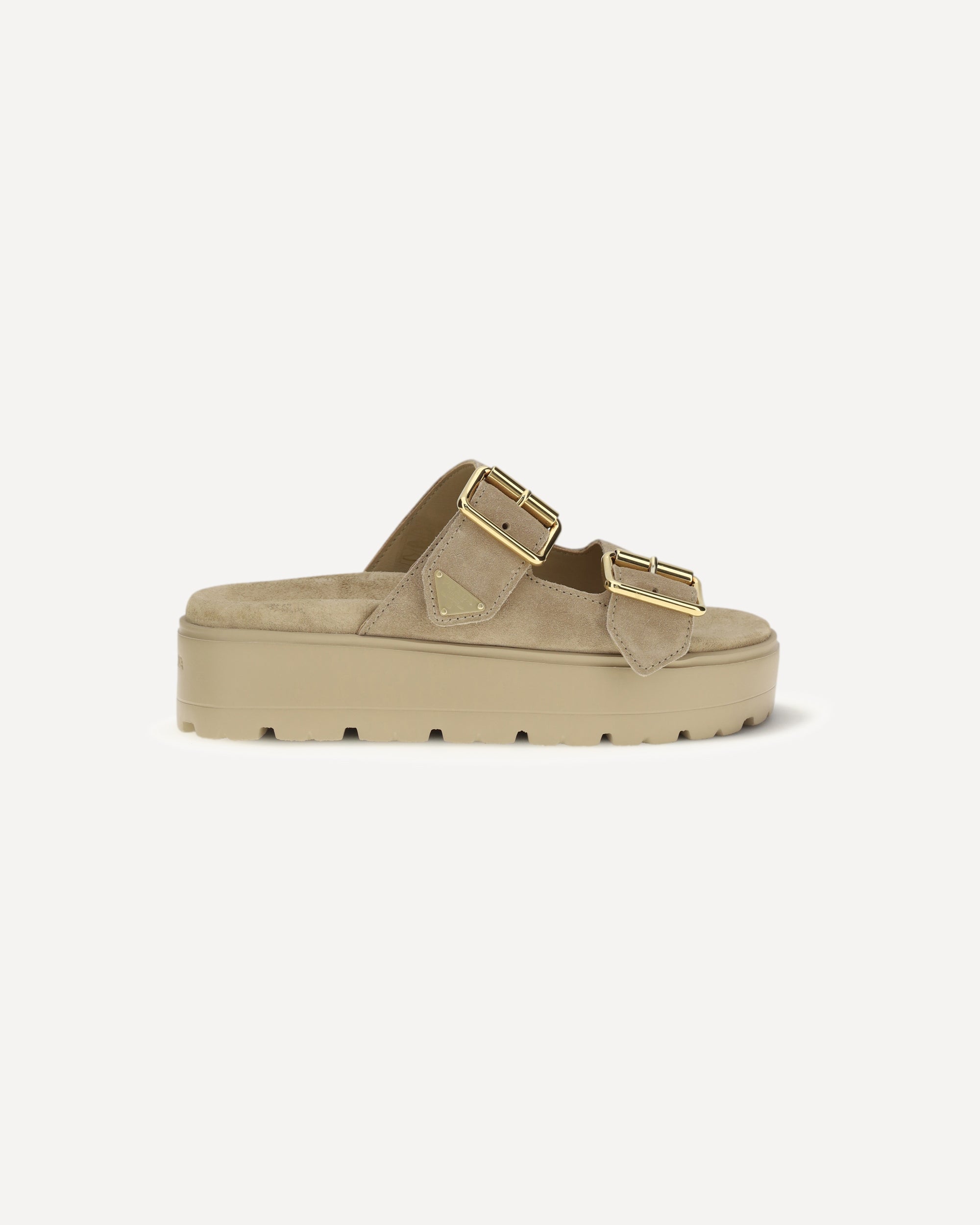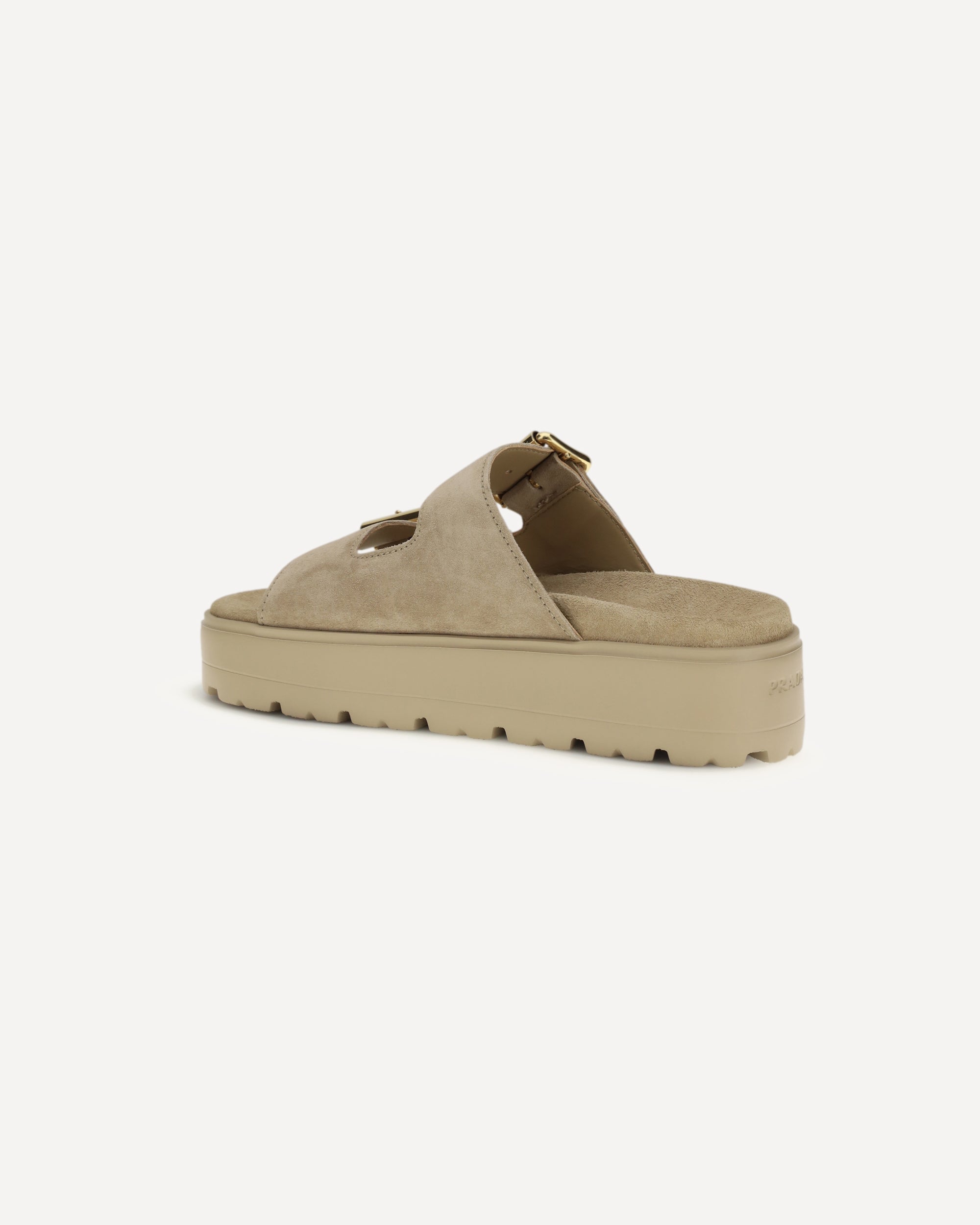 The platform Sandals by Prada are a perfect blend of modernity and boldness. Crafted from soft suede, these sandals stand out for their two buckles on the front, which add a touch of bold and practical style. The chunky platform sole gives them a gritty, contemporary look while ensuring comfort and height. Another distinctive signature is the iconic triangular plaque on one of the buckles, expressing Prada's unmistakable DNA.