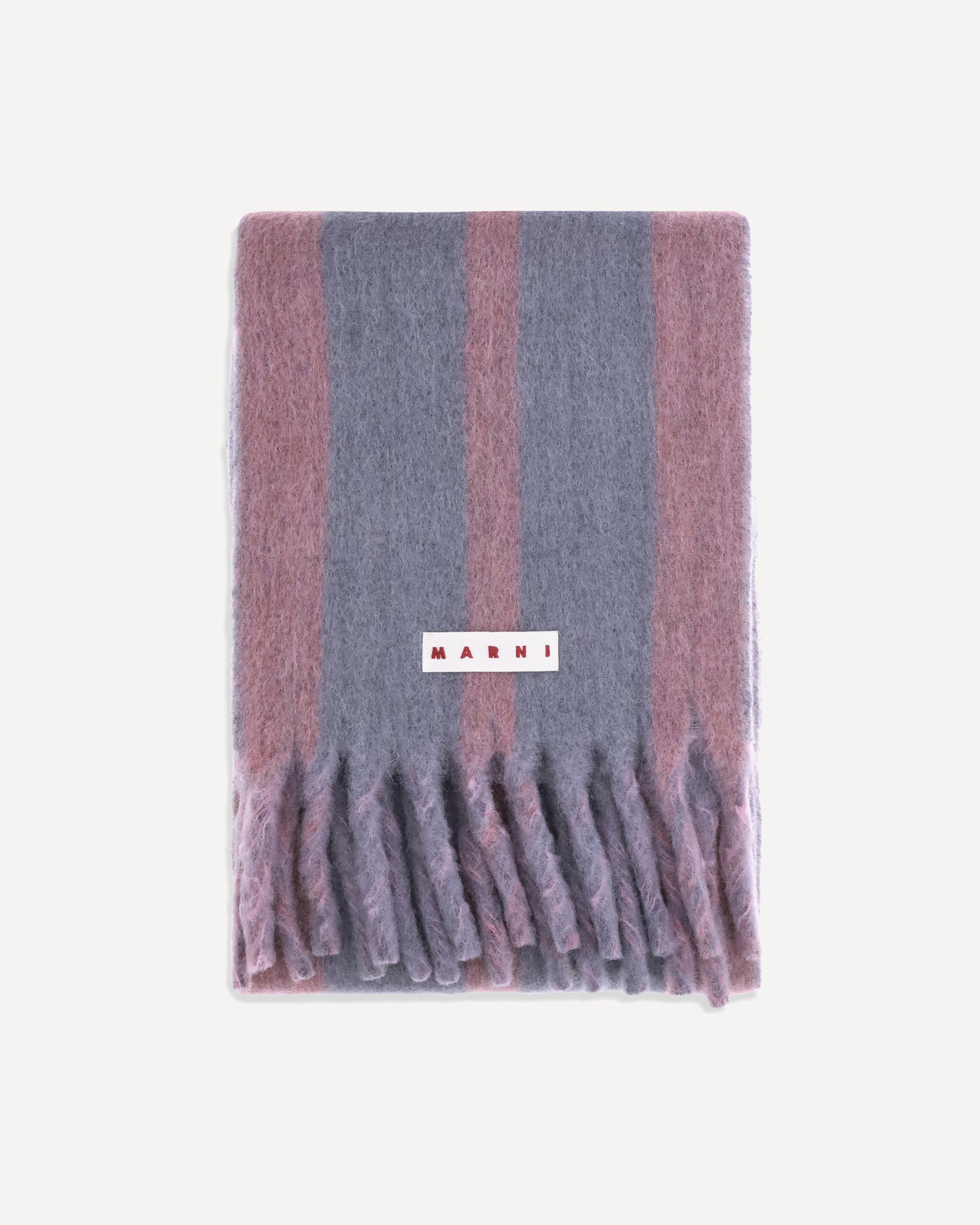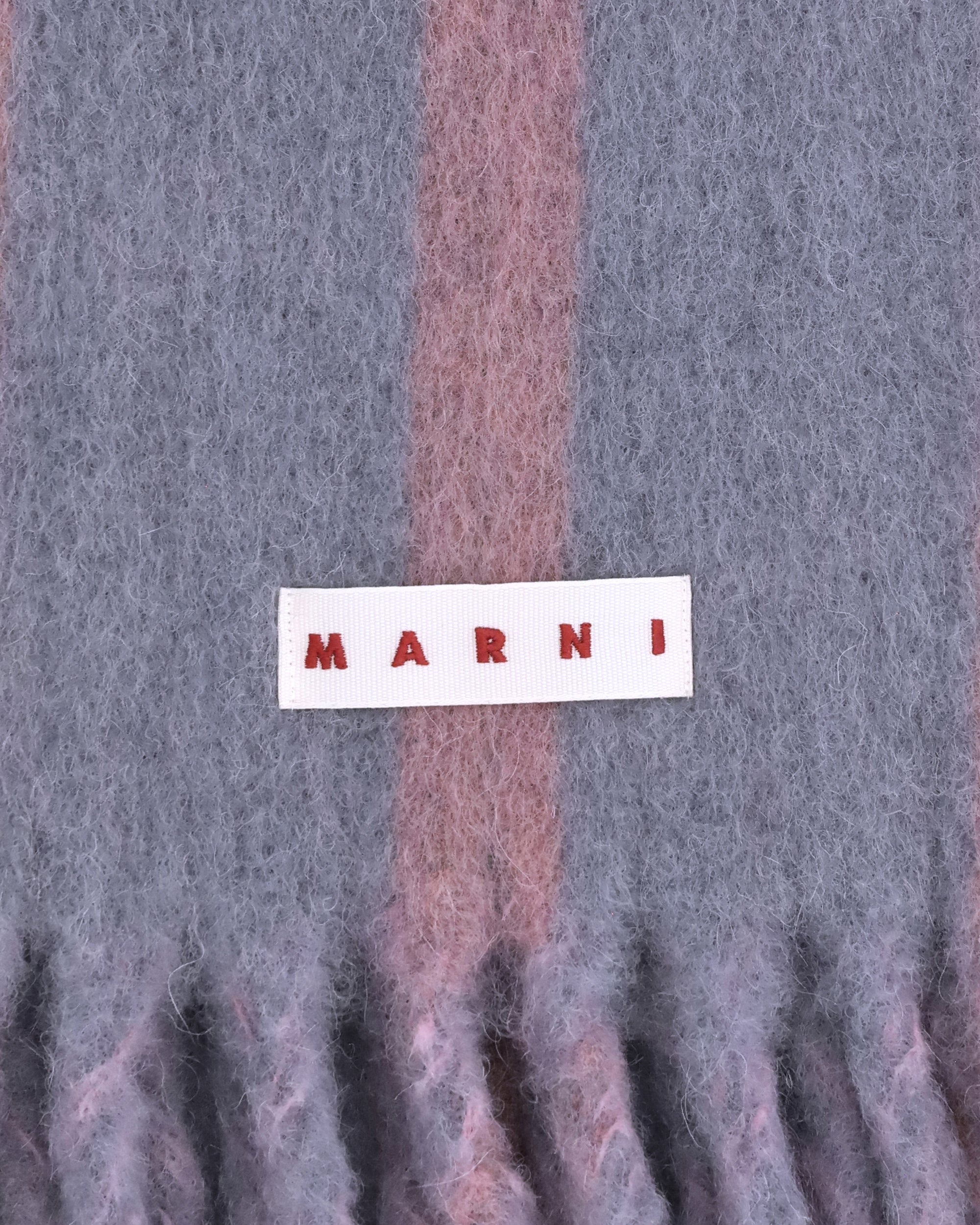 Marni's Scarf is a wrap-around accessory with character, made from a fine blend of alpaca and mohair that ensures warmth and softness. The design features a contrasting reverse and dégradé fringing, elements that add movement and originality. The Maxi Marni lettering gives a bold graphic touch, while the logo patch sewn on the outside signs the garment with the brand's unmistakable style. Perfect to complete the look with a bold and contemporary detail.