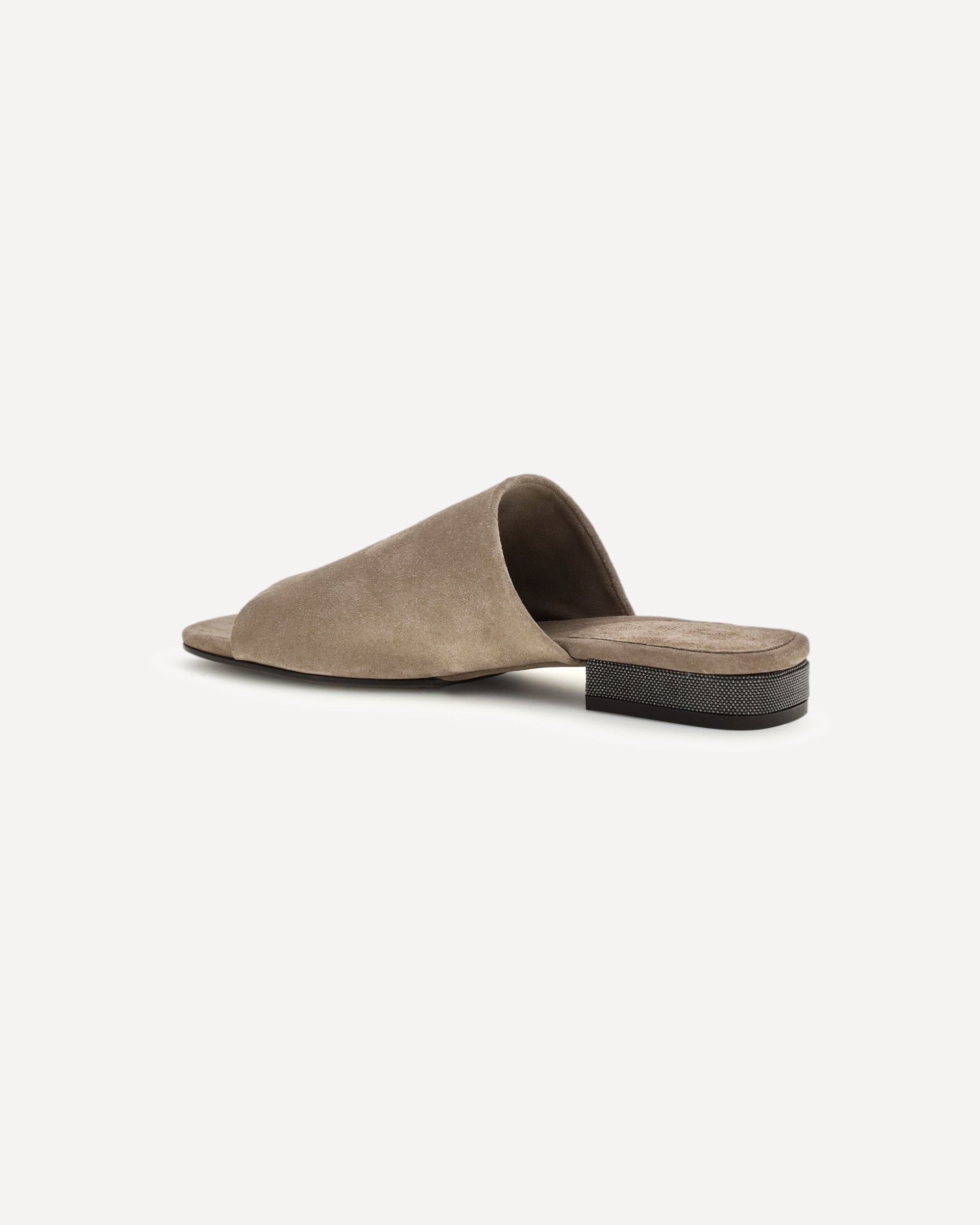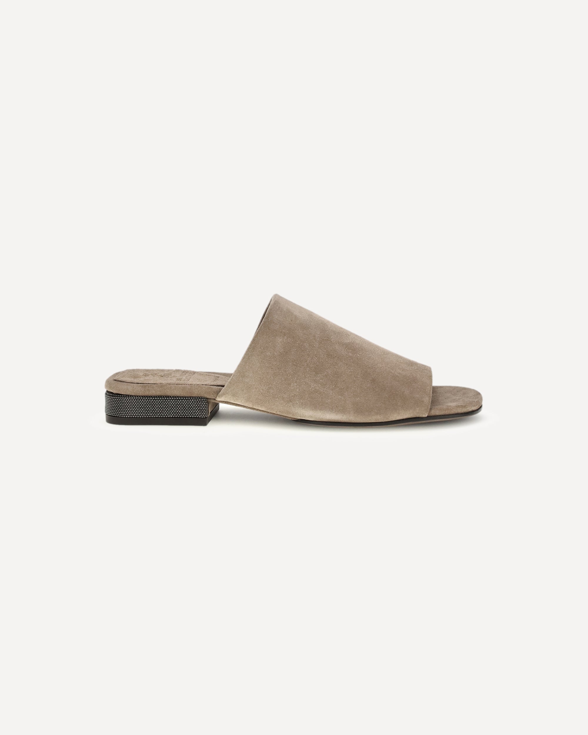 The Precious Heels suede mules Sandals by Brunello Cucinelli feature an essential and elegant design. The suede slide model is complemented by a block heel that provides comfort and stability, expressing a refined and contemporary style.