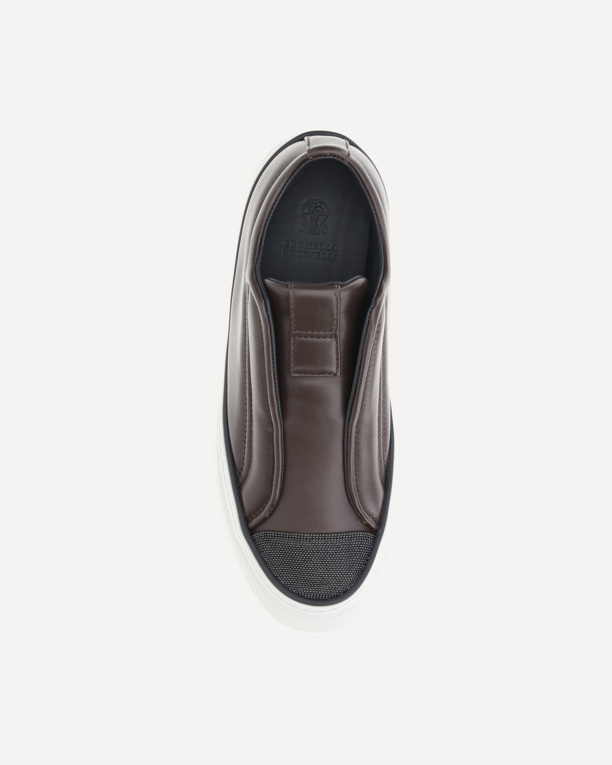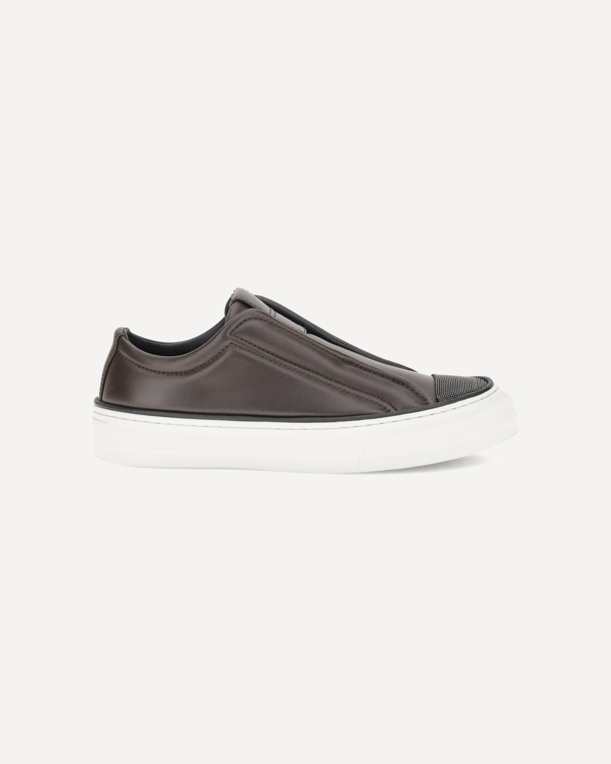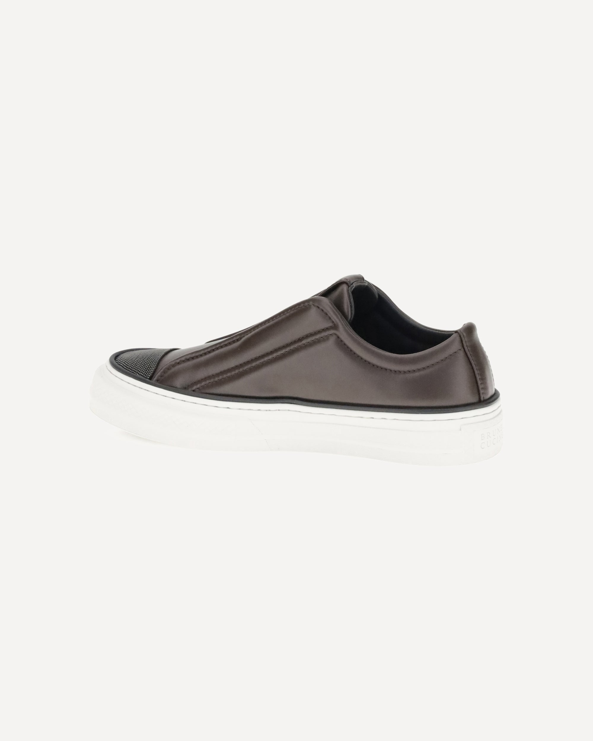 Brunello Cucinelli's Slip-on Sneakers combine practicality and sophistication in an essential design. With a flat rubber sole and rounded toe, they offer a comfortable fit thanks to their lace-free construction. The application of iconic shiny jewels on the toe adds a bright and distinctive touch, an expression of the house's elegant and contemporary style.