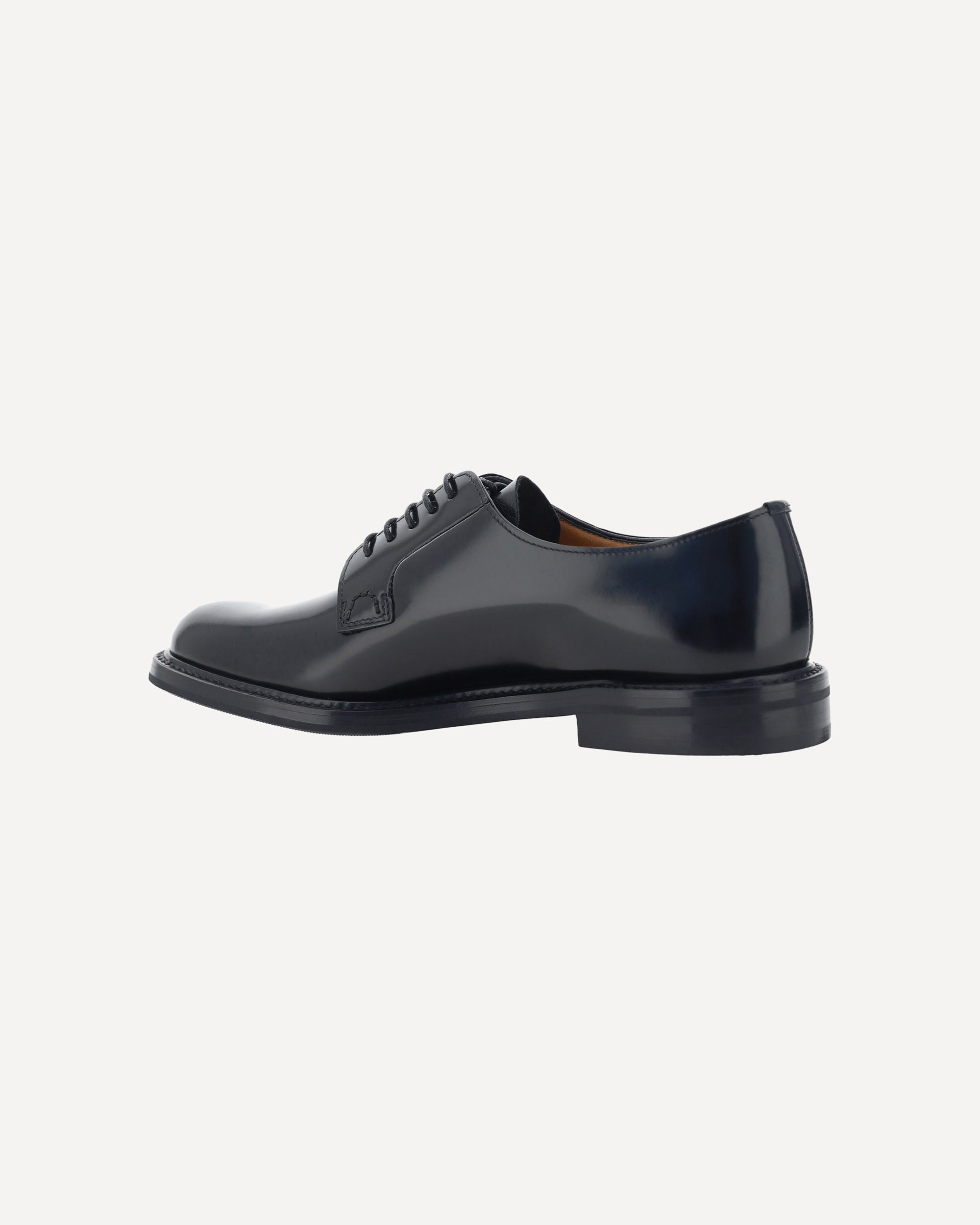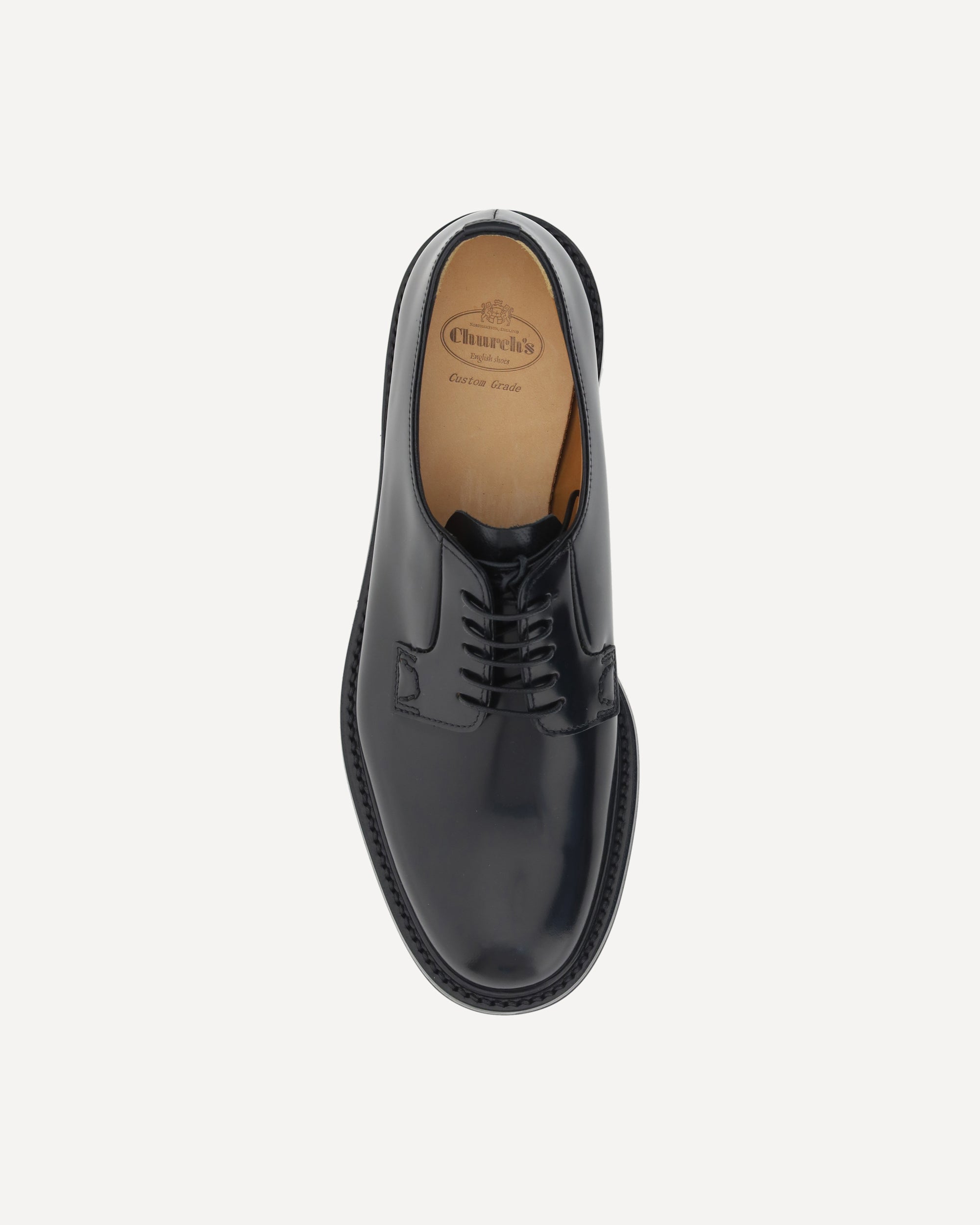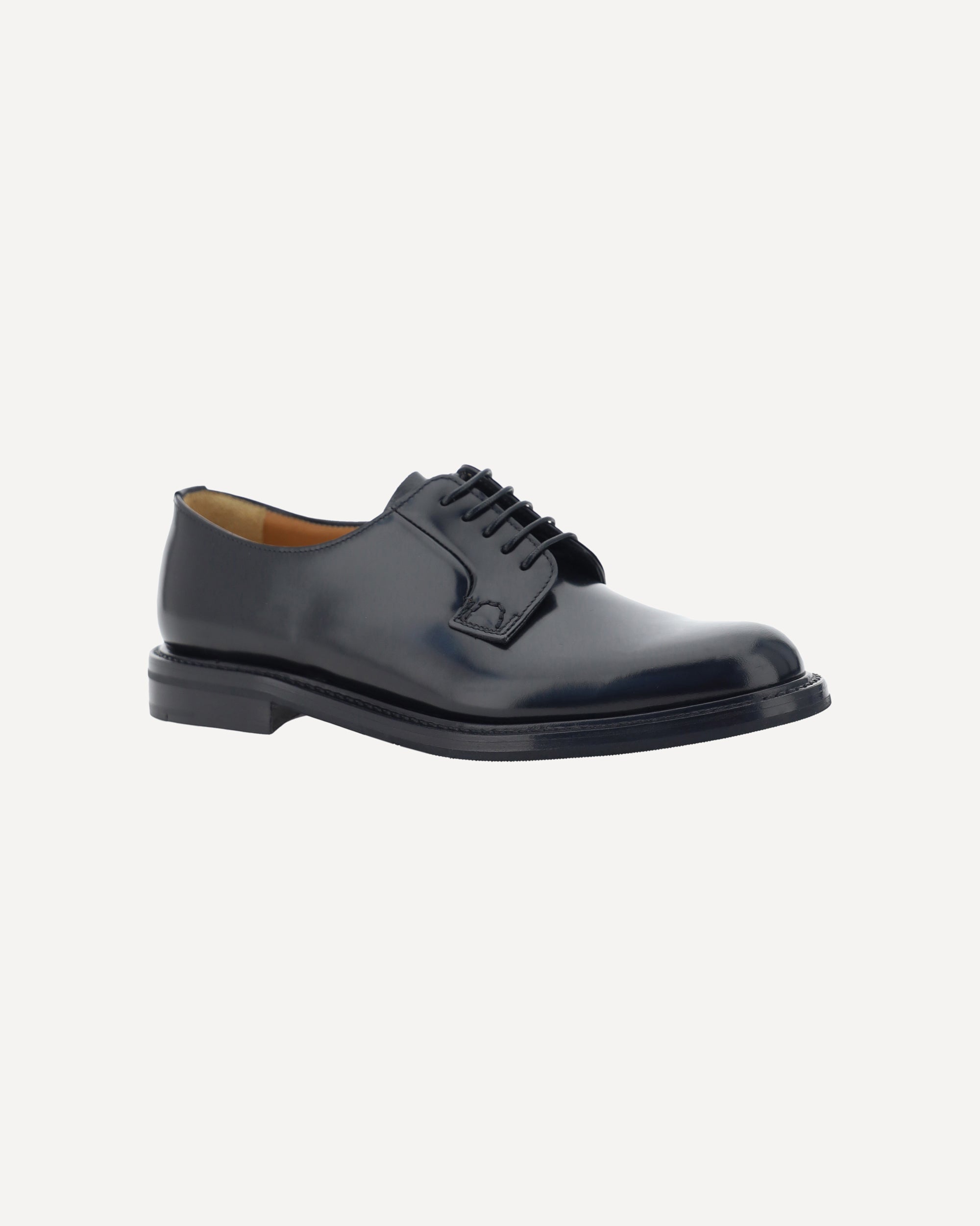 Calfskin Shannon Lace-Up Shoes by Church's featuring an almond toe, front lace-up closure, slight leather block heel, patent leather design, press-on logo insole.