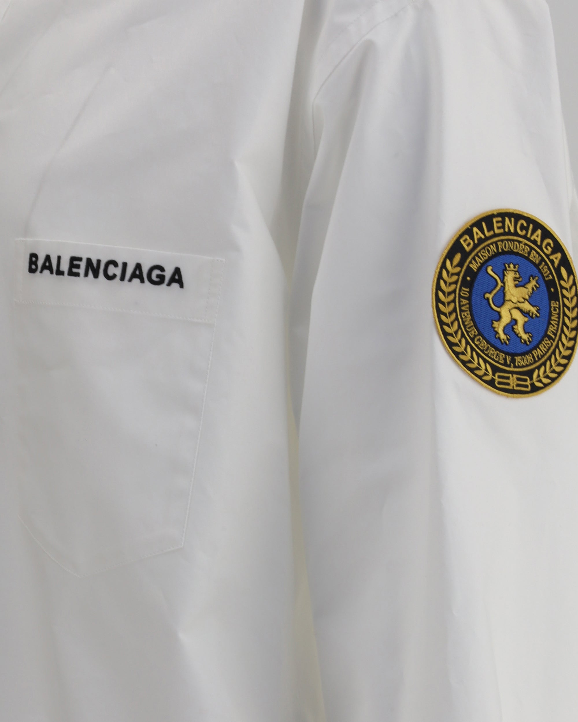 Balenciaga's oversized Shirt features a classic collar and front button closure. A contrasting logo patch pocket stands out on the front, while logo patches sewn on the sleeves add a graphic and distinctive touch to the broad, contemporary design.