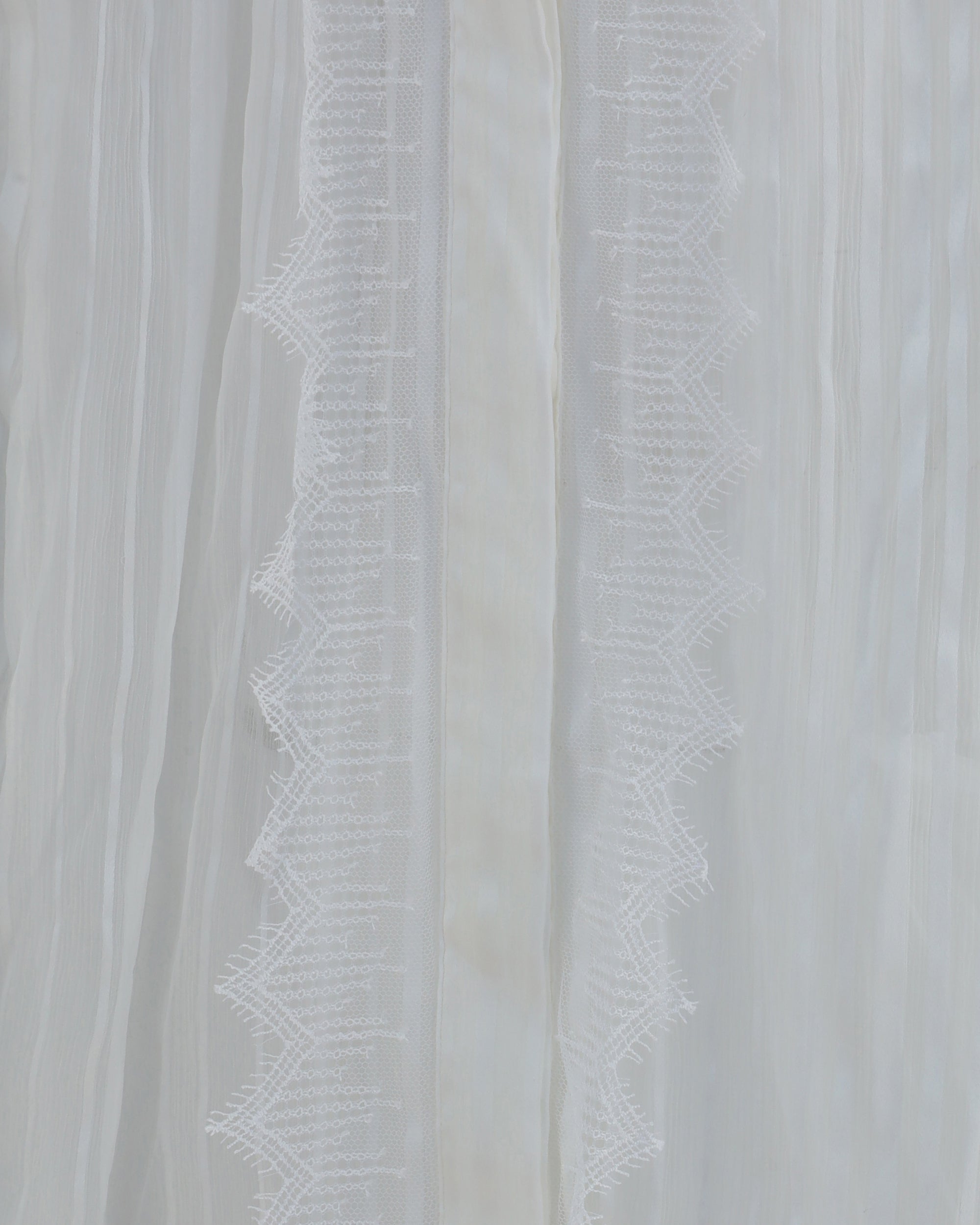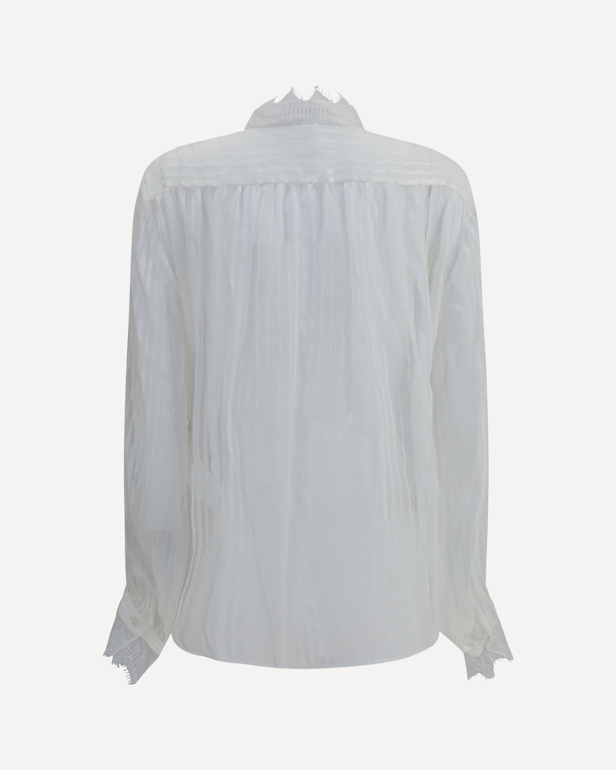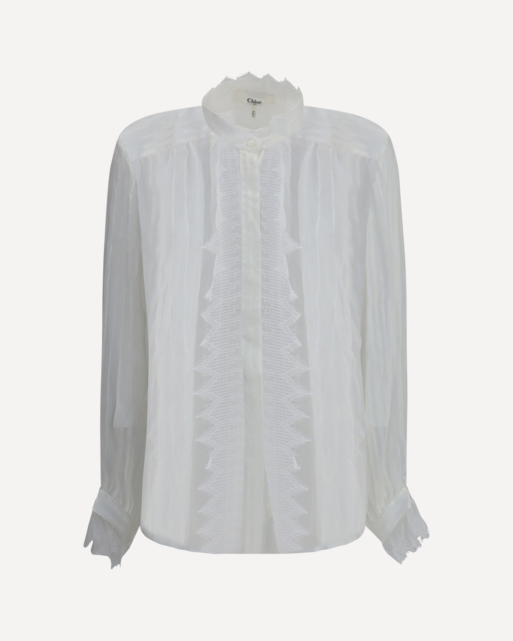 Chloé's fuffled silk muslin and lace Blouse is a refined and delicate garment made of silk muslin embellished with satin stripes that enhance its texture and shine. The silk-blend lining ensures comfort and lightness, while the lace detail and darts give the blouse sophisticated elegance and a perfect fit. Ideal for those seeking a mix of femininity and classic style with a modern twist.