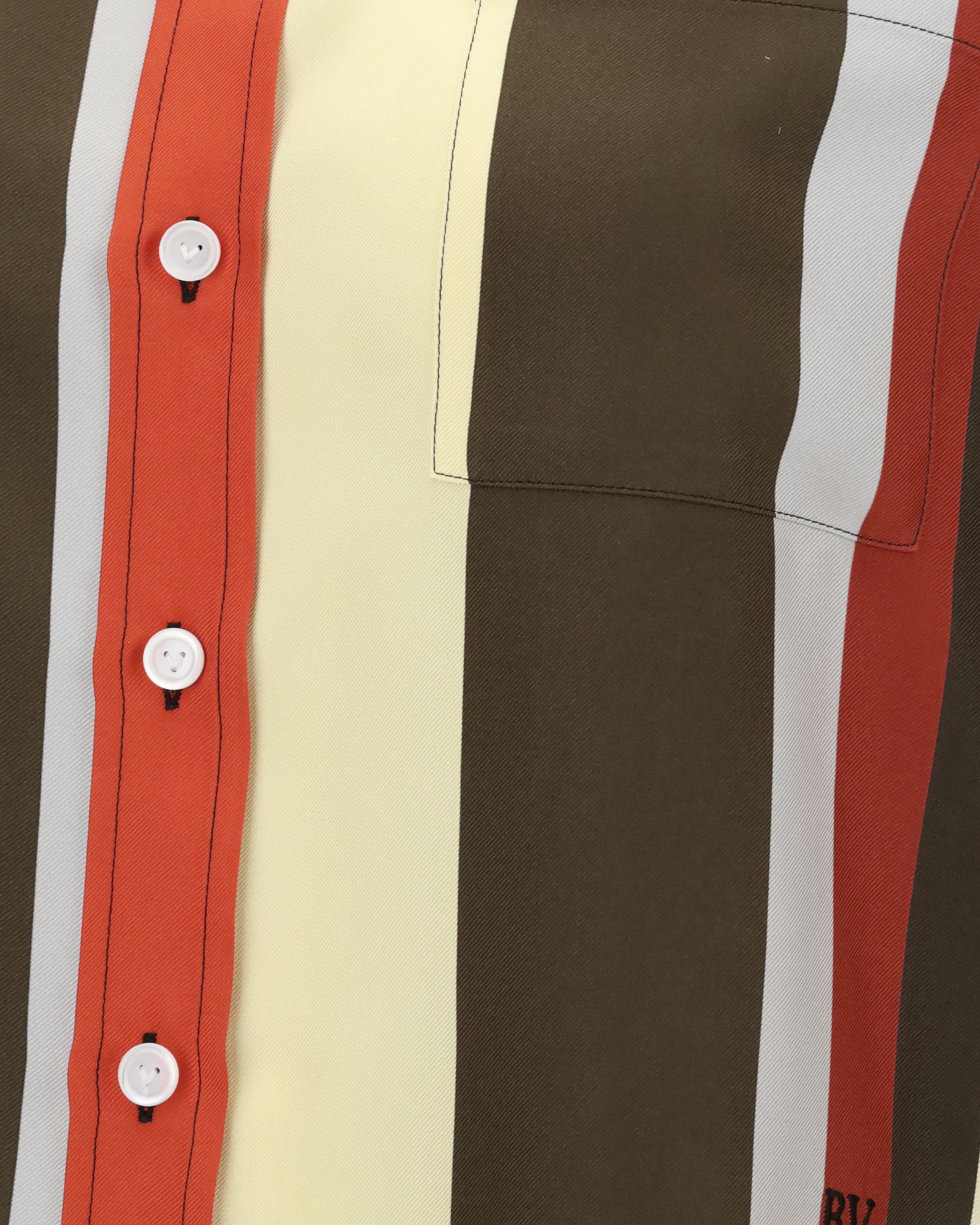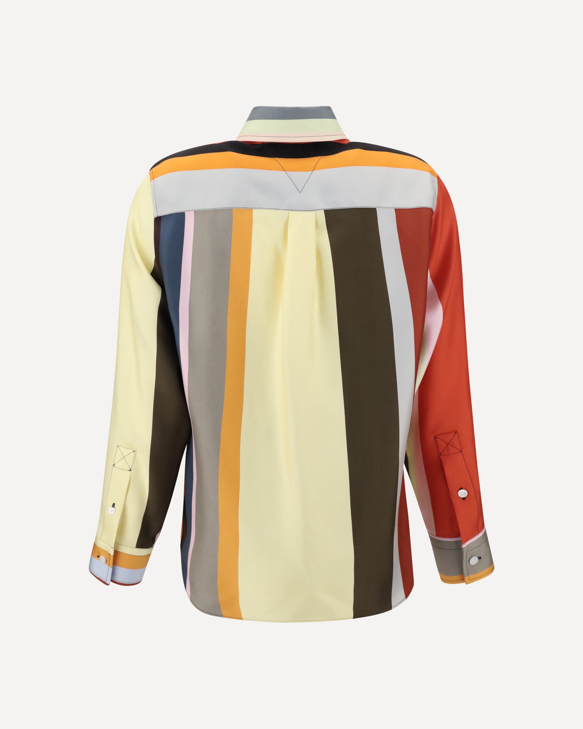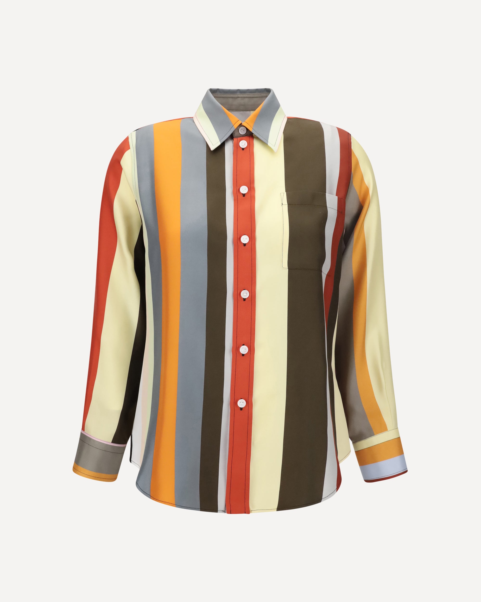 Bottega Veneta's multicolor striped silk Shirt combines vibrant colors and essential lines. Featuring a pointed collar and a front button closure, it is completed with a front patch pocket. A light and sophisticated garment, perfect for adding a distinctive touch to your wardrobe.