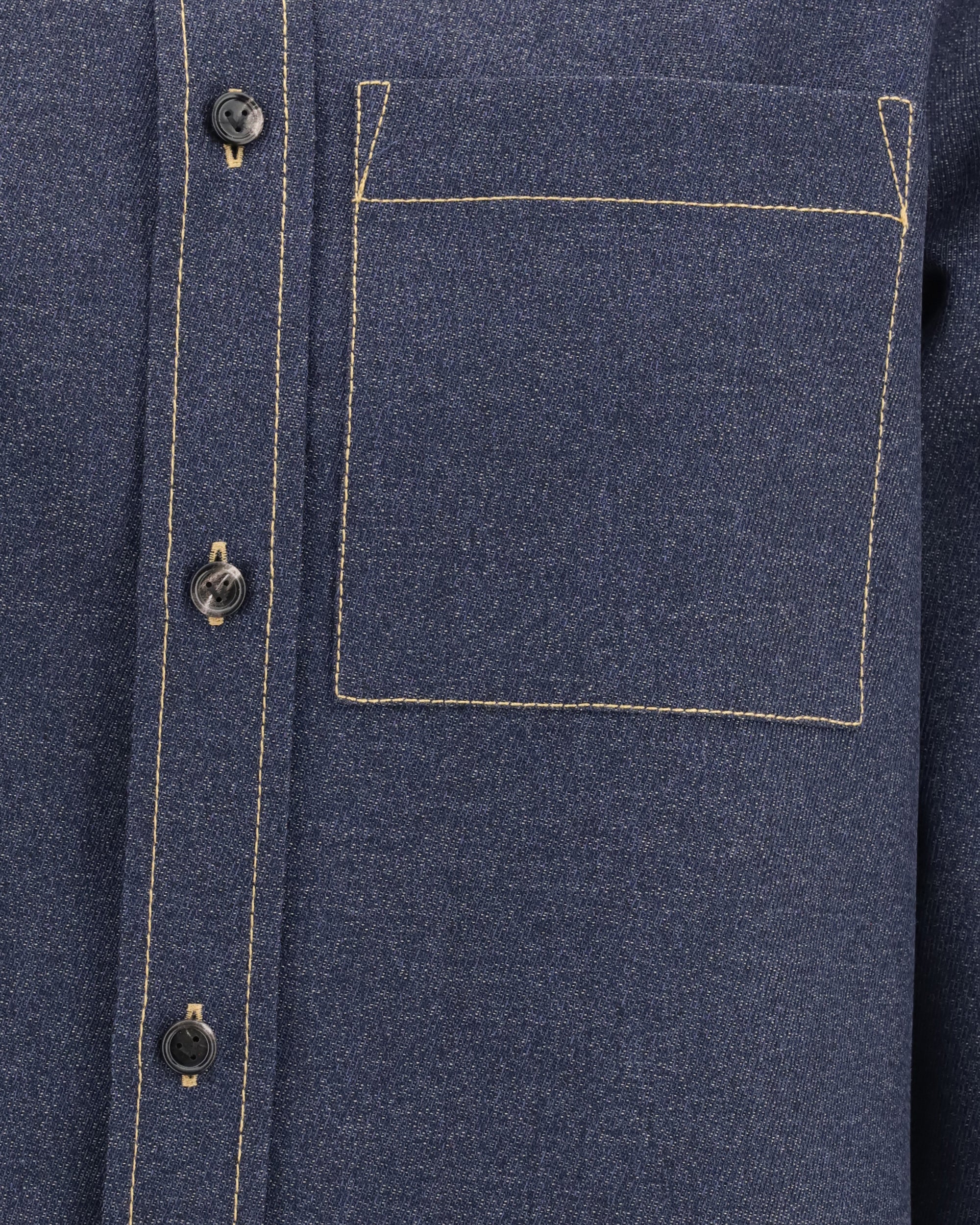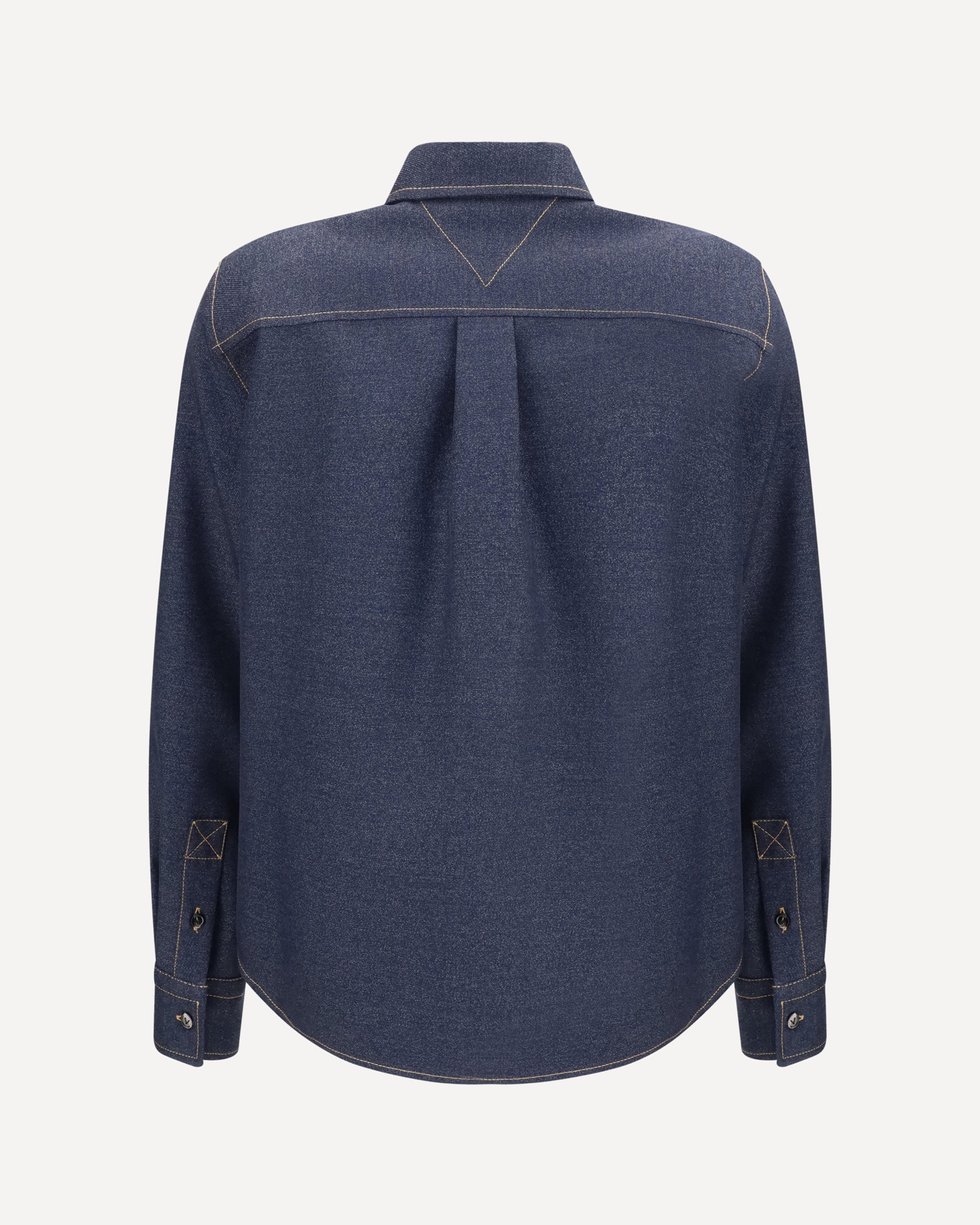 Bottega Veneta's denim-effect mélange wool drill Shirt combines the elegance of materials with the versatility of a casual design. Featuring a classic collar, front button closure and a patch pocket on the chest, it has a regular cut that makes it suitable for a variety of occasions, with a sophisticated denim effect that recalls the brand's contemporary aesthetic.
