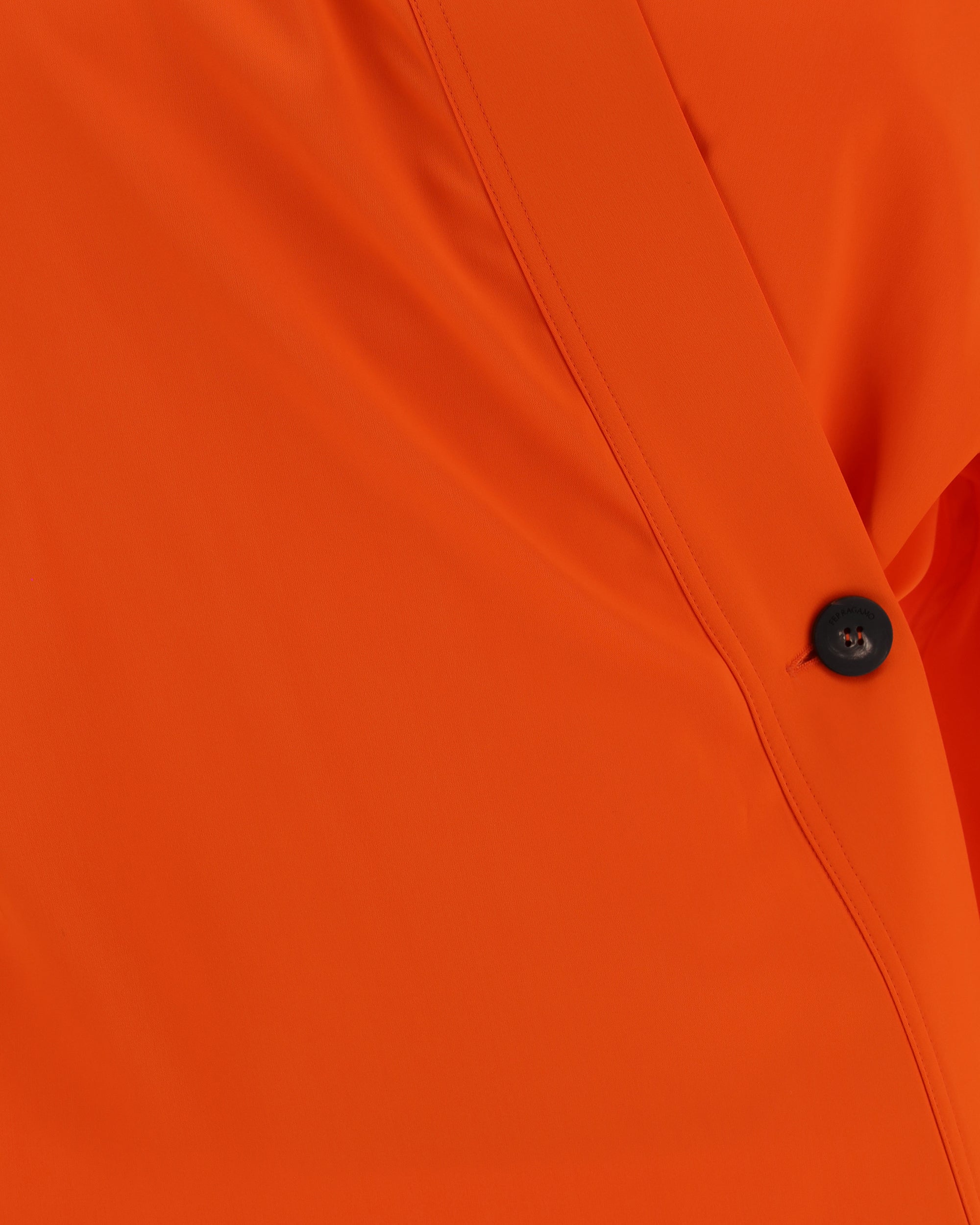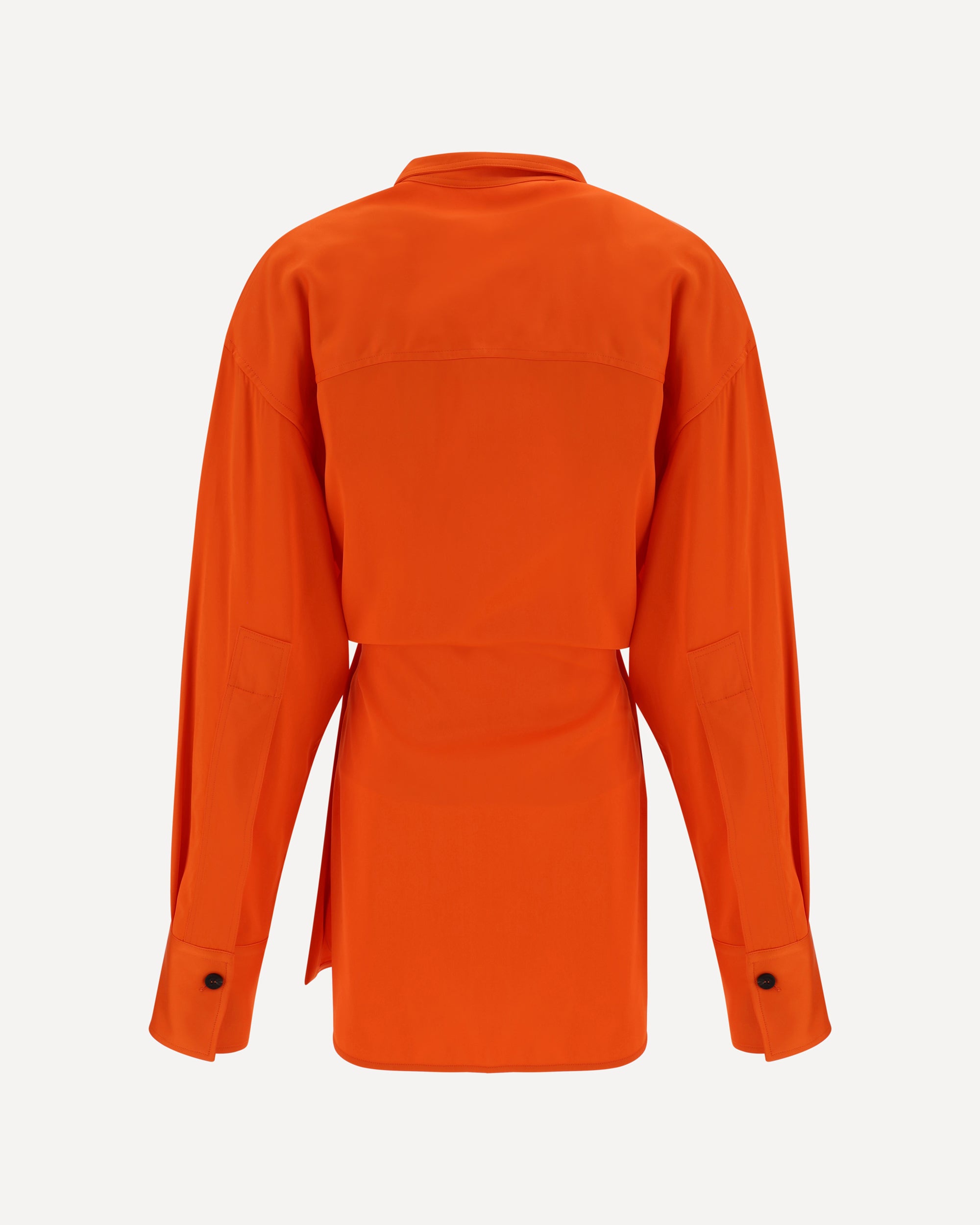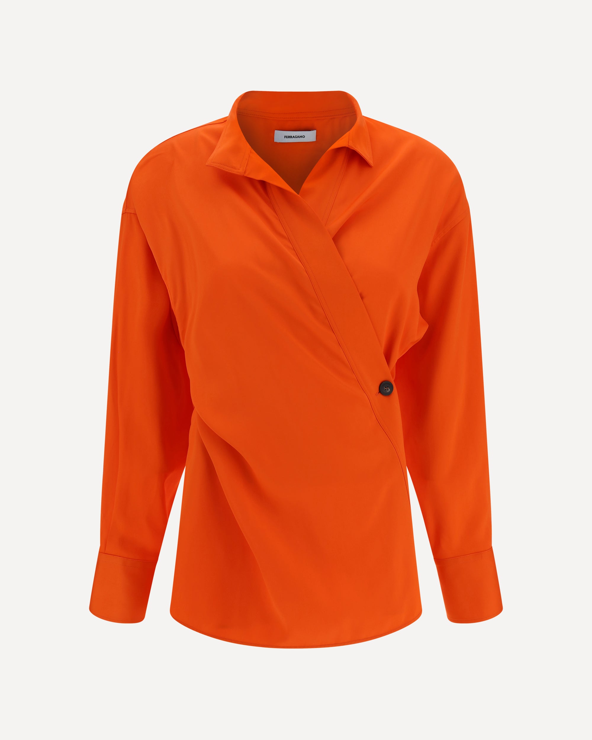 Shirt by Ferragamo, classic collar, adjustable button cuffs, monochrome design, Kimono closure pattern via single button on side panel, oversize fit.