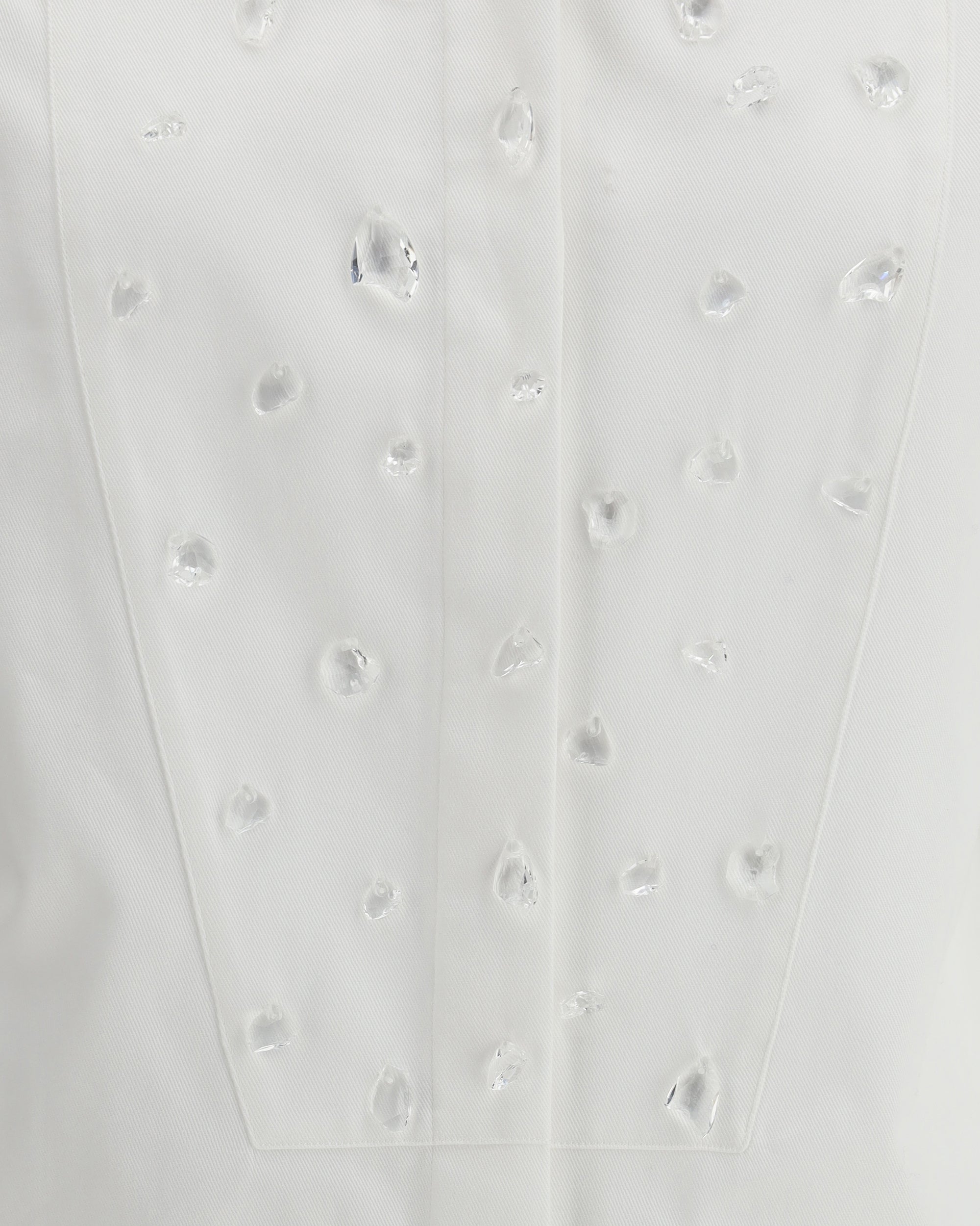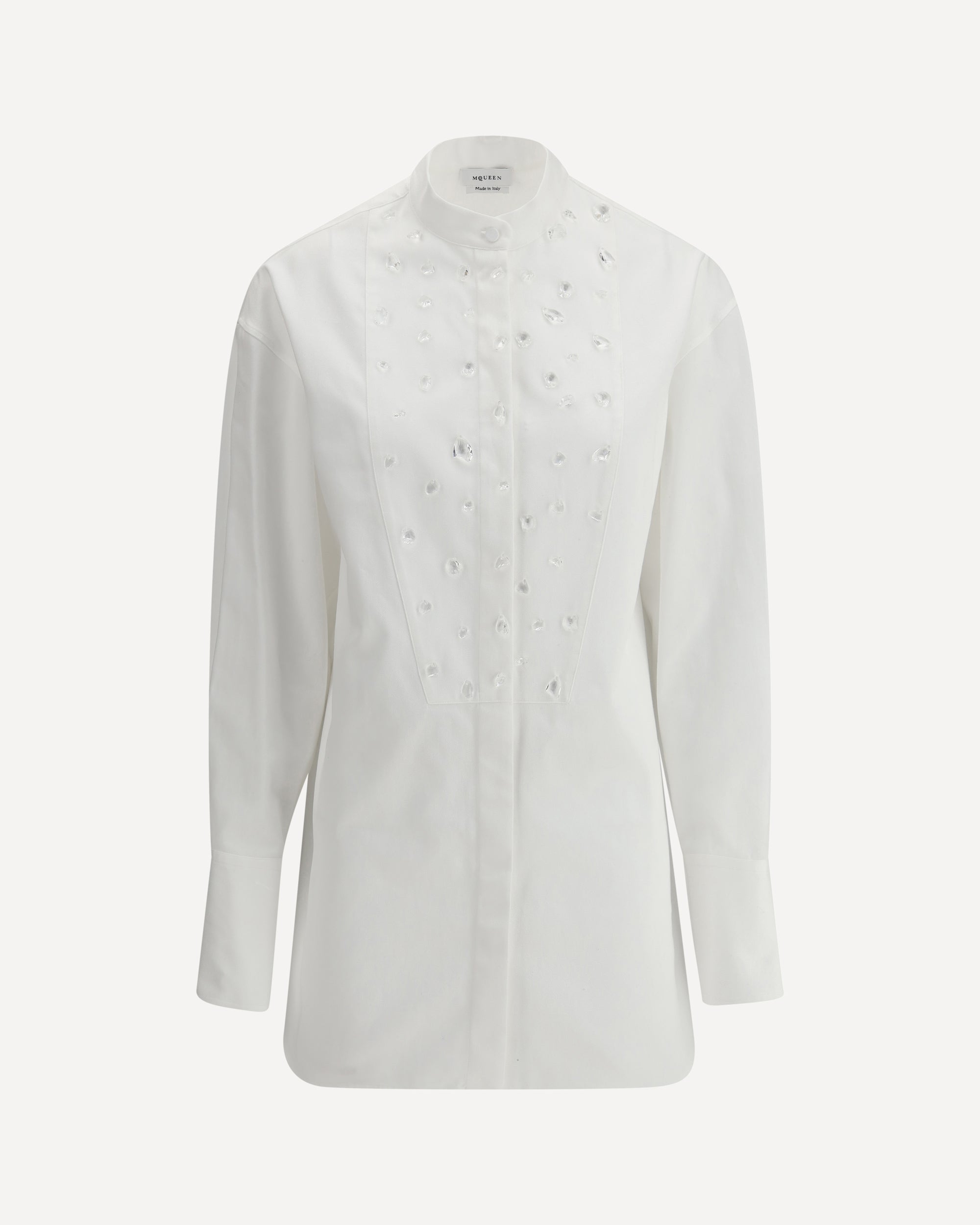 Alexander McQueen's Cotton Stone Shirt is a sophisticated and sophisticated piece, ideal for those looking for an elegant look with a touch of luxury. The mandarin collar adds a modern and minimalist touch, while the front closure with hidden buttons keeps the look clean and refined. Applied transparent stones on the front give a bright and distinctive effect, giving the shirt a unique elegance and sophisticated appeal.