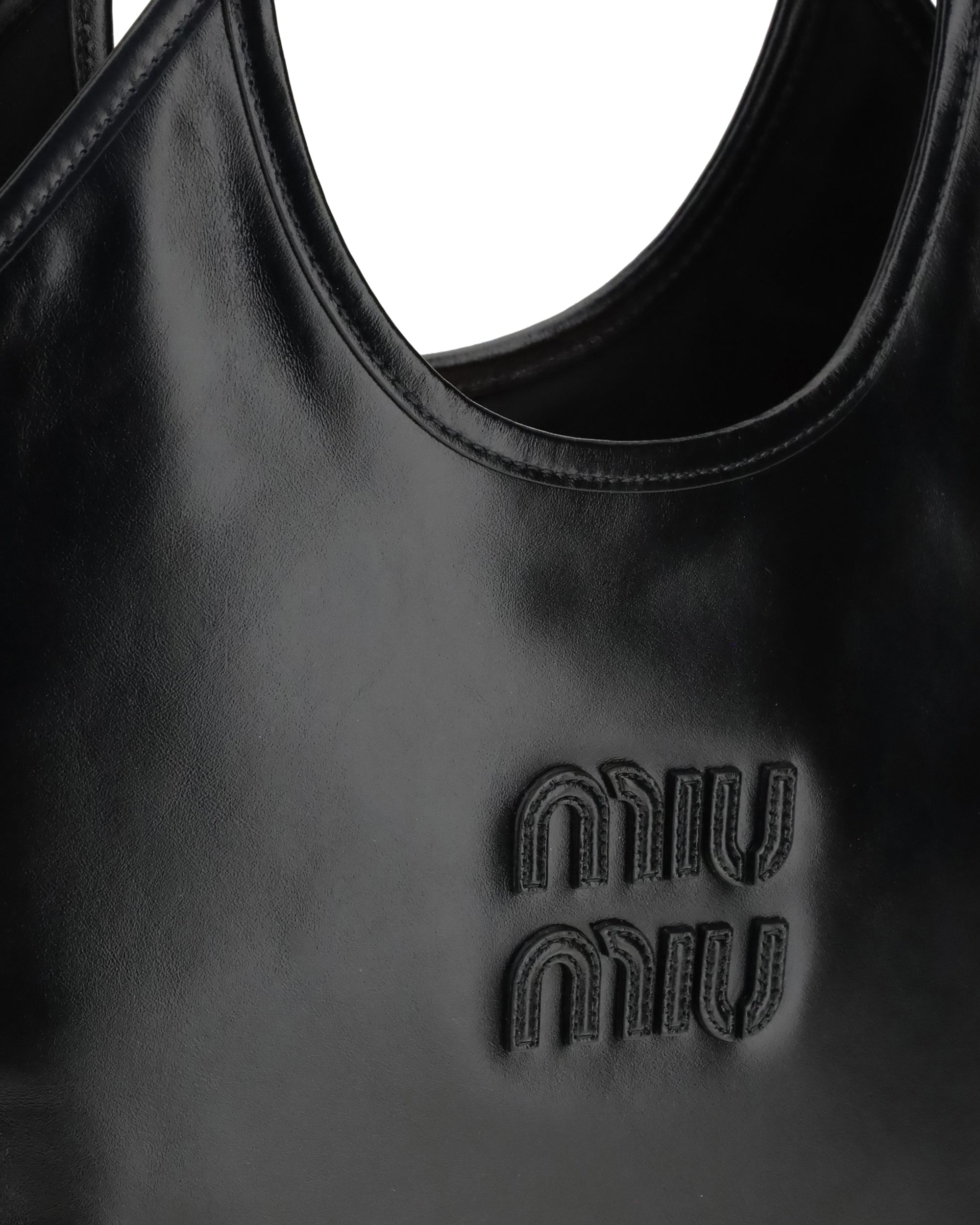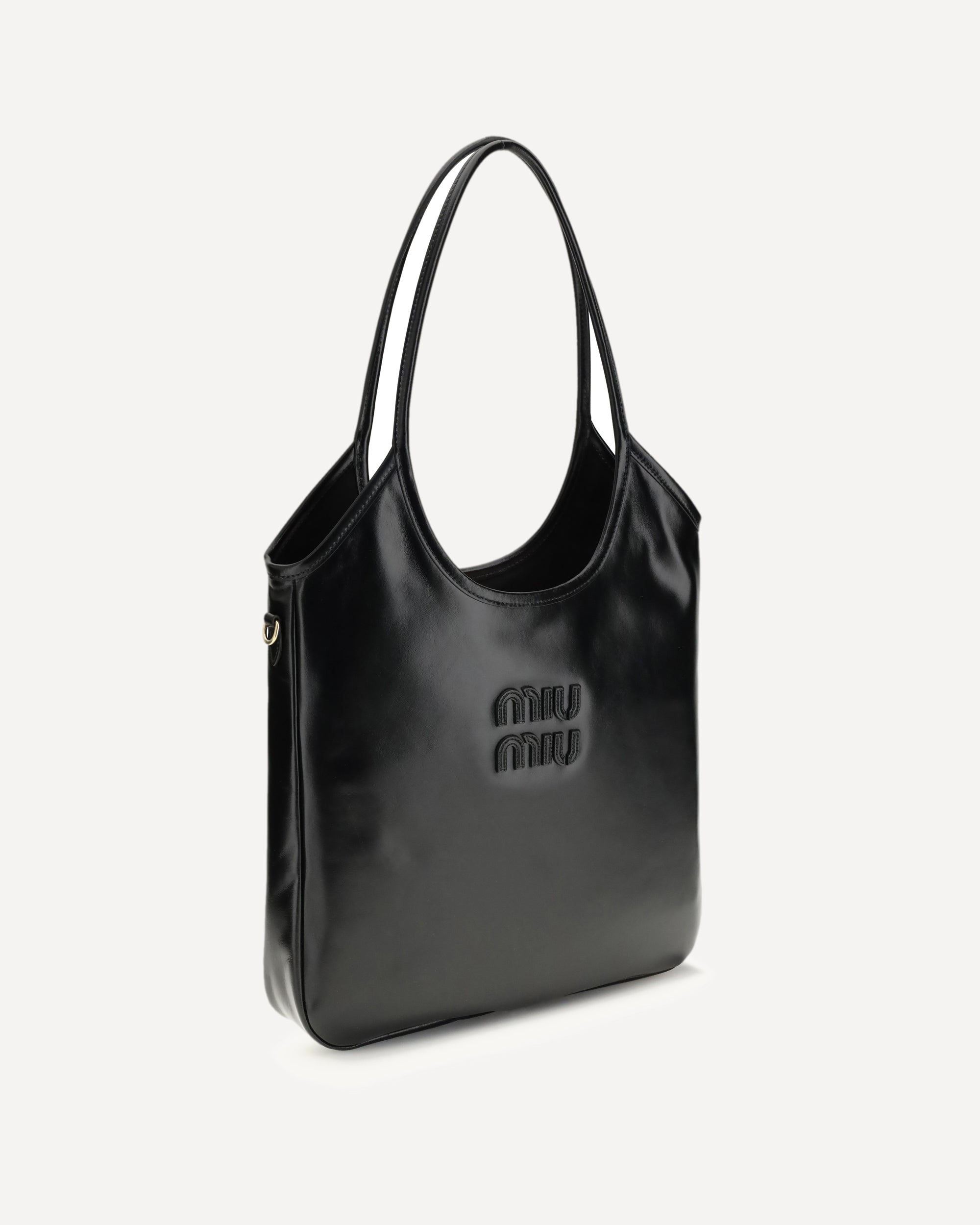 The IVY leather Shoulder Bag by Miu Miu reinterprets the classic shopping model with a combination of elegance and practicality. The soft sheen of leather is paired with refined finishes, while the iconic tone-on-tone lettering logo adds a distinctive touch. Double leather handles and gold hardware lend an air of sophistication, while the cotton gabardine interior with zipper pocket offers functionality and organization. A versatile accessory perfect for those seeking a mix of style and comfort for any occasion.