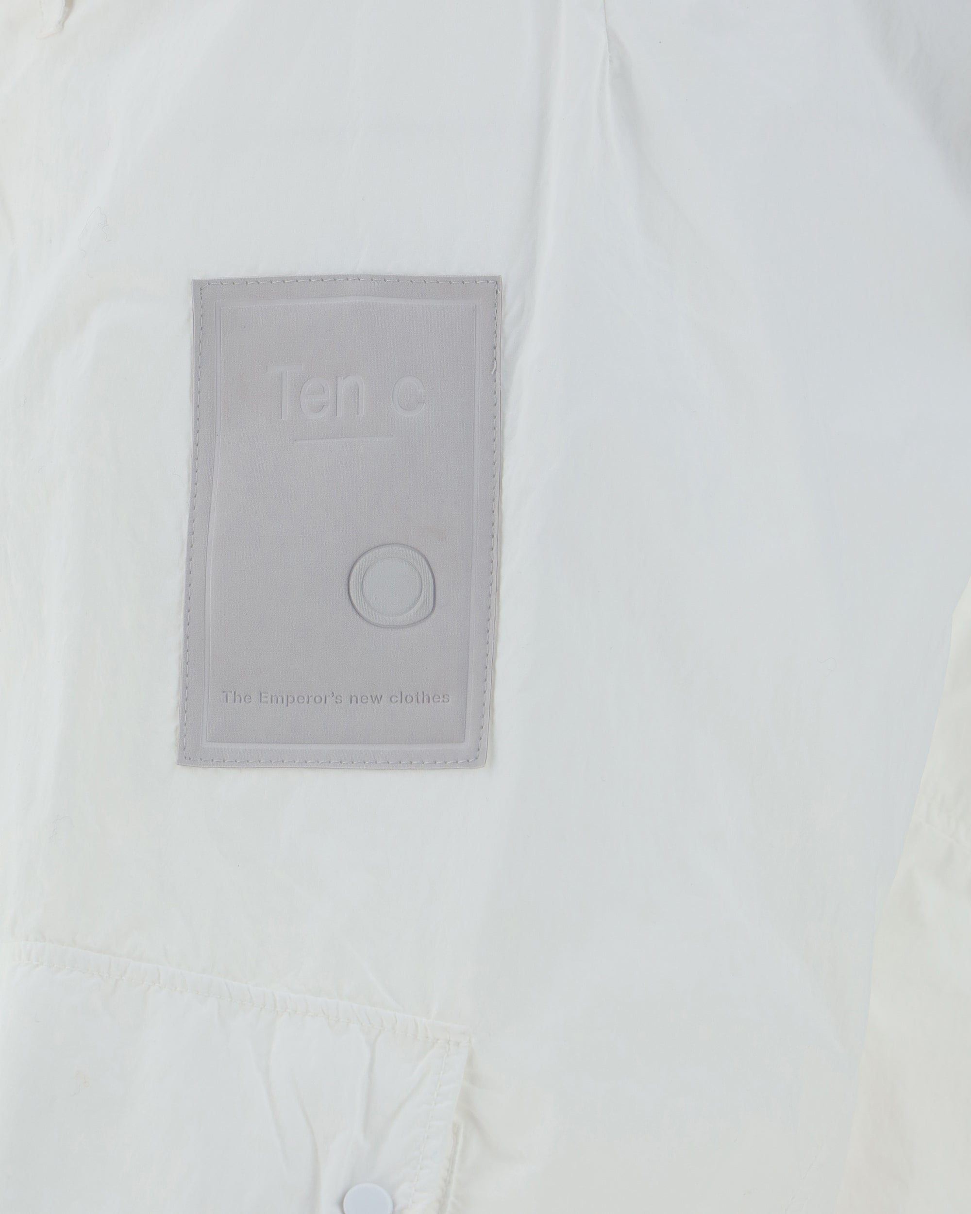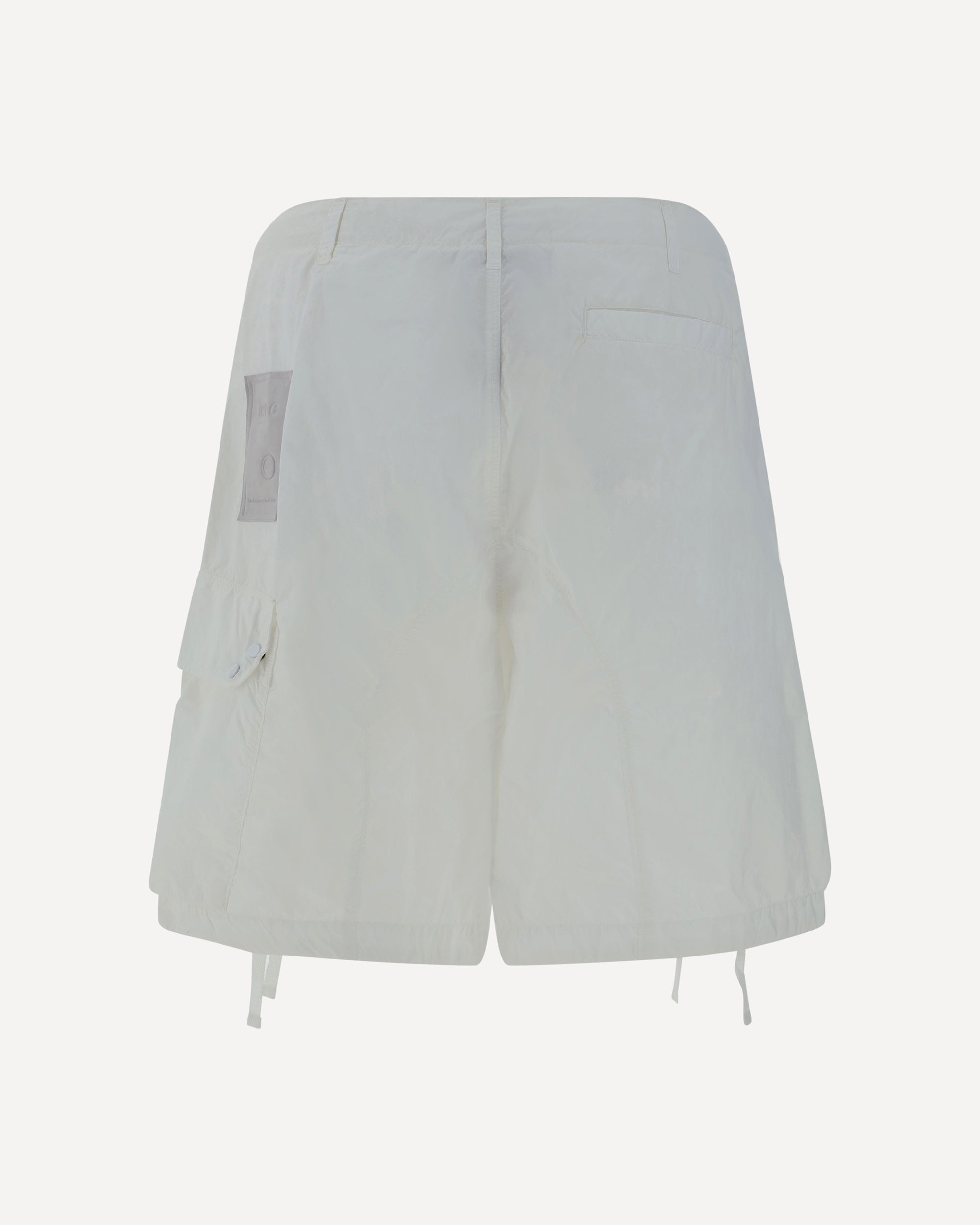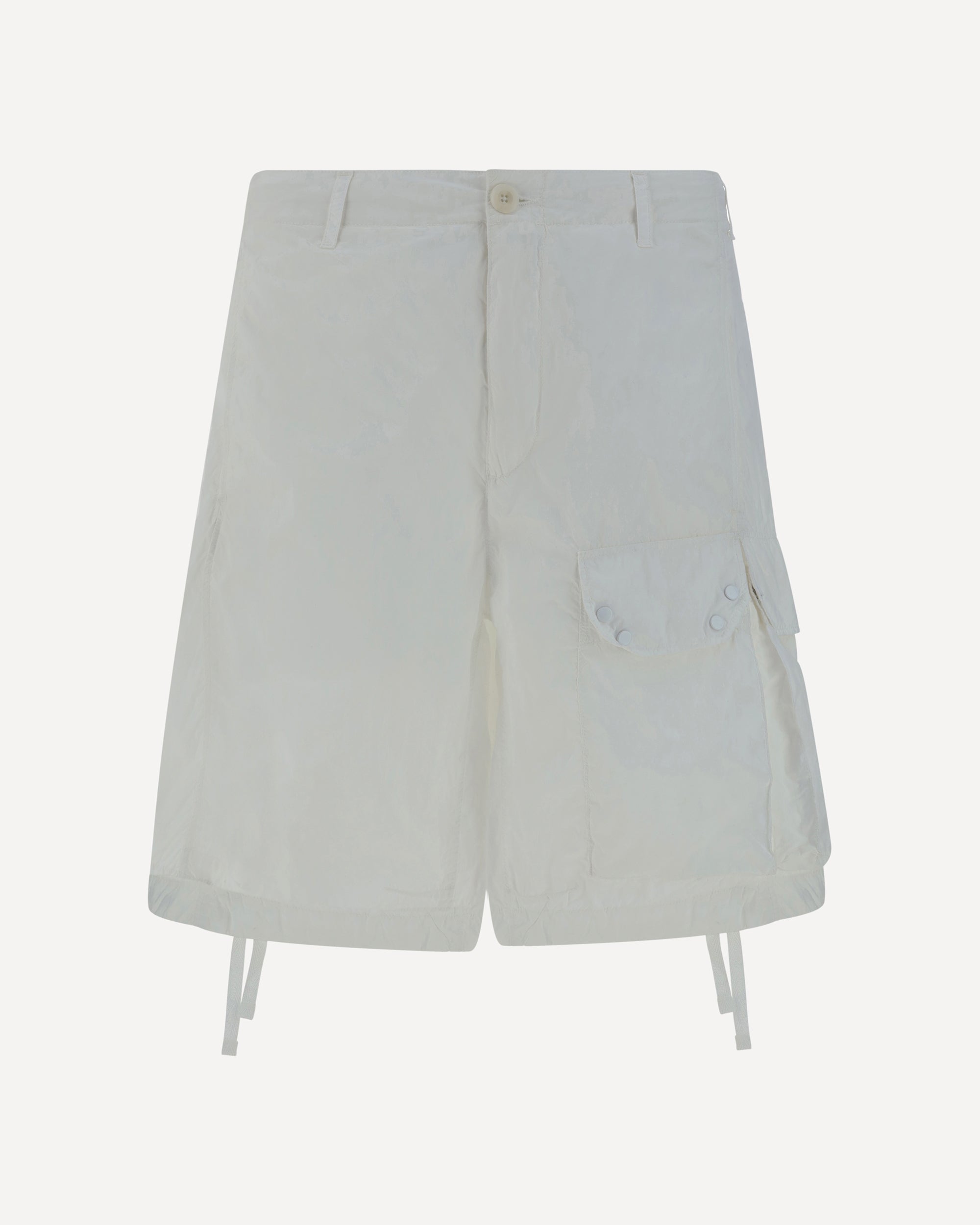 Shorts by Ten C, front zipper and button closure, two side welt pockets, back slit pocket, iconic brand monogram patch applied on back panel, adjustable drawstring hems, waist belt loops, two cargo pockets on side panel, monochrome pattern, regular fit.