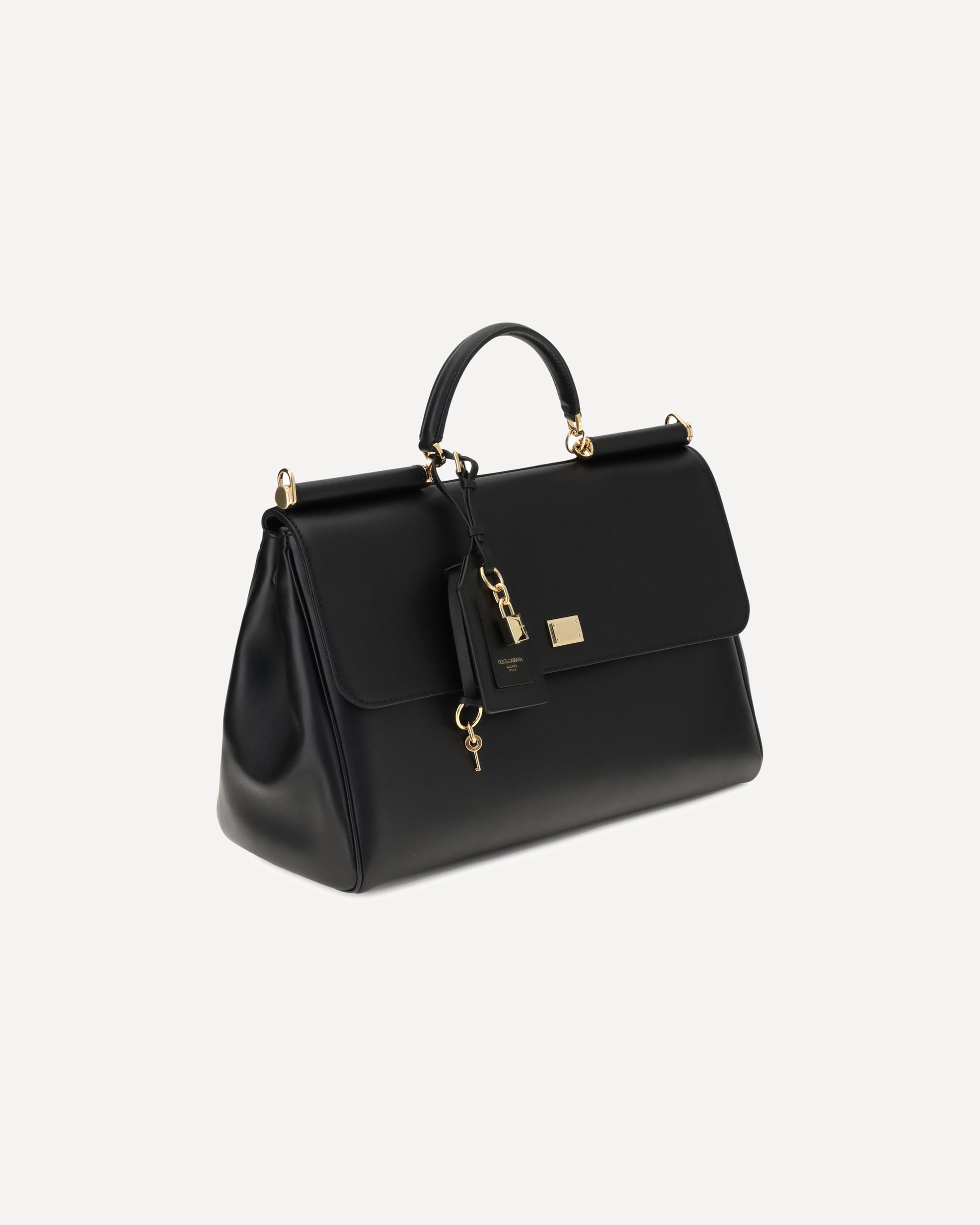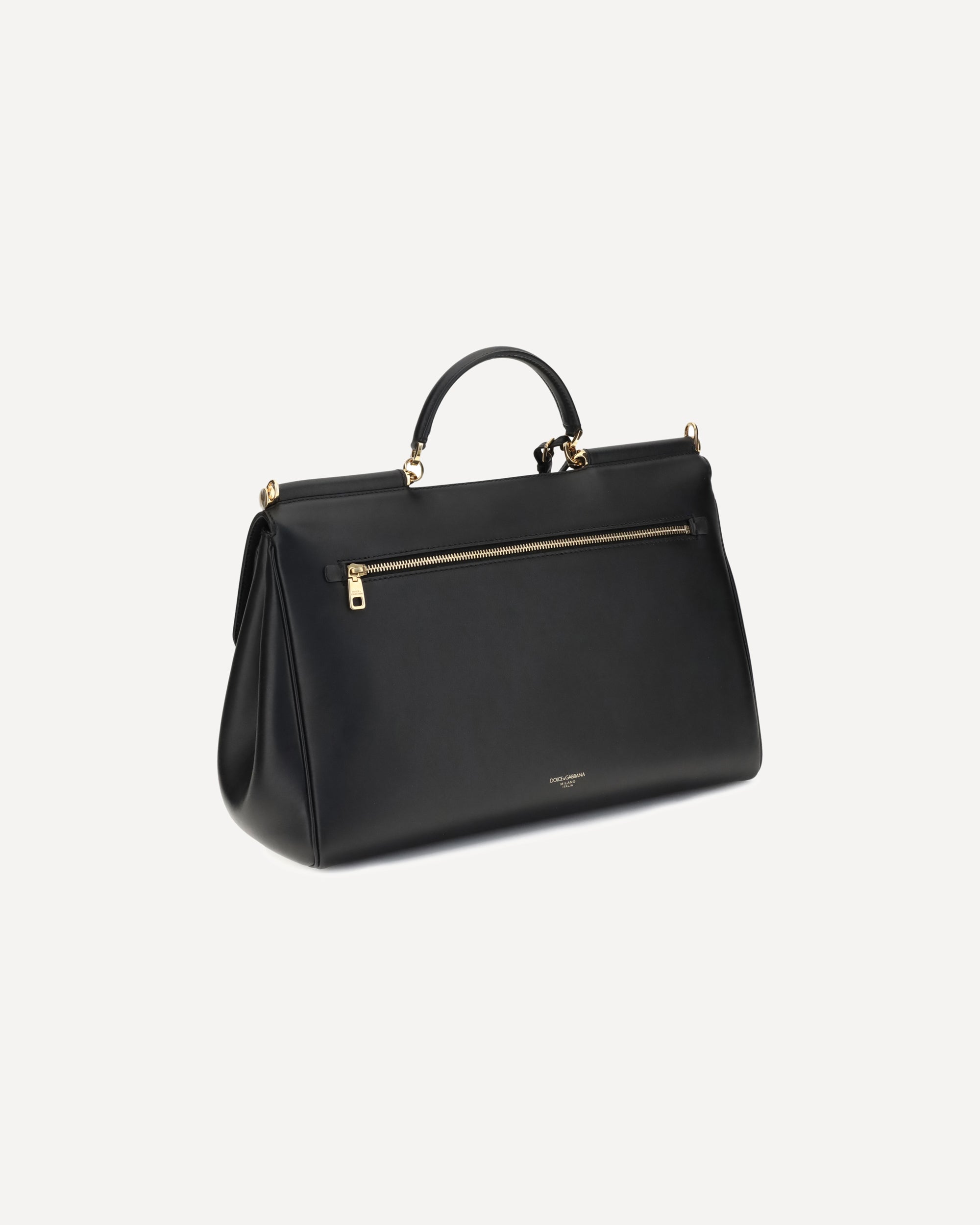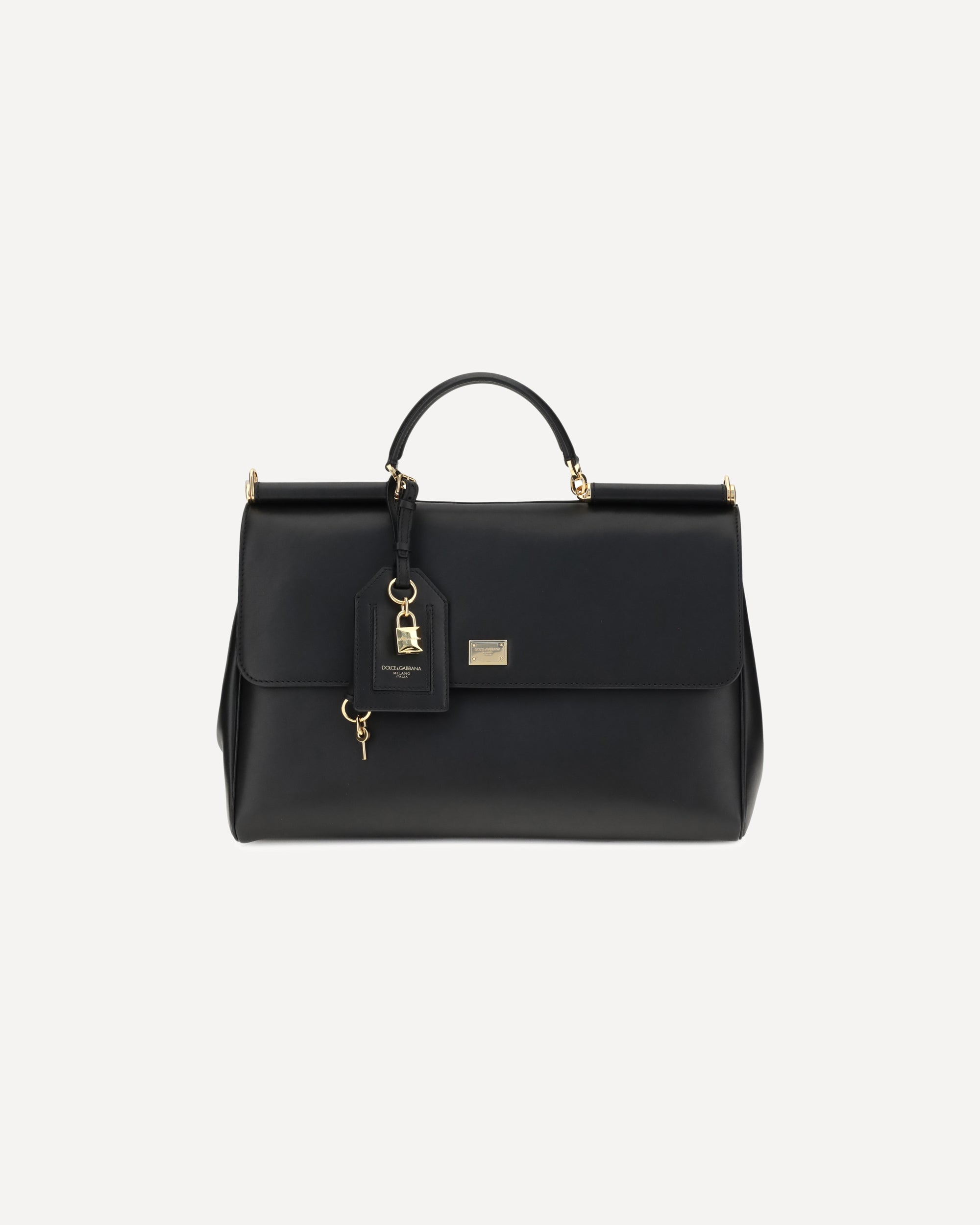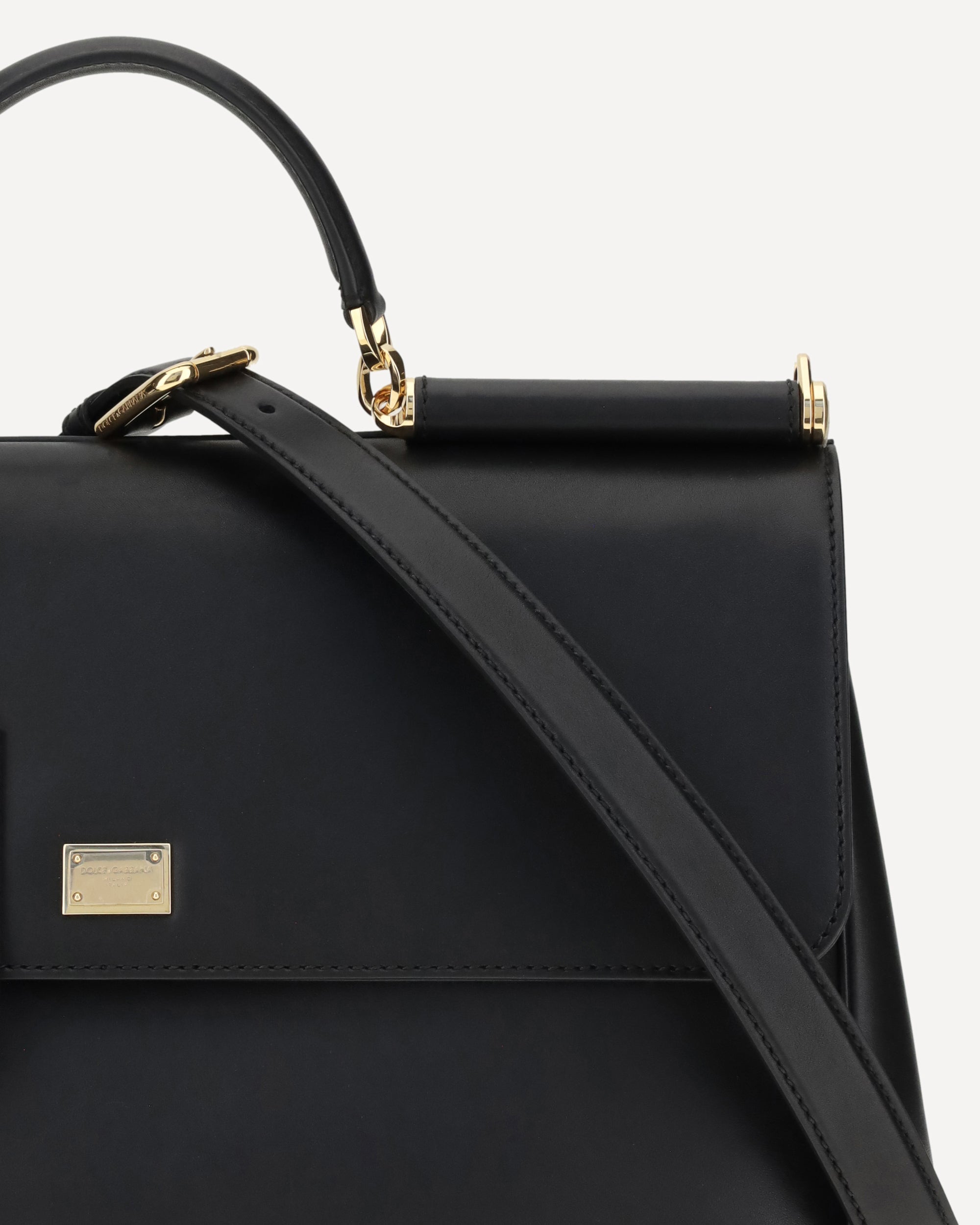 Dolce&Gabbana's My Sicily Handbag features leather handles and a removable and adjustable leather shoulder strap, offering versatility in carrying. It features a tuck-in closure with vintage brass electroplating details, enhanced by a monogalvanic tag and foil stamp. The interior is functional, with a zippered pocket and a flat pocket, perfect for organizing personal items in style.