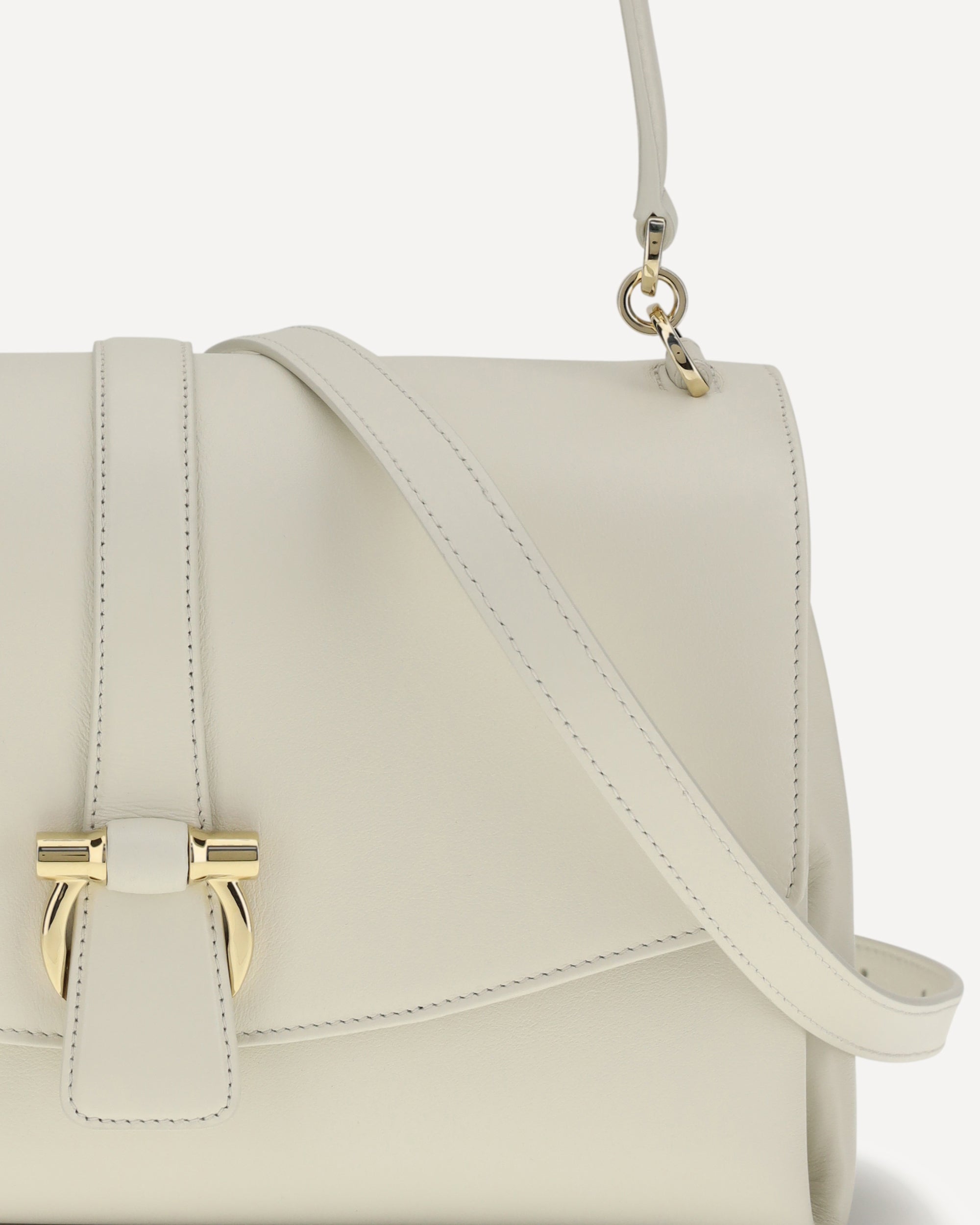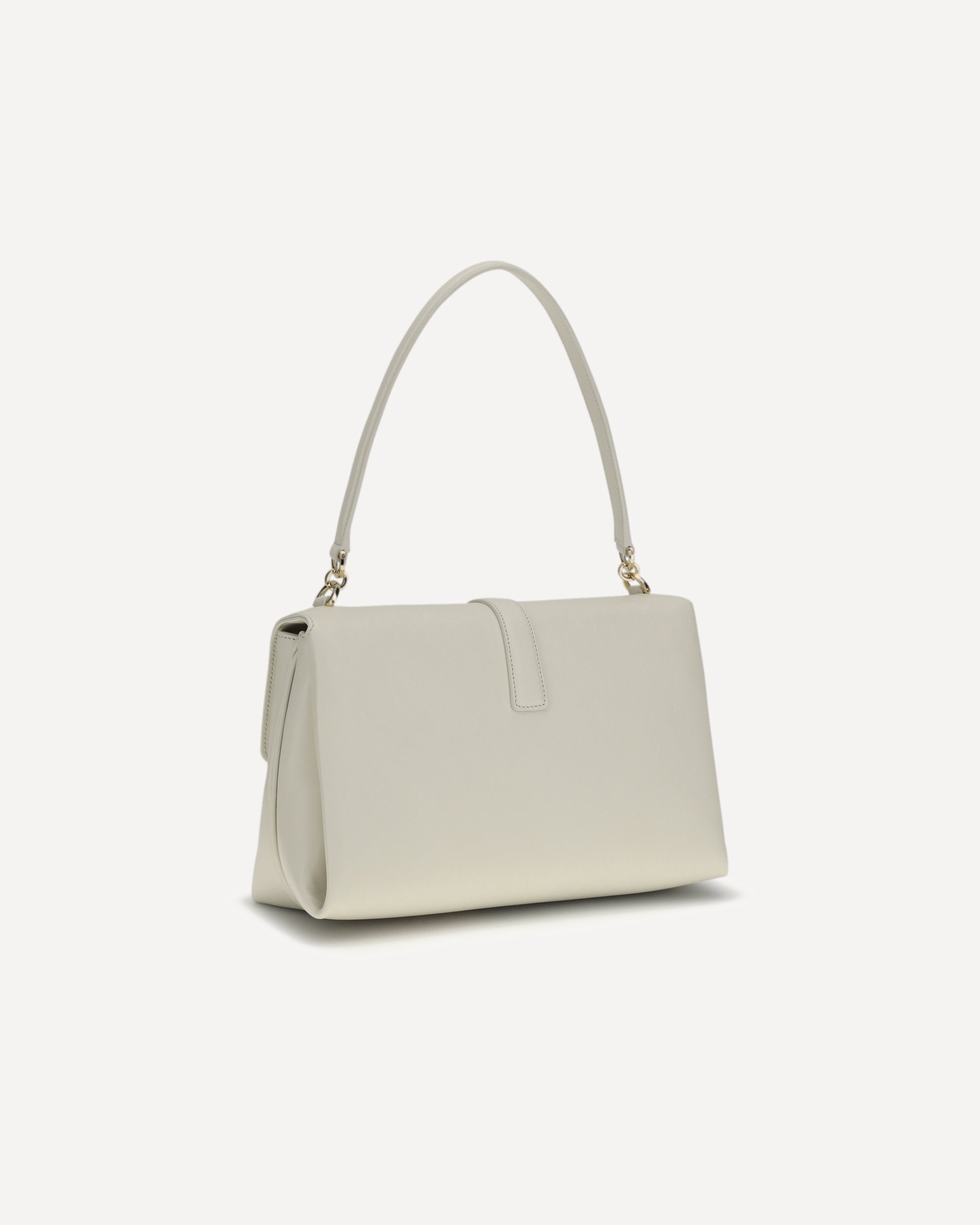 The leather Shoulder Bag by Ferragamo combining classic inspiration and contemporary style. The semi-rigid structure is softened by voluminous waves reminiscent of the shape of the Florentine lily. A wide leather shoulder strap slips into a gold hook on the front flap, an iconic touch that matches the gold finishes of the medium-length shoulder bag.