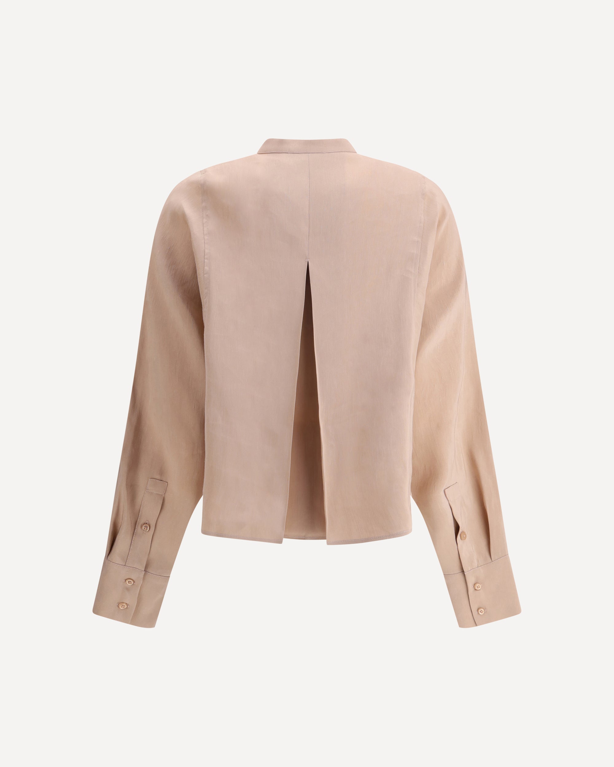 The Siara Shirt by LouLou De Saison is a piece that combines elegance and simplicity, with a refined yet modern design. Without a collar, it offers a minimalist look that highlights its clean silhouette. The front button closure maintains a classic look, while the wide sleeves add a touch of fluidity and comfort to the piece. The pleat on the back gives movement and a stylish detail that enriches the shirt. A versatile piece, ideal for pairing with both casual and more formal looks, which expresses the sophisticated simplicity of the brand.