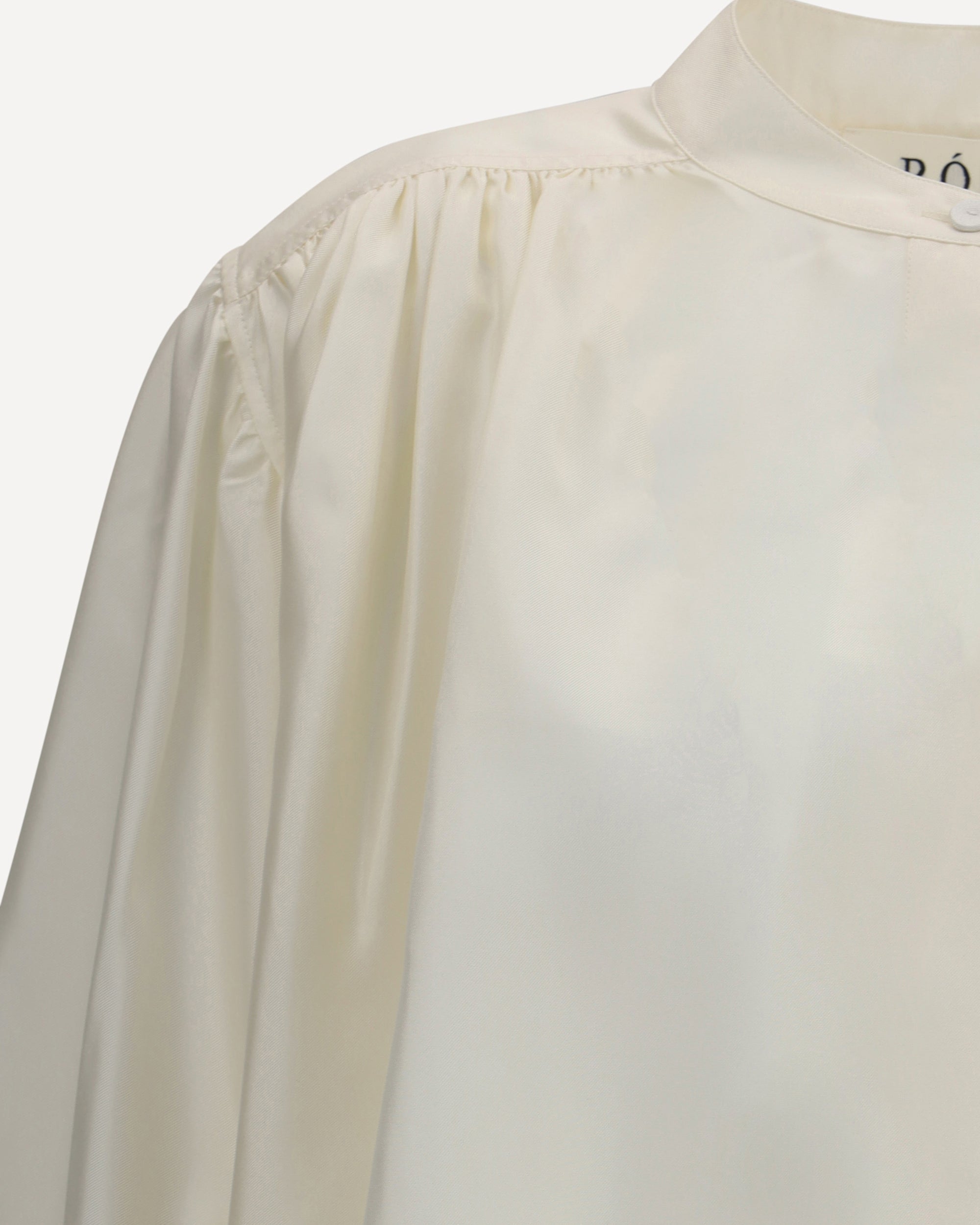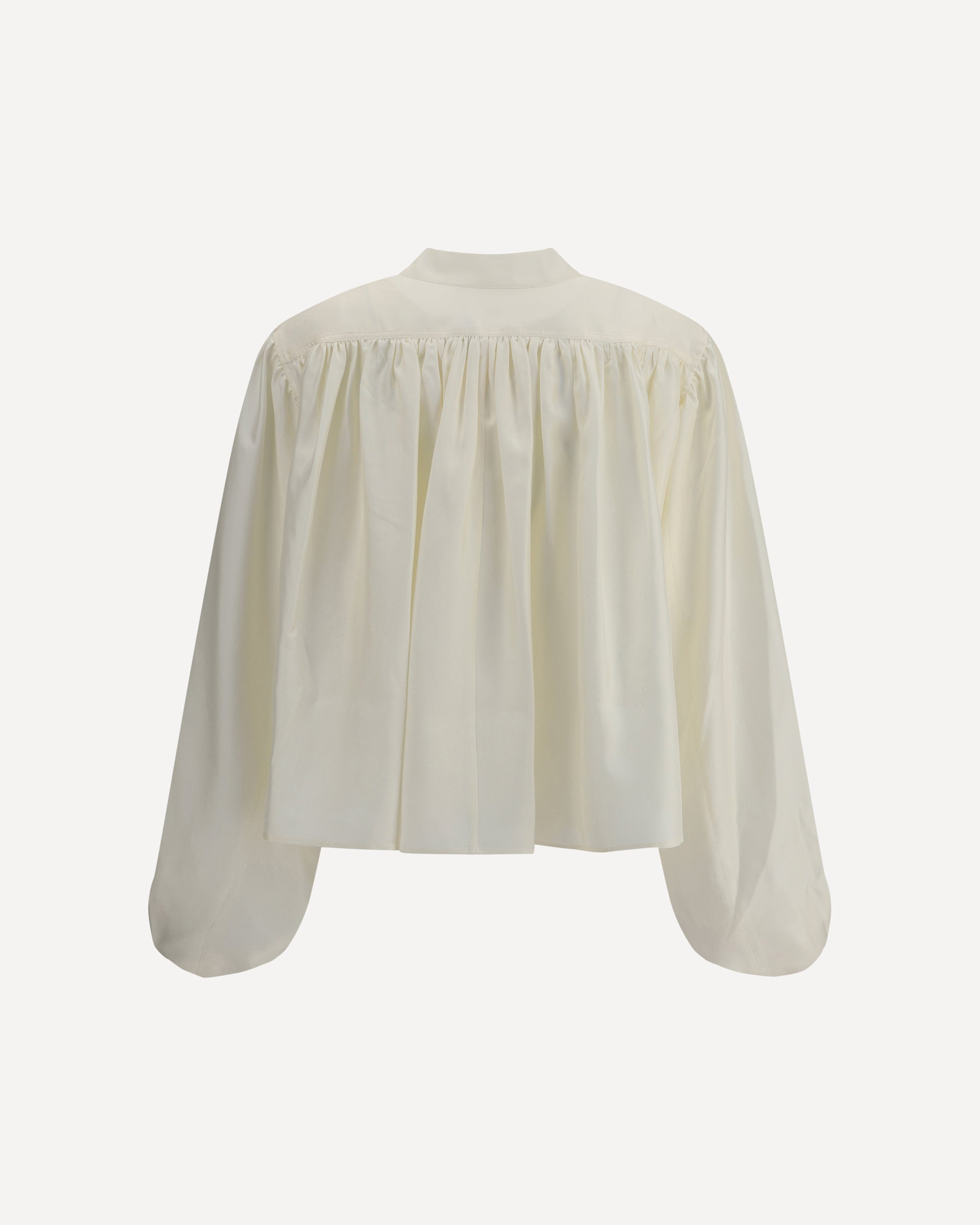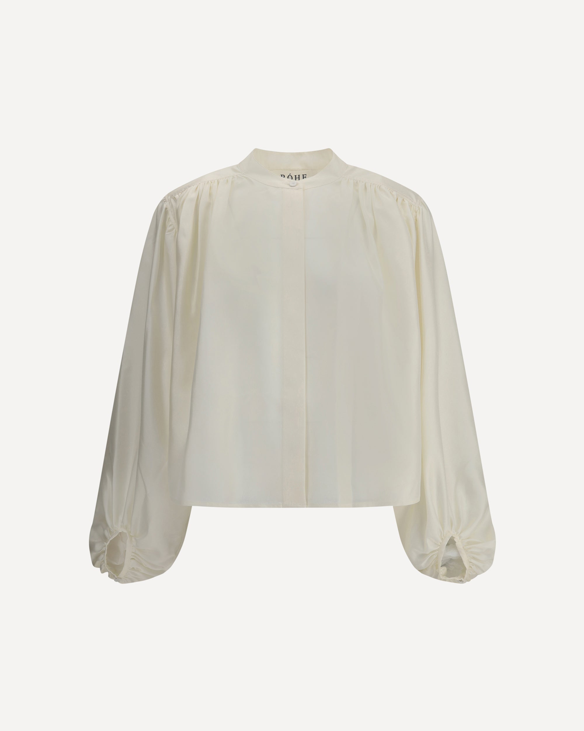 Rohe's Silk Blouse is an elegant and sophisticated piece featuring a unique and modern design. The asymmetrical closure with concealed buttons lends a touch of sophistication and discretion, while the wide balloon sleeves add volume and a very feminine draped effect. The mandarin collar completes the look with a clean and sophisticated detail. Made of silk, this blouse offers a soft and lightweight feel, perfect for those looking for a versatile garment that combines comfort and style.