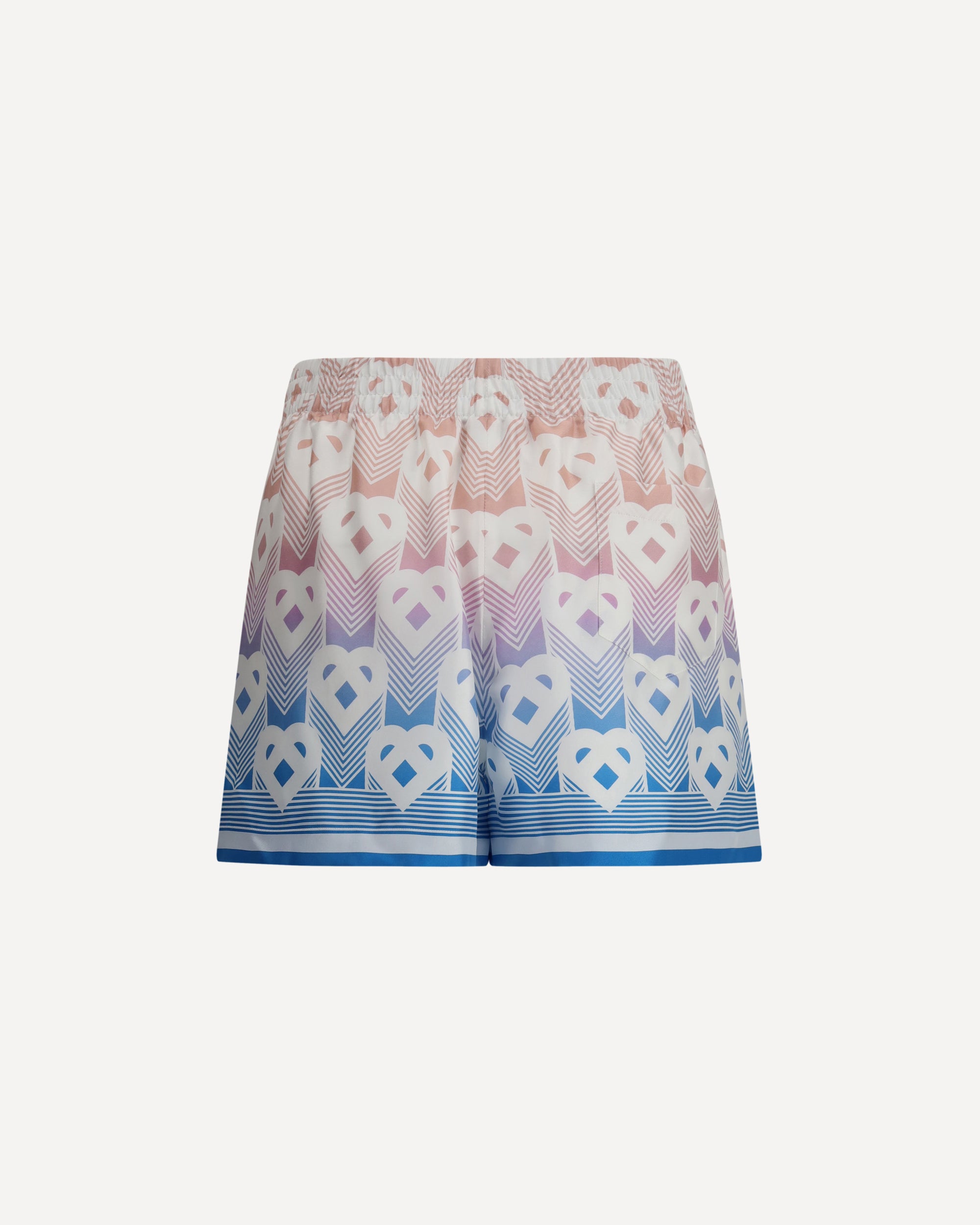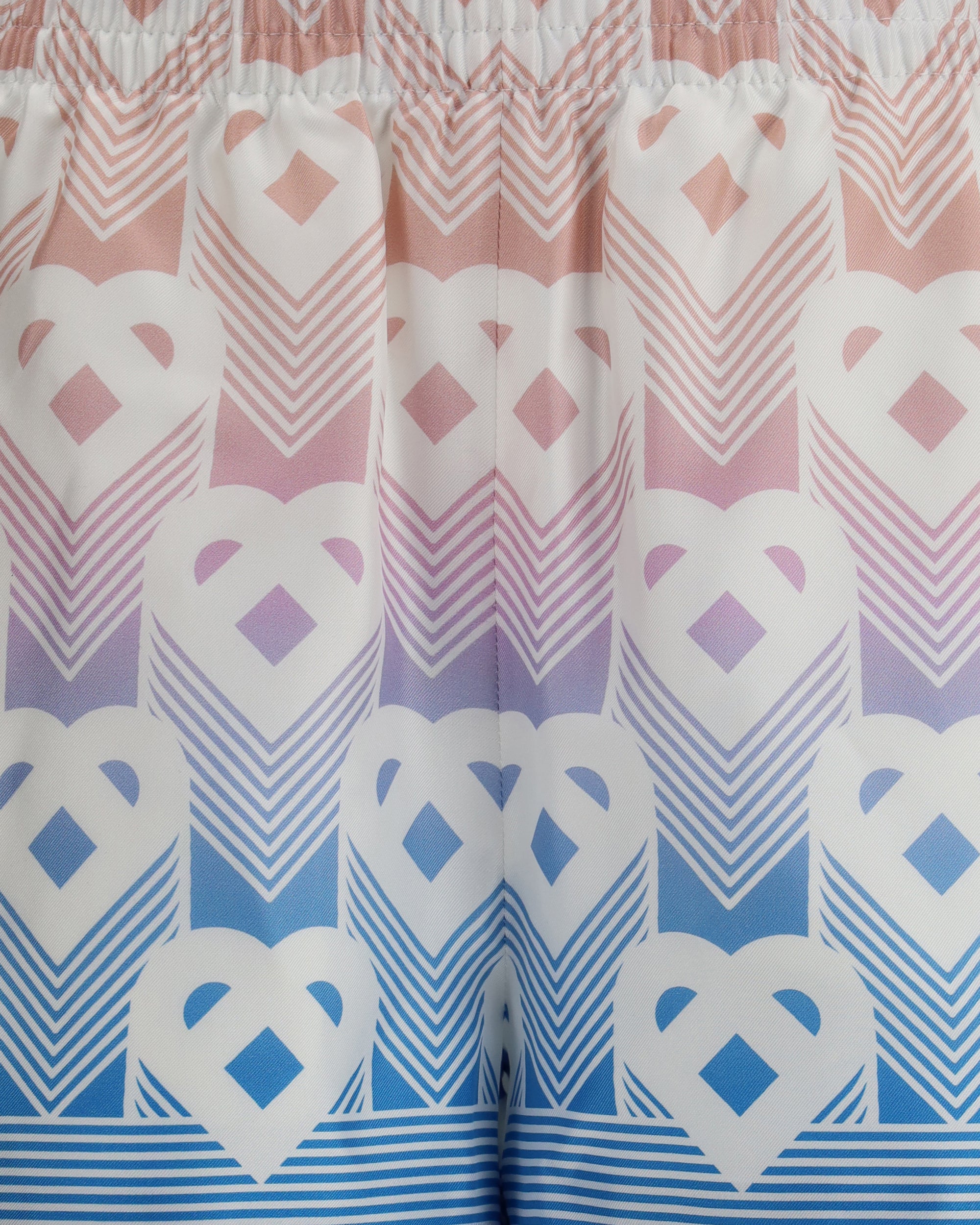 The Gradient Heart Shorts in printed silk twill with multicolored degradé heart monogram, elastic drawstring waist, back pocket and striped detailing on the hem make for a stylish and comfortable garment.